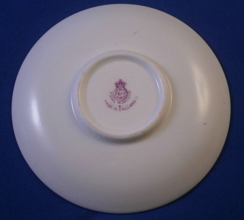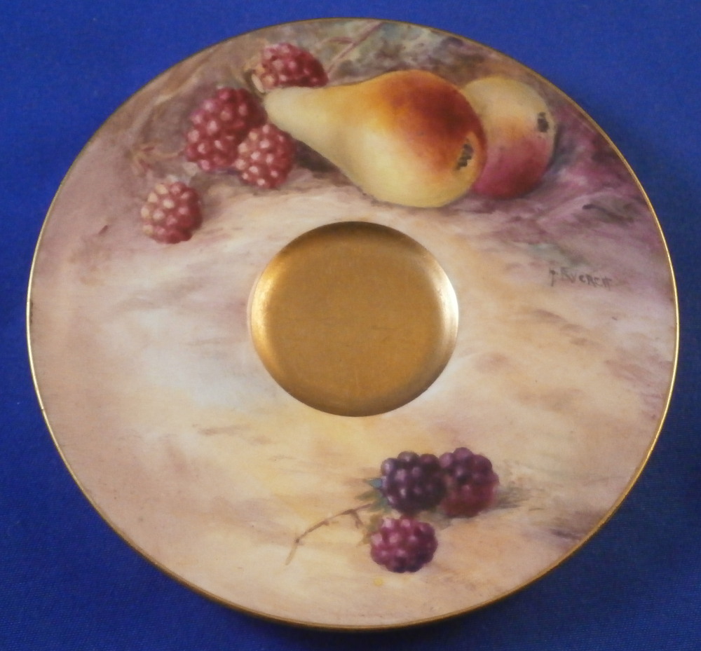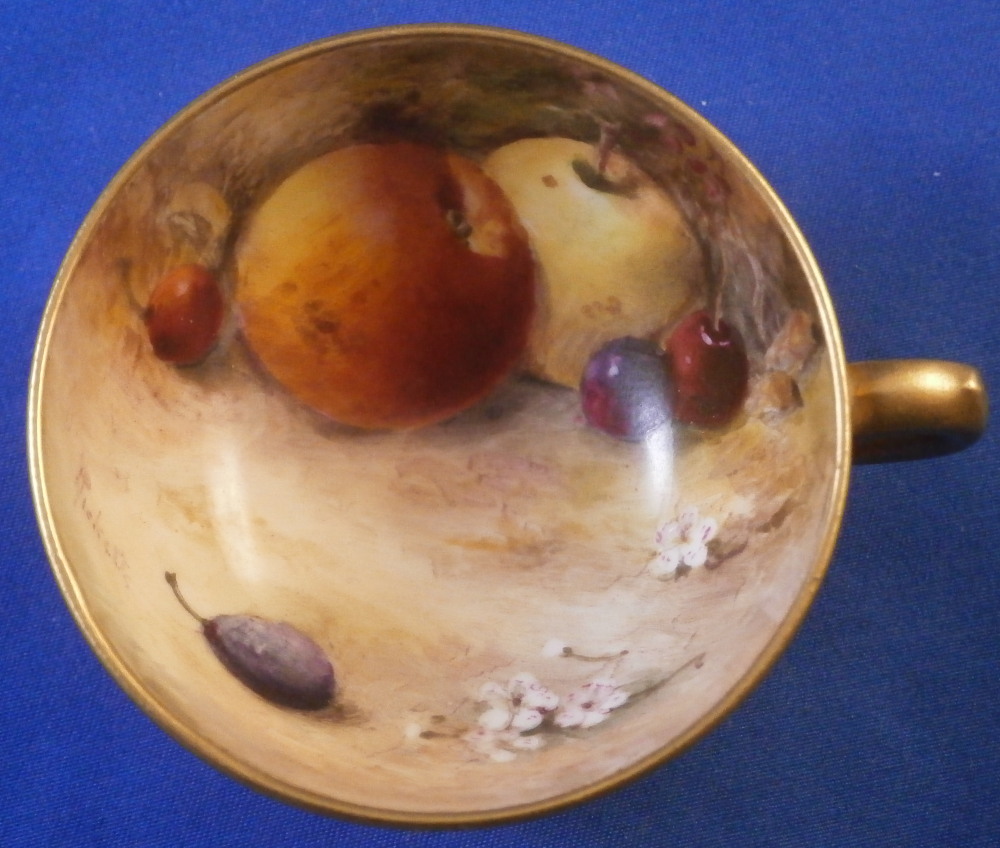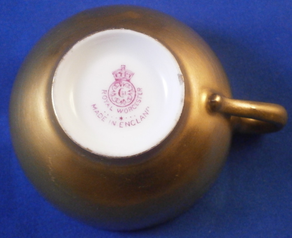 This is a superb demitasse / mocha or esperesso coffee cup and saucer set made by Royal Worcester in the 20th century - 1923 to be exact if I read the date code correctly. The top of the saucer and inside of the cup is hand painted with their famous fruit still life type design. The center of the saucer and outside of the cup is fully gilded. A really nice look and it remains popular with colelctors even today! Both pieces are signed by the artist - Everett for the saucer and Ricketts for the cup. William Ricketts (1862-1939) was one of the first of the classic 'Painted Fruit' artists at Royal Worcester. Hilda Everett usually did not paint fruit but only called upon to paint fruit when the department was overrun with orders, and even then, she was supposed to sign with a pseudonym. Obviously she wanted to show off that as a woman she was just as capable as the men :) Makes this set a bit more special! The cup and saucer are in great condition with some very minor use marks to the gilding, some crazing to the white on the underside of the saucer (a normal issue) and a tiny chip to the foot ring of the cup as shown which does not impact it when on displays and the set displays perfectly! Both are marked with the puce Worcester mark underneath as shown with a * and dots as the date code. The cup is just under 1.365 inches tall and has a diameter of 2.375 inches. The saucer is 0.5 inches tall with a diameter of 3.75 inches. Please email me for more information or other pictures.
