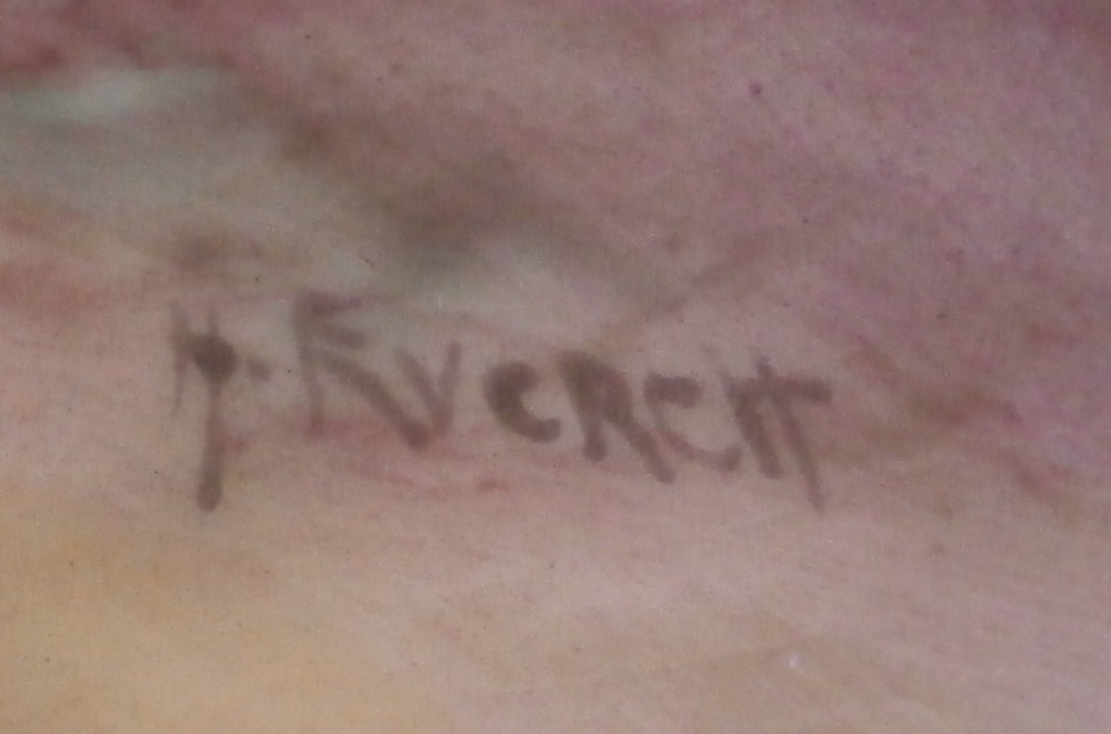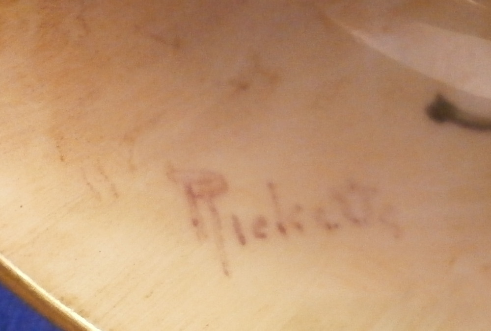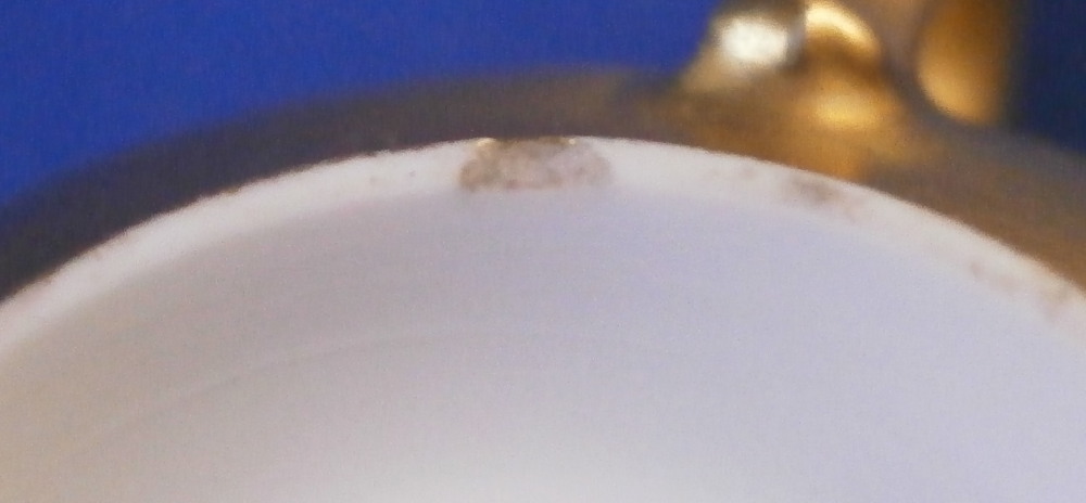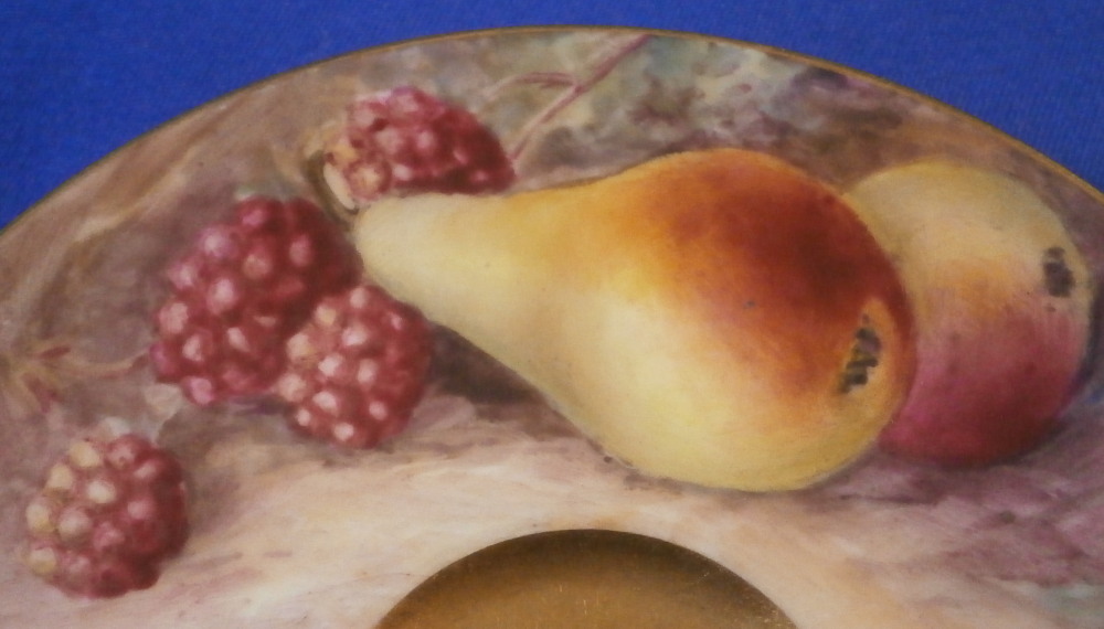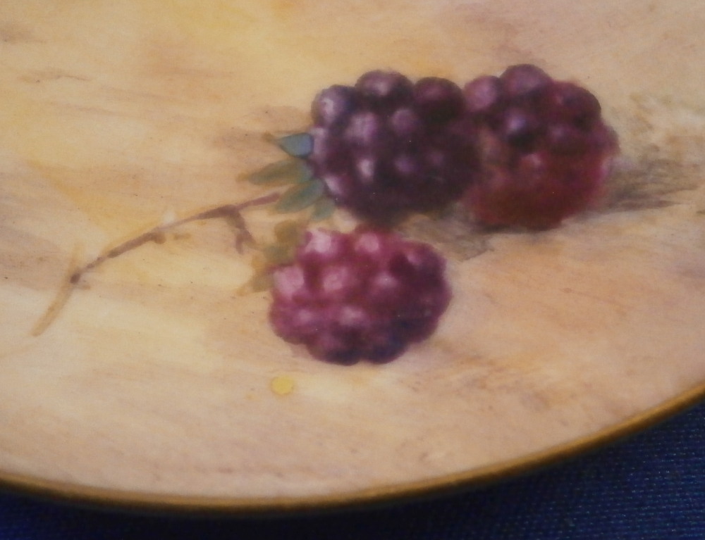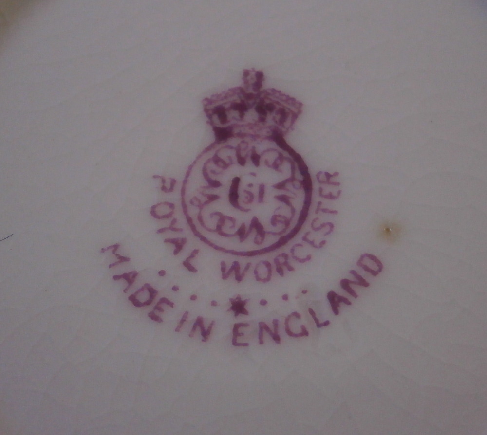 This is a superb demitasse / mocha or esperesso coffee cup and saucer set made by Royal Worcester in the 20th century - 1923 to be exact if I read the date code correctly. The top of the saucer and inside of the cup is hand painted with their famous fruit still life type design. The center of the saucer and outside of the cup is fully gilded. A really nice look and it remains popular with colelctors even today! Both pieces are signed by the artist - Everett for the saucer and Ricketts for the cup. William Ricketts (1862-1939) was one of the first of the classic 'Painted Fruit' artists at Royal Worcester. Hilda Everett usually did not paint fruit but only called upon to paint fruit when the department was overrun with orders, and even then, she was supposed to sign with a pseudonym. Obviously she wanted to show off that as a woman she was just as capable as the men :) Makes this set a bit more special! The cup and saucer are in great condition with some very minor use marks to the gilding, some crazing to the white on the underside of the saucer (a normal issue) and a tiny chip to the foot ring of the cup as shown which does not impact it when on displays and the set displays perfectly! Both are marked with the puce Worcester mark underneath as shown with a * and dots as the date code. The cup is just under 1.365 inches tall and has a diameter of 2.375 inches. The saucer is 0.5 inches tall with a diameter of 3.75 inches. Please email me for more information or other pictures.