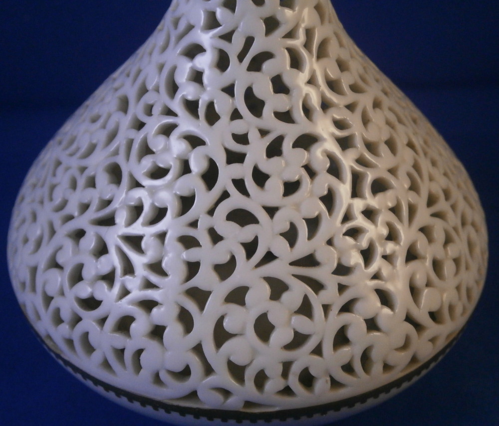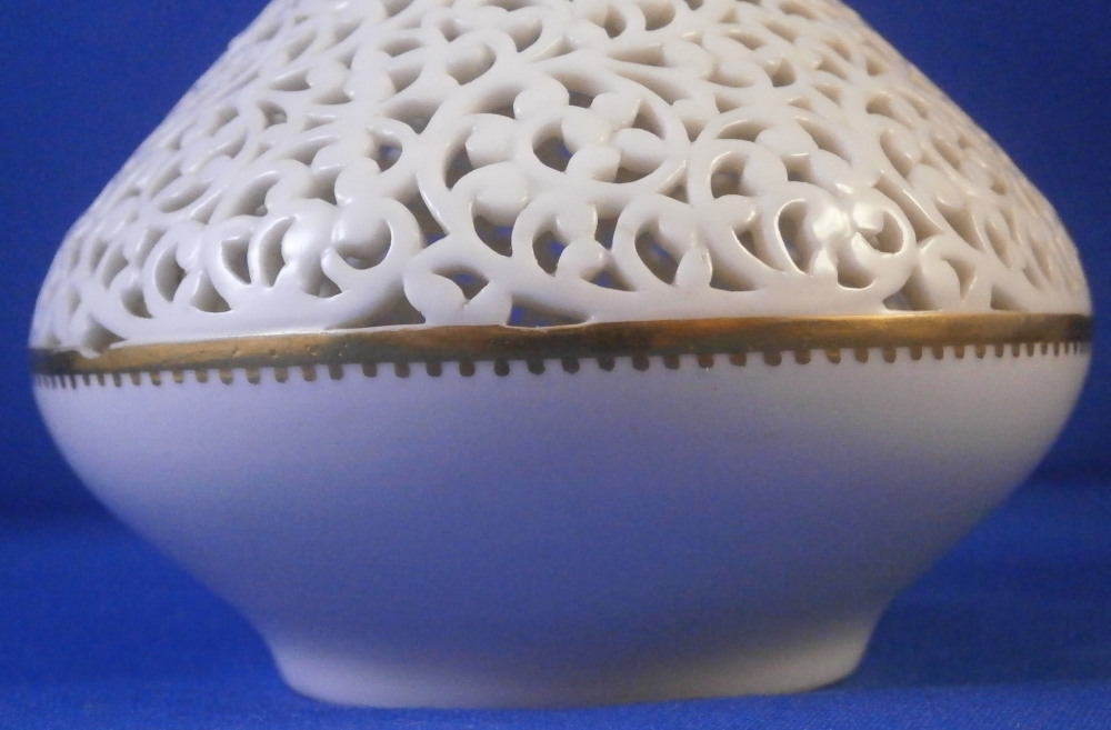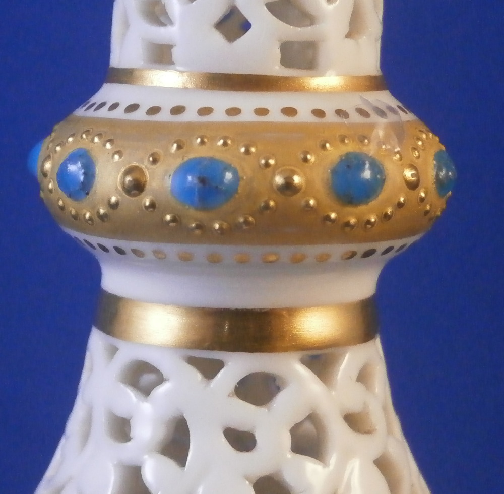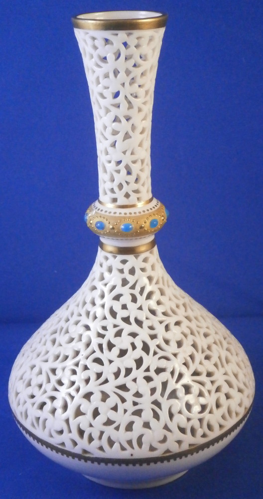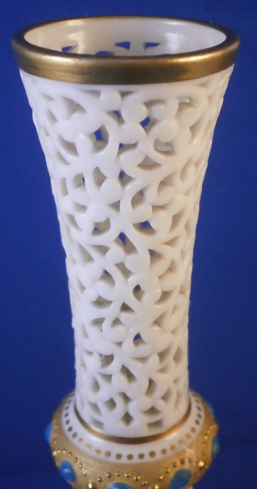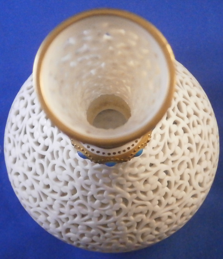This is a superb vase made by Grainger / Worcester around 1880. The vase has a nice shape to it and is actually usable unlike many other of the reticulated pieces. The bottom of the vase is solid porcelain and about half way up the large bulbous part the reticulation starts and goes all the way to the top edge except for a decorative part between the main body and next that is decorated with some nice gilding, some of which is raised and superb turquoise " jewels ". Make sthe piece look really elegant! The piece is in perfect condition which always helps :) It is 6.375 inches tall and about 3.5 inches at the widest. The top is about 1.125 inches in diameter. It is marked underneath with the red numbers 1 over 1386 as well as their brown shield mark as shown. A truly superb little vase! Please email me for more information or other pictures.