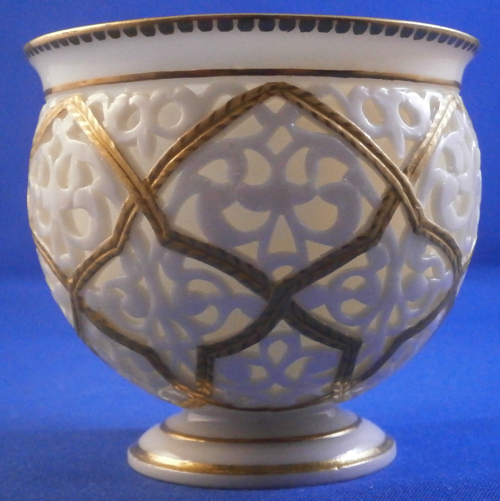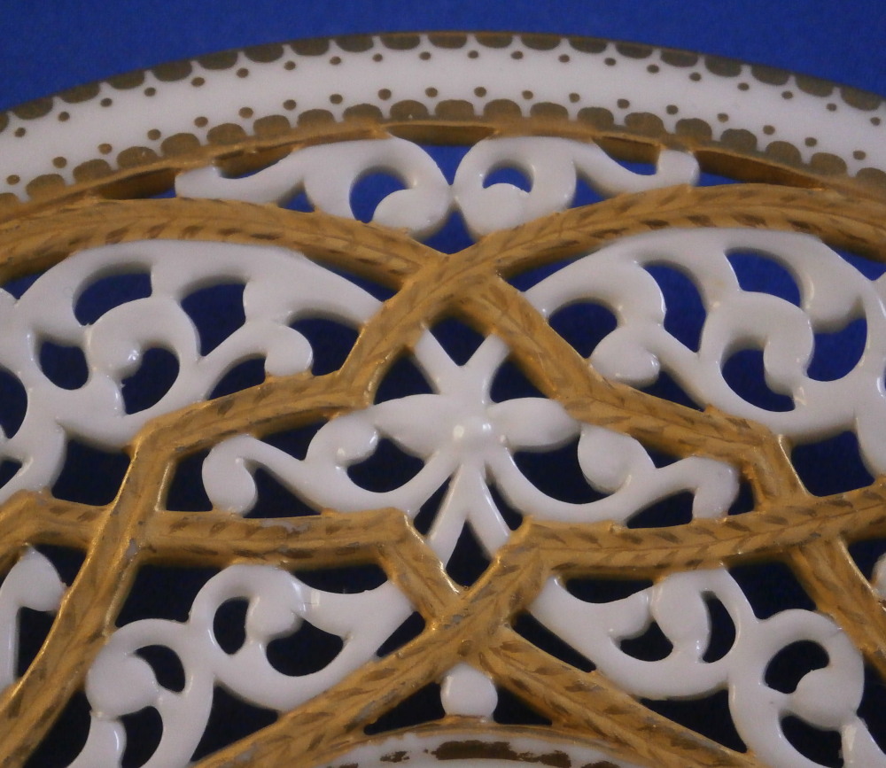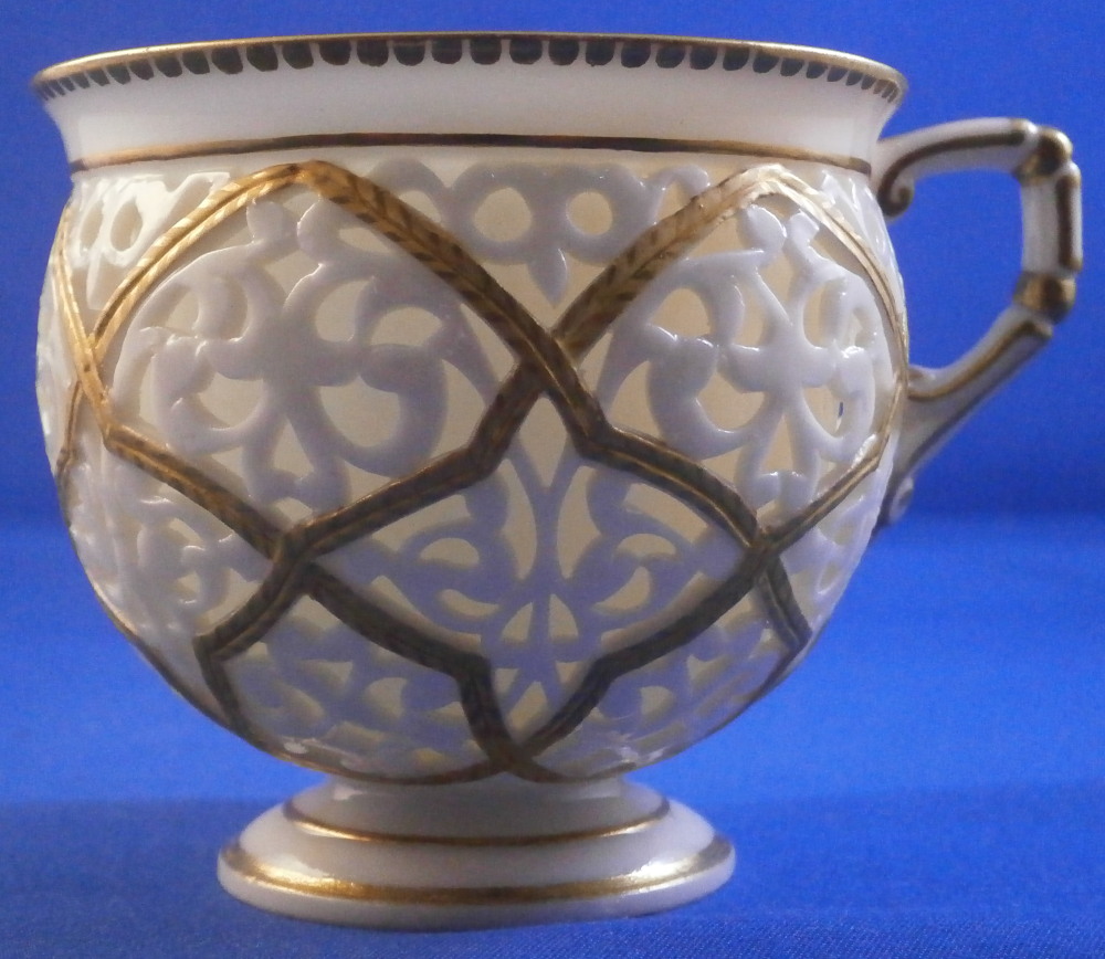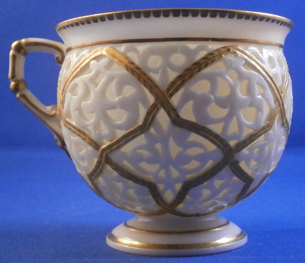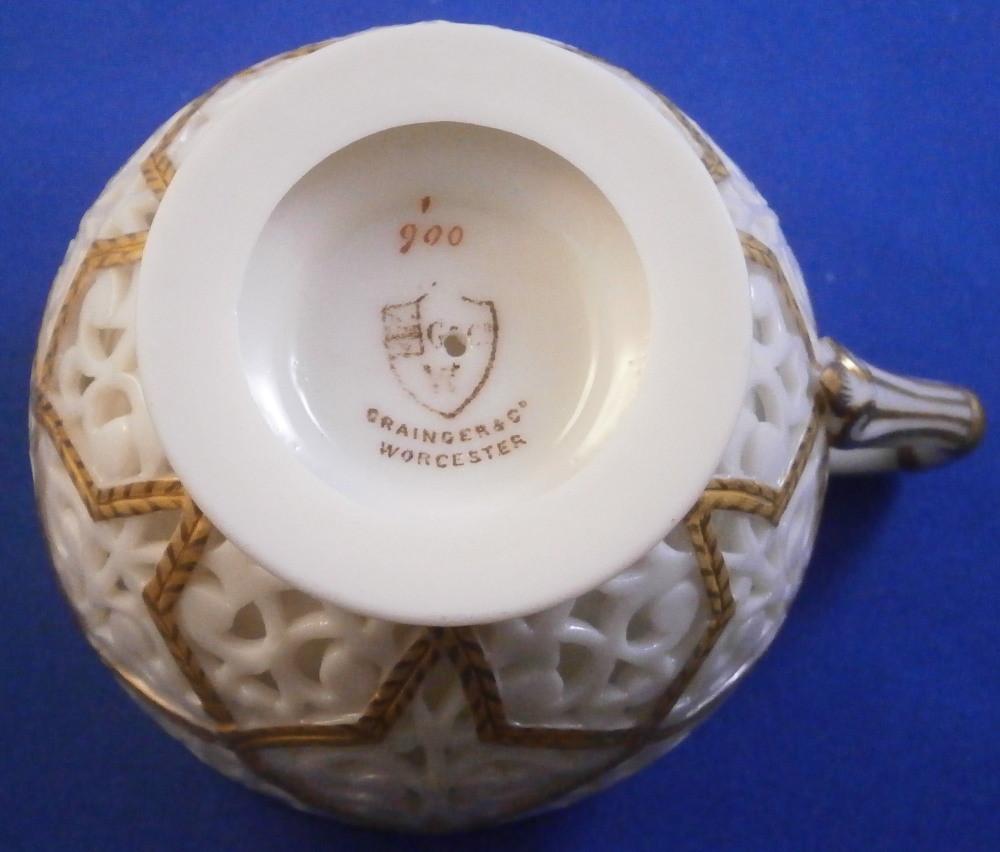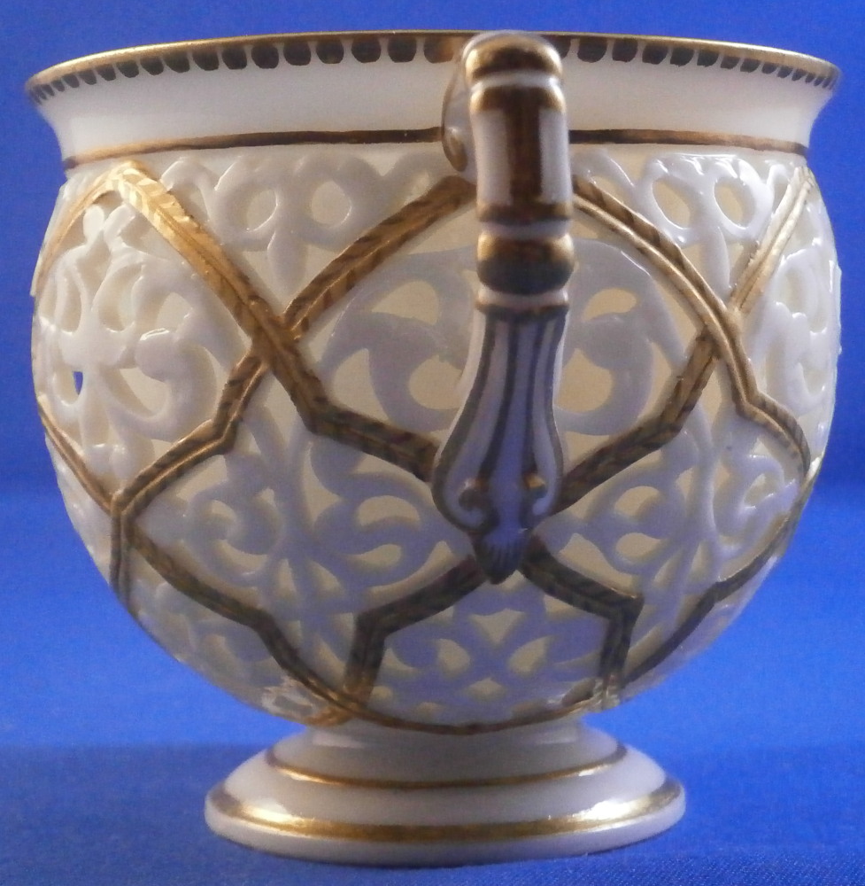 This is an amazing reticulated cup and saucer made by Worcester about mid to later 19th century during the Grainger period. The saucer is reticulated and the cup is double walled with the outside wall also being reticulated. Not something you see often at all and very few makers made reticulated cups! I can only think of Sevres and a Chinese pieces I ahve owned before. .The reticulation is very intricate and the gilded band throughout makes it look very fancy! A bit of gold trim to the edges as well as a nice handle shape make this a very elegant set! The set is in superb condition with just some gold wear around the edge of teh well where the cup sits. They display perfectly! The saucer is 0.5 inches tall with a diameter of 5.25 inches. The cup is 2.5 inches tall and 2.75 inches in diameter. The saucer is unmarked while the cup has the a red numbers 1 over 900 as shown as well as the brown shield mark with Grainger & Co. Worcester underneath it. Please email me for more information or other pictures.