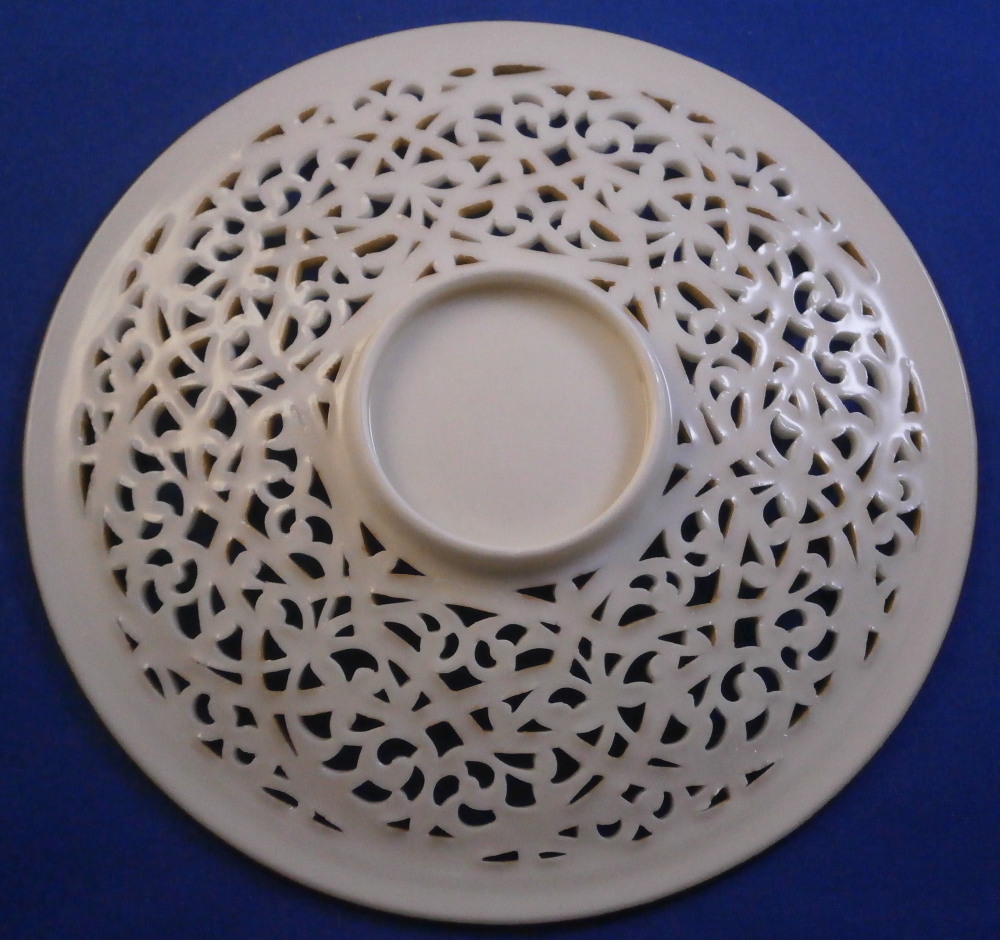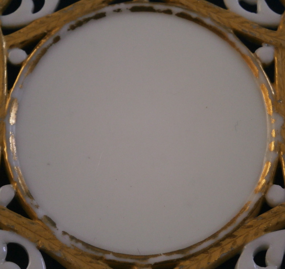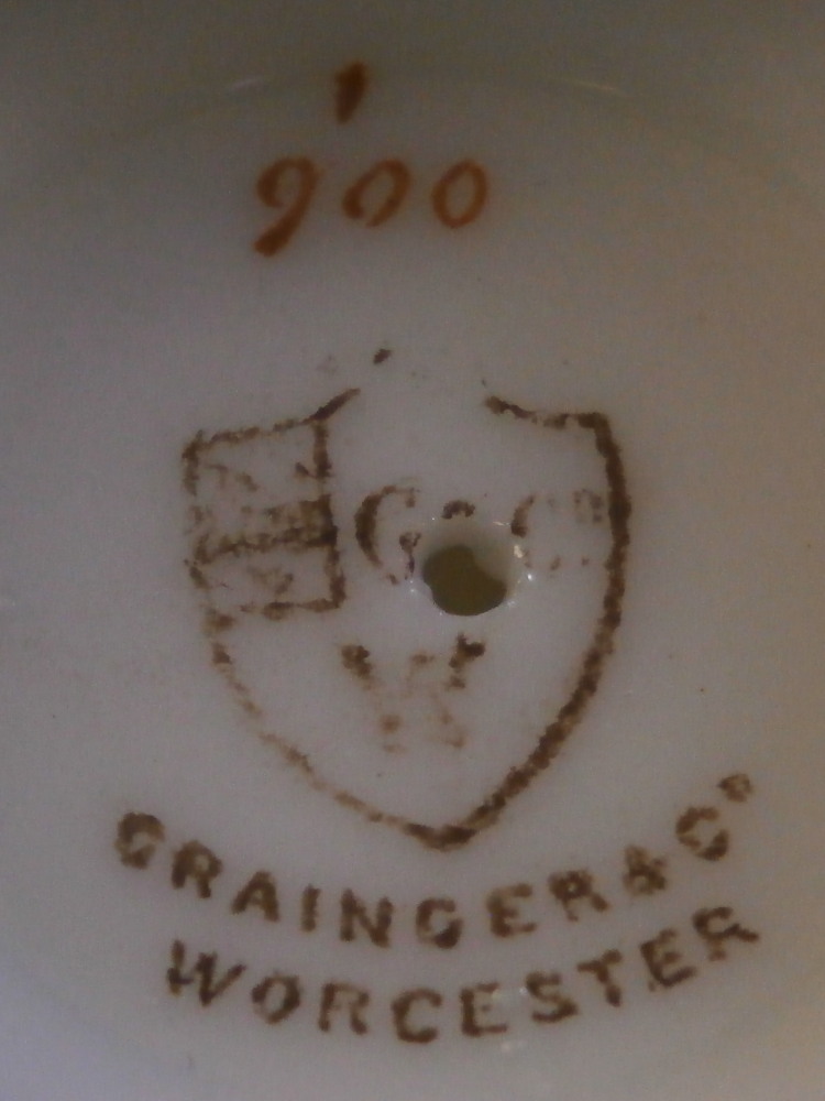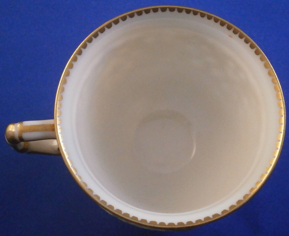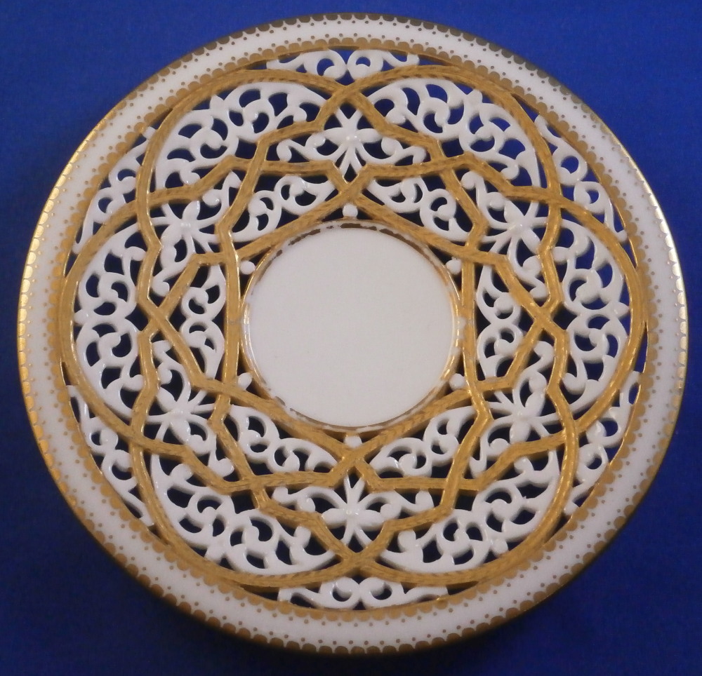 This is an amazing reticulated cup and saucer made by Worcester about mid to later 19th century during the Grainger period. The saucer is reticulated and the cup is double walled with the outside wall also being reticulated. Not something you see often at all and very few makers made reticulated cups! I can only think of Sevres and a Chinese pieces I ahve owned before. .The reticulation is very intricate and the gilded band throughout makes it look very fancy! A bit of gold trim to the edges as well as a nice handle shape make this a very elegant set! The set is in superb condition with just some gold wear around the edge of teh well where the cup sits. They display perfectly! The saucer is 0.5 inches tall with a diameter of 5.25 inches. The cup is 2.5 inches tall and 2.75 inches in diameter. The saucer is unmarked while the cup has the a red numbers 1 over 900 as shown as well as the brown shield mark with Grainger & Co. Worcester underneath it. Please email me for more information or other pictures.