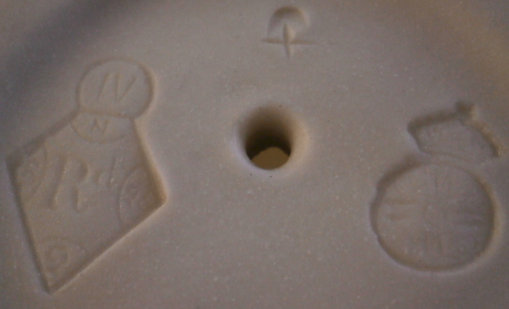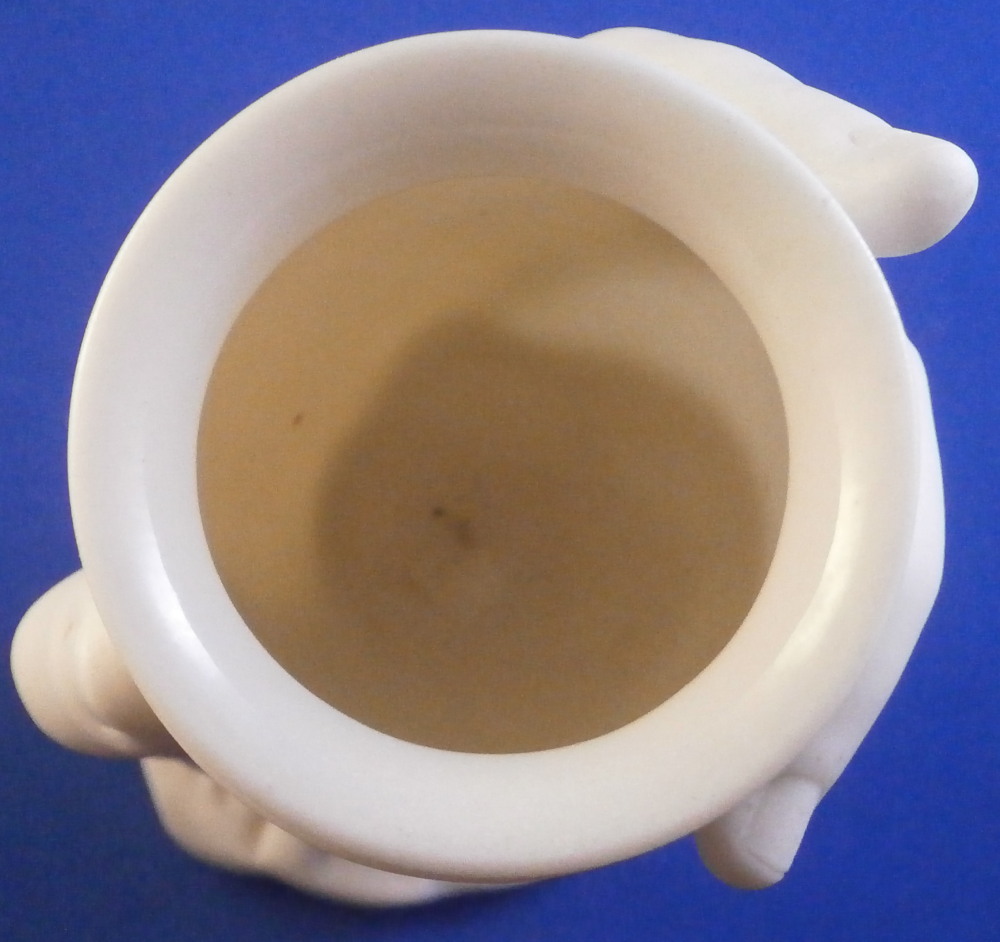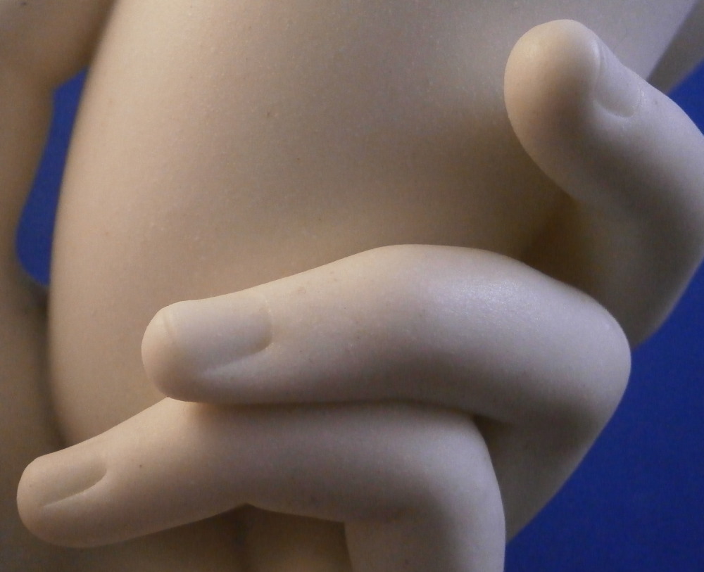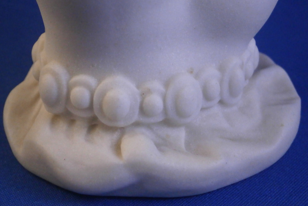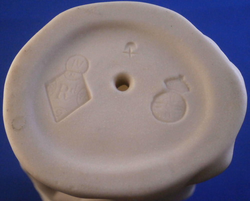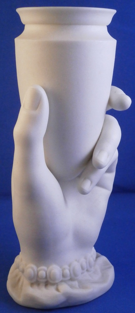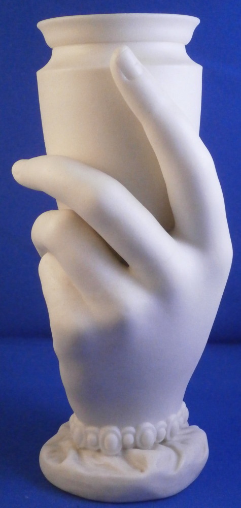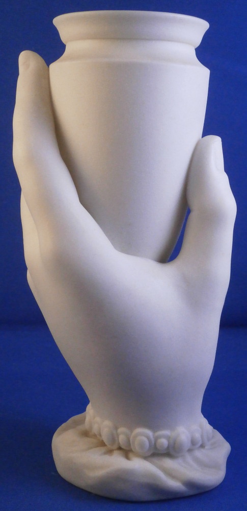This is a really fun figural vase made of unglazed Parian porcelain by Worcester in the mid 19th century. First designed by the famous James Hadley in 1864, legend has it that he used his own wife's hand as the model. The piece is superbly modeled with the hand holding an urn type vase in its fingers, a bracelet around the bottom with the sleeve of her shirt showing just a touch as the base. A really nice vase that comes in many different decorations. This one here is unglazed on the outside with the inside of the vase part being glazed so it can be used. The piece is in perfect condition and is marked underneath with the impressed Worcester circular mark with a crown above it as shown as well as the registration mark and a plus mark type mark. Cannot make out the number in the registration mark but since it is a number it would mean this piece is from that original perod after it was first designed sicne that changed to letters in 1868. The entire piece is 6.125 inch tall, 2.875 inches wide and 2.5 inches deep. The vase part is about 3.625 inches tall with a diameter of just under 2.125 inches at the top. Please email me for more information or other pictures.