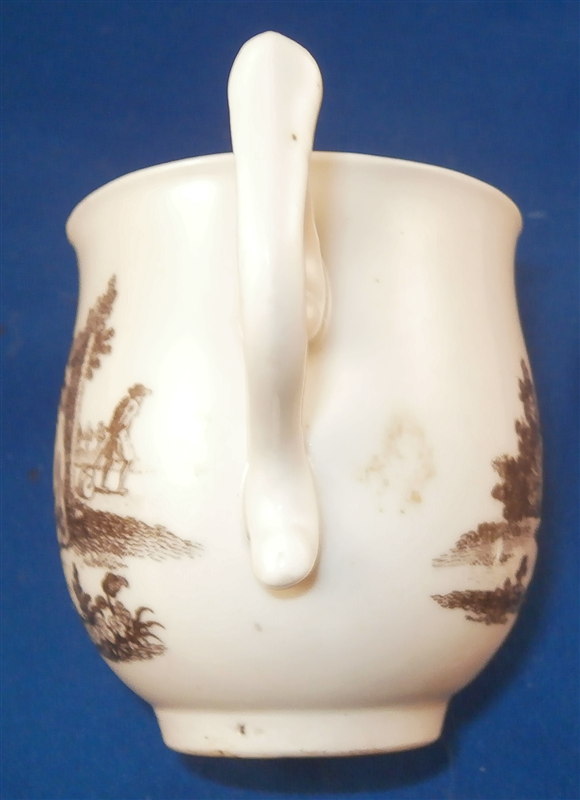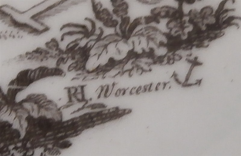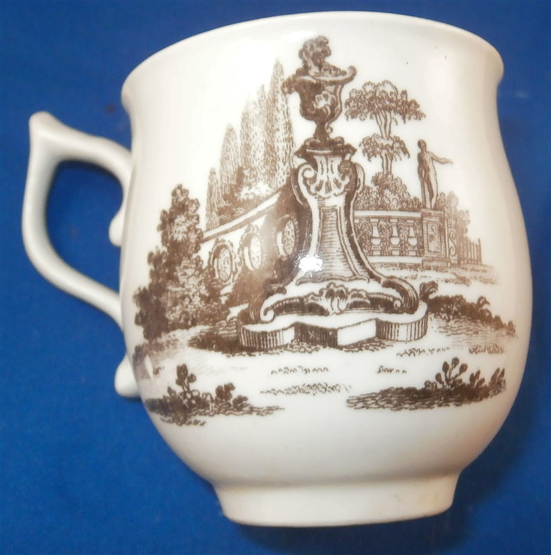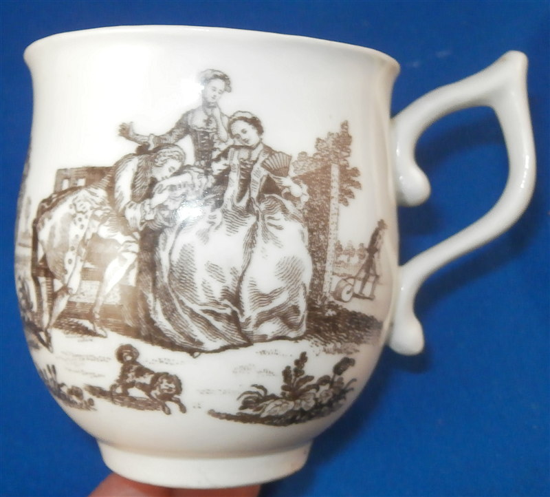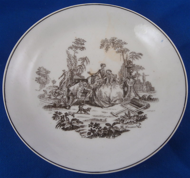 This is a great cup and saucer made by Worcester around 1762. Both are decorated with Hancock's L'Amour pattern prints in black which are very nice. The cup has a bell shape to it and has the rare wishbone handle. It is has the print including a gardener with roller with the backside having the Garden Statuary print to it. Black line around the edge. The saucer has the print with a rococo urn on it as well as the roller on the ground below. The set is unmarked but the print on the saucer has RH Worcester and an anchor in the print. Nice thin porcelain with a green translucency. The set is in superb condition with a small flaw to the porcelain in the backside print of the cup, a small spot of staining near the bottom handle of the cup and some staining to the saucer by the tree on the right side. Probably from the firing process (and definitely not some sort of restoration!). The cup is 2.25 inches tall and has a diameter of 2.125 inches. The saucer is 0.875 inches tall and 4.625 inches in diameter. Please email me for more information or other pictures.