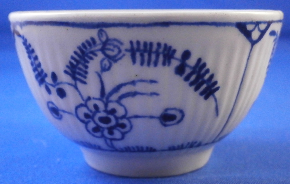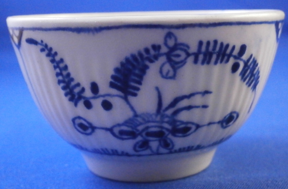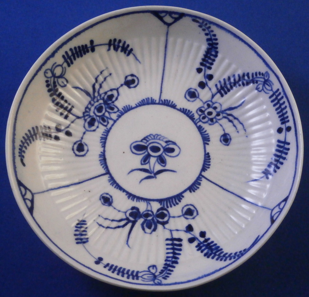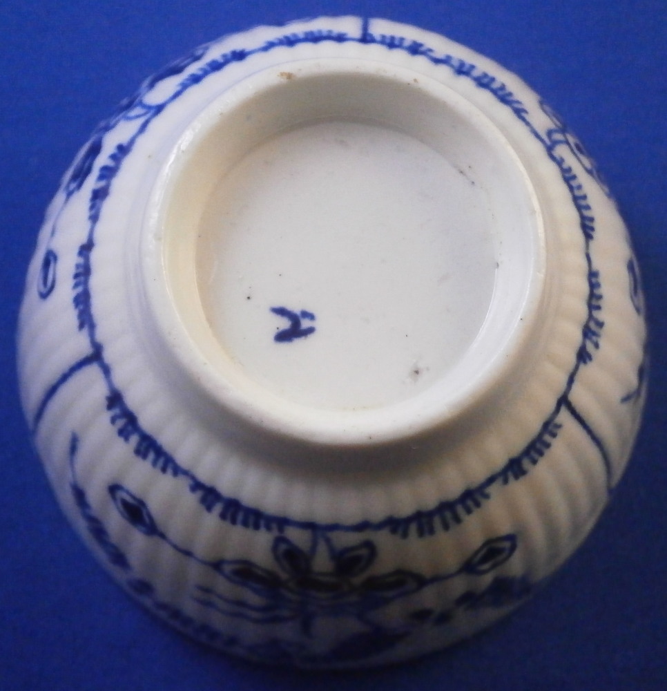 This is a nice cup and saucer made by Worcester in the 18th century. The set is hand painted in under glaze blue with a version of a strawflower pattern with a ribbed design to the paste. Very much like German pieces from the Thuringia area! I think they call it Immortelle pattern. Not a design you see too often and this is a small cup and saucer (possibly for a child ) so it looks great and is easy to display. Being hand painted is also a bonus as many of their wares were printed. I especially like the flower to the bottom inside of the cup! Both the cup and the saucer are in superb condition. No real issues but there is the occasional black firing spot normal to these early wares. The cup and saucer are each marked with a hand painted open blue crescent mark as shown. a bit messy but you can recognize it with a bit of imagination :) The cup is 1.375 inches tall and 2.5 inches in diameter. The saucer is 0.875 inches tall and 4.125 inches in diameter. Please email me for more information or other pictures.