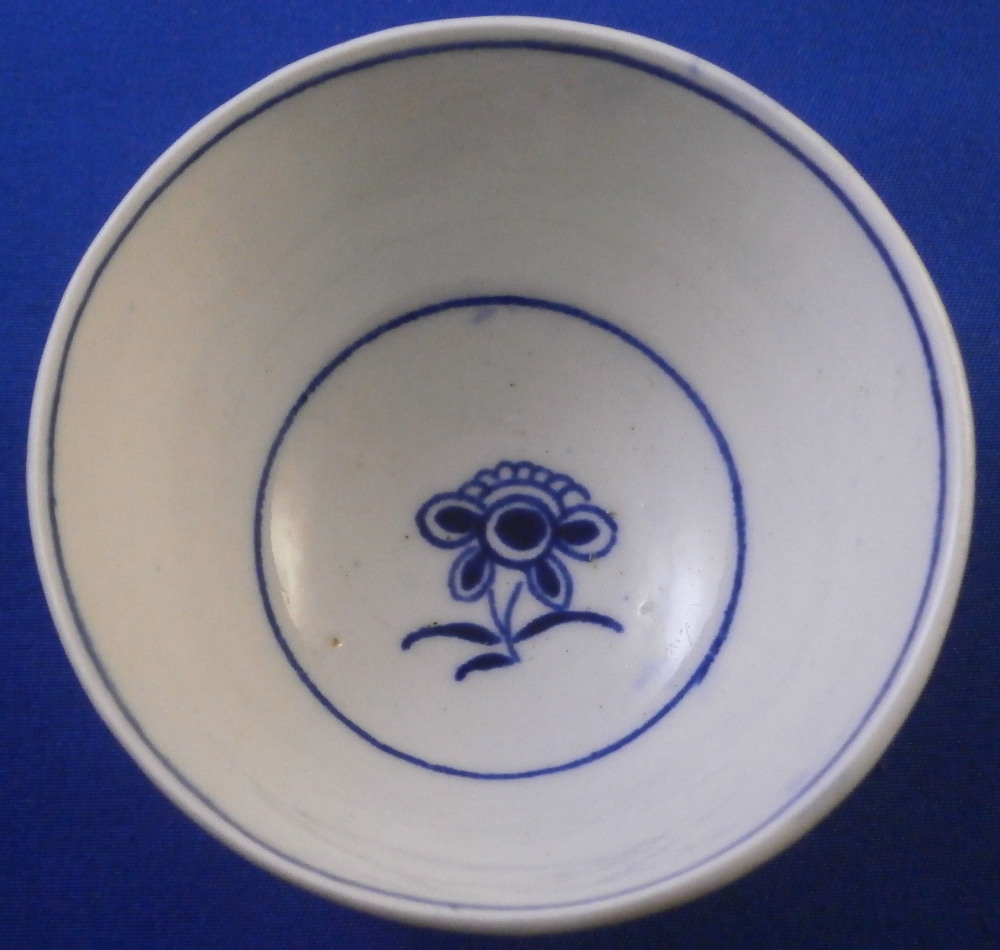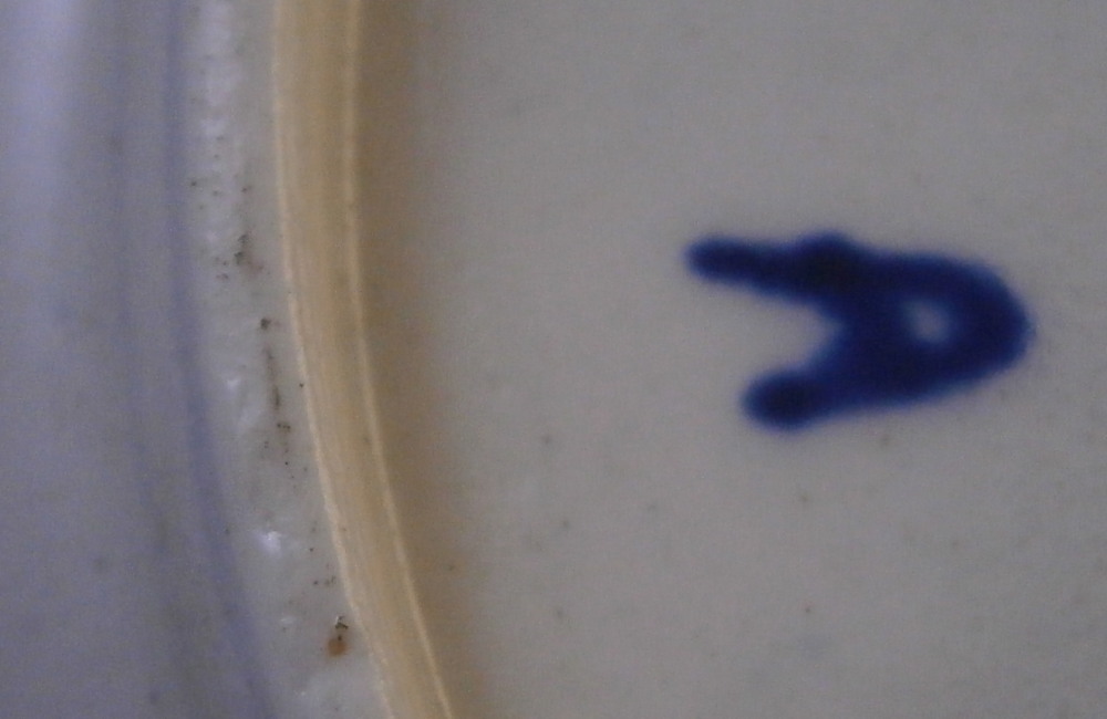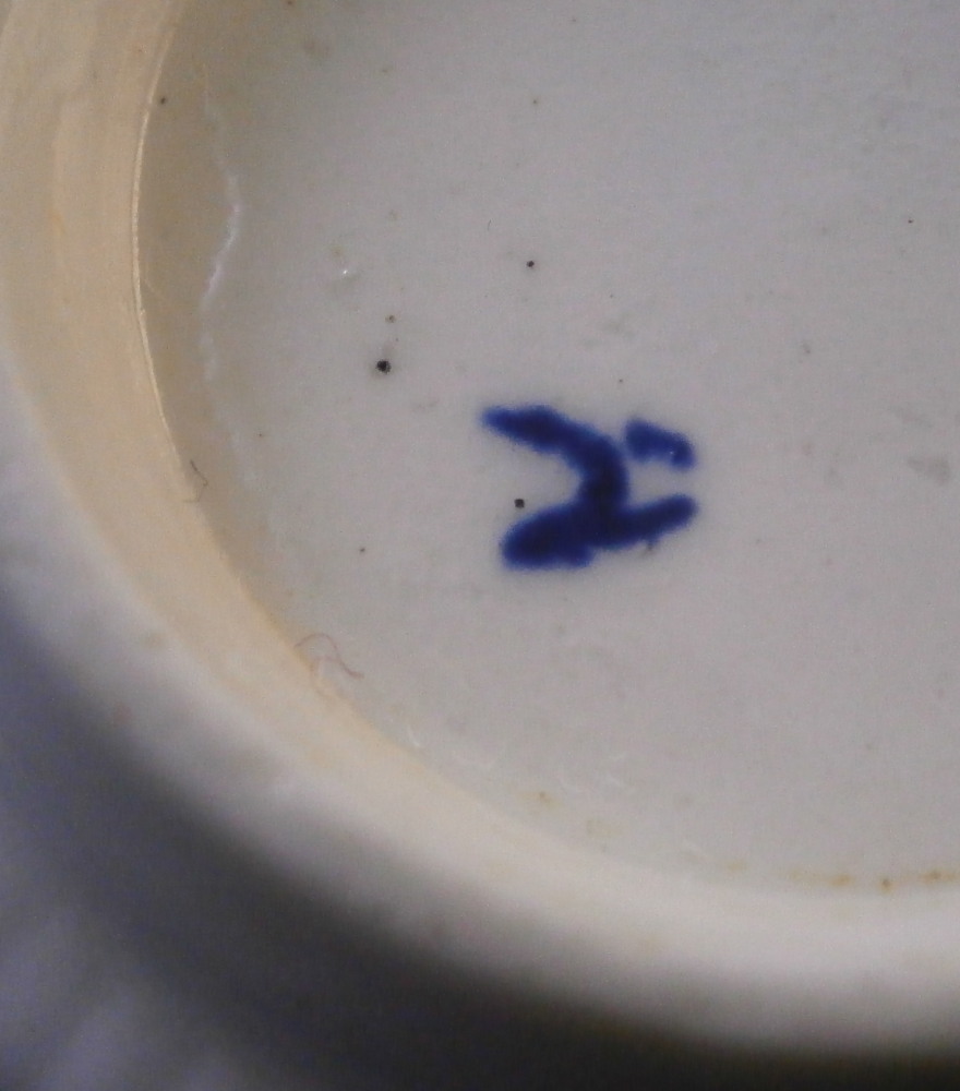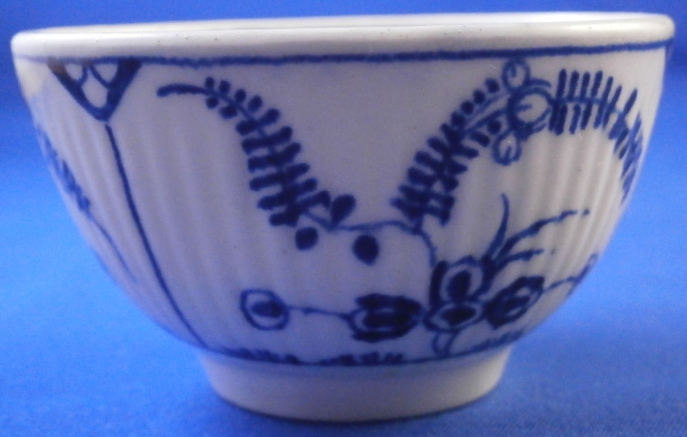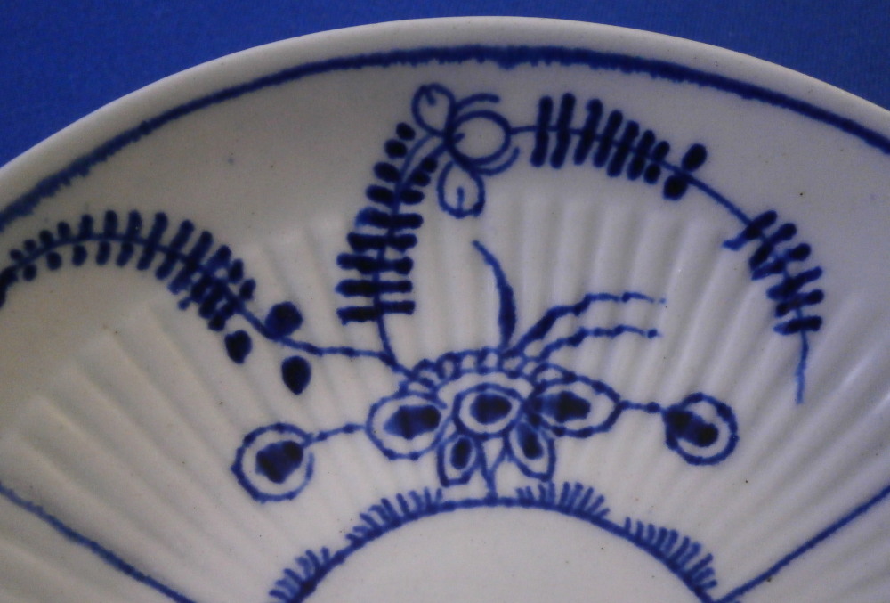 This is a nice cup and saucer made by Worcester in the 18th century. The set is hand painted in under glaze blue with a version of a strawflower pattern with a ribbed design to the paste. Very much like German pieces from the Thuringia area! I think they call it Immortelle pattern. Not a design you see too often and this is a small cup and saucer (possibly for a child ) so it looks great and is easy to display. Being hand painted is also a bonus as many of their wares were printed. I especially like the flower to the bottom inside of the cup! Both the cup and the saucer are in superb condition. No real issues but there is the occasional black firing spot normal to these early wares. The cup and saucer are each marked with a hand painted open blue crescent mark as shown. a bit messy but you can recognize it with a bit of imagination :) The cup is 1.375 inches tall and 2.5 inches in diameter. The saucer is 0.875 inches tall and 4.125 inches in diameter. Please email me for more information or other pictures.