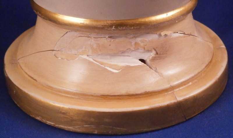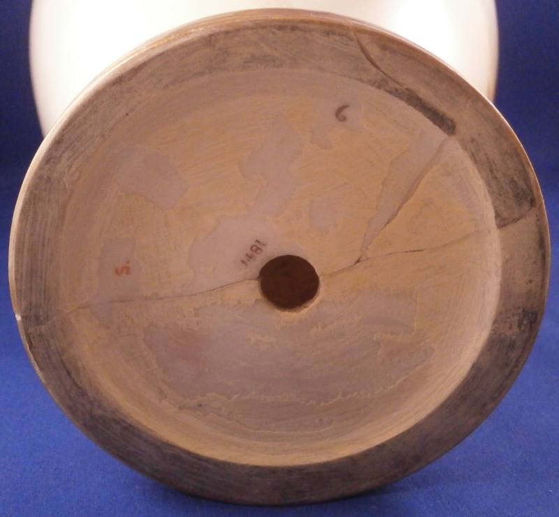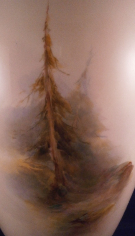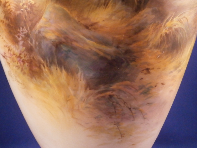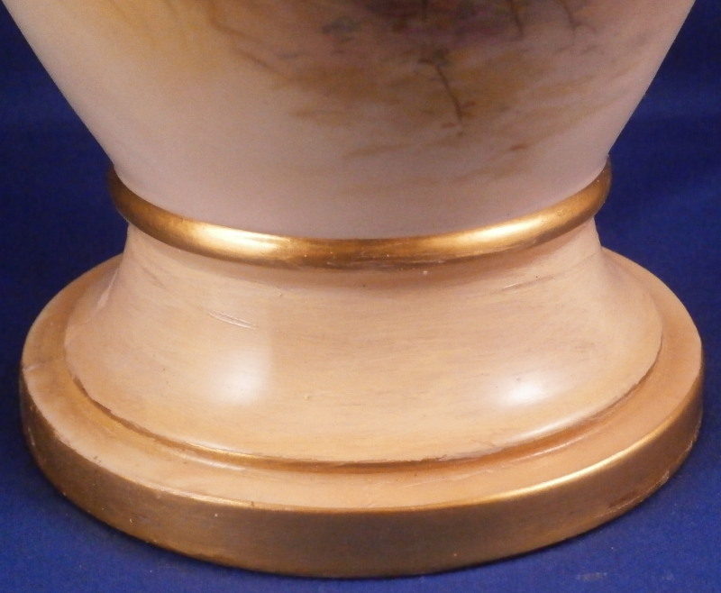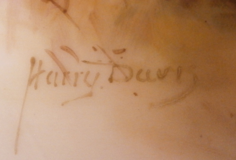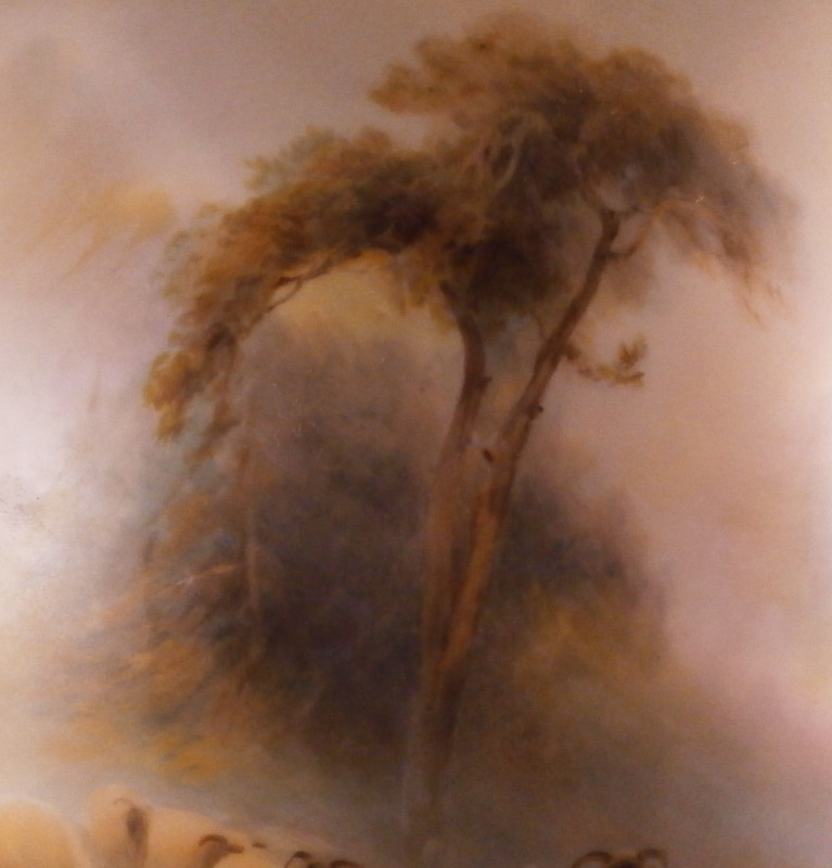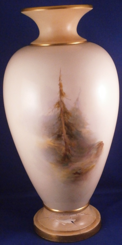 This is a superb vase made by Royal Worcester around 1900. The piece has a baluster shape with a blush colored foot and neck with a bit of gold trim but the best part by far is the hand painted scene to the front of the main body of sheep in a landscape surrounding as well as a smaller landscape vignette of an old fir tree to the reverse. The sheep scene is stunning and super detailed. One of the best I have ever come across and it is signed by Harry Davis as shown! The vase displays nicely from the front but sadly it was drilled as a lamp and the base has been broken and restored in the past and then it rebroke but that is not visible when on display from the front and would not be a terribly expensive thing to have restored again and brought back to perfection! The piece is marked with the puce shape number 1847, a red S. and a black artist mark as shown. The puce circular Worcester mark would have been in the center but was drilled through and it now gone but there might be other marks hiding under the over paint of the underside. The vase has a really nice size being about 13 inches tall with a diameter of about 6.5 inches. Still an amazing piece even with the damage and it displays jsut fine as is n my cabinet! Please email me for more information or other pictures.