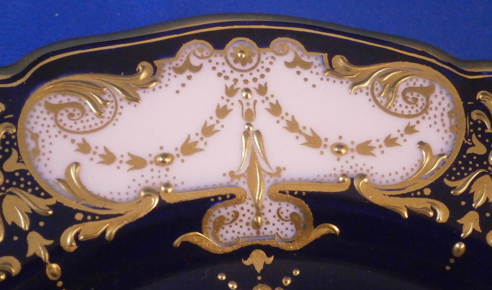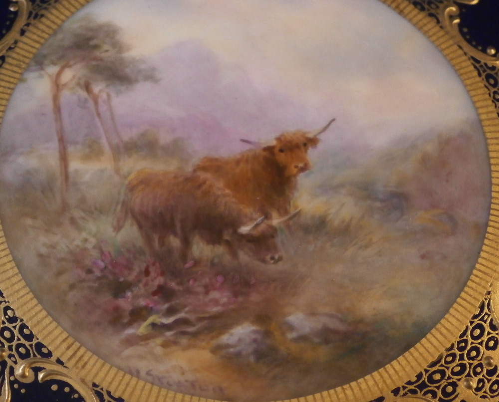 This is an amazing plate made by Worcester around 1931 I believe if I read the date code correctly. The plate is superbly hand painted with a Highland cattle scene in the center including two bulls/cows in a superb landscape surrounding. The scene is signed H. Stinton for Harry Stinton who worked at Worcester from 1896 until 1963. He is probably the most famous of the Stinton family and his Highland cattle scenes are highly sought after even today. The scene is surrounded by a very fancy gold trim on cobalt blue ground. Some nice raised details to the gilding. The rim has cartouches of pink ground with gold designs that are separated by the blue ground with more gilding. Gold trim to the nicely shaped edge. All in all a really fancy and superb plate with an amazing scene! The plate is in perfect condition which is always a nice bonus! It is marked with the puce circular Worcester mark with the two interlocking rings over the made in England standing for 1931. There are some other markings to the back as well all shown in the pictures. It is 1 inch tall and 8.875 inches in diameter. Please email me for more information or other pictures.