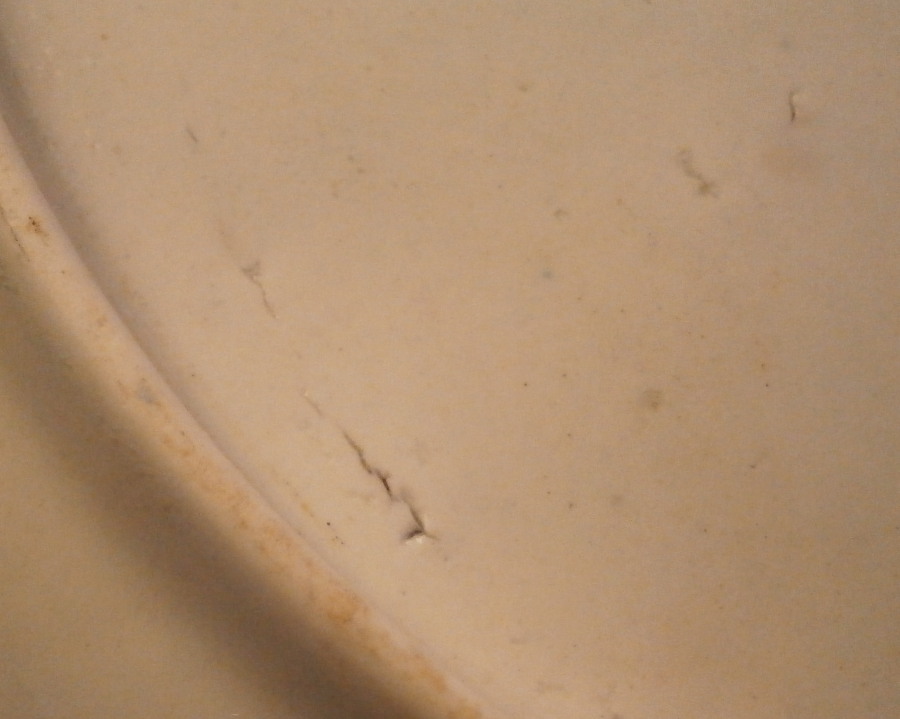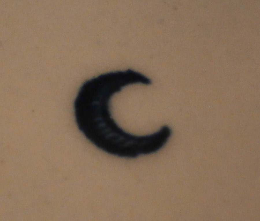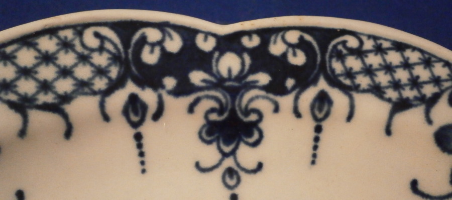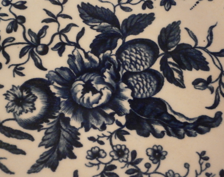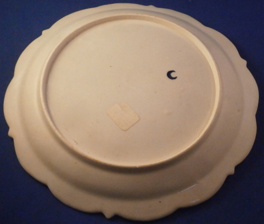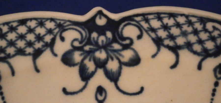 This is a rare underplate for a Cress dish made by Worcester around 1770. It is decorated with a blue and white pattern called the pinecone pattern with a nice rim design and the center having a large blue and white design including what looks to be pine cones , an open peony between the two pinecones and a pomegranate as well as some smaller flowers and leaves. Rare to find this type of plate - all it is missing is the strainer. Originally these used to be called strawberry or berry strainers but nowadays they are called Cress dishes. Nice rim shape as well! The piece is in great condition with just some use marks to the clear glaze only visible when held at the right angle to the light! It is marked underneath with the under glaze blue crescent mark as shown. The plate is 1 inch tall and 9.5 inches in diameter. Please email me for more information or other pictures.