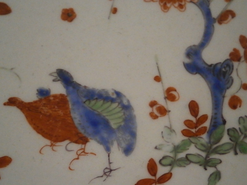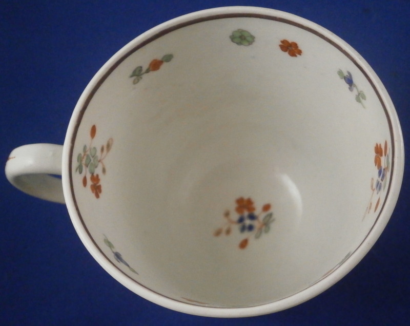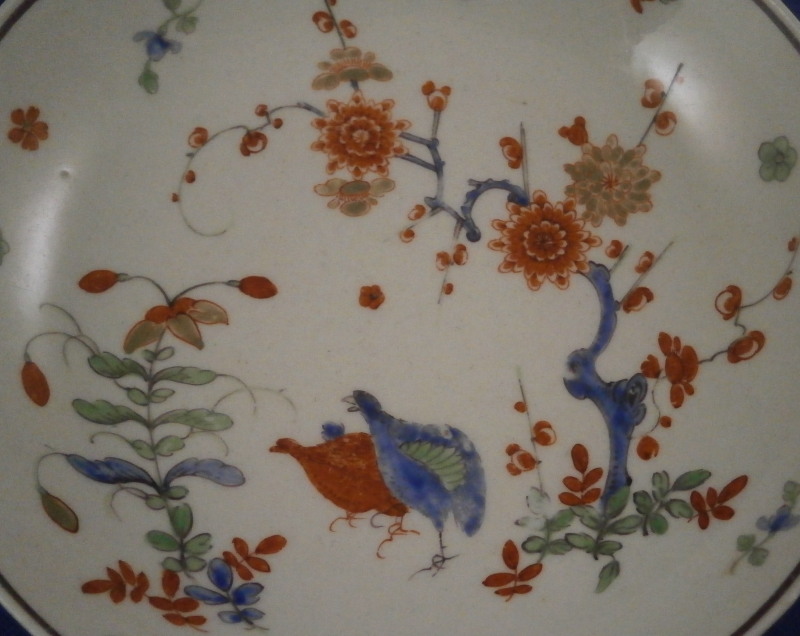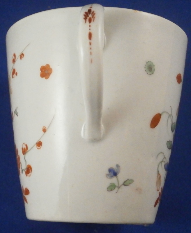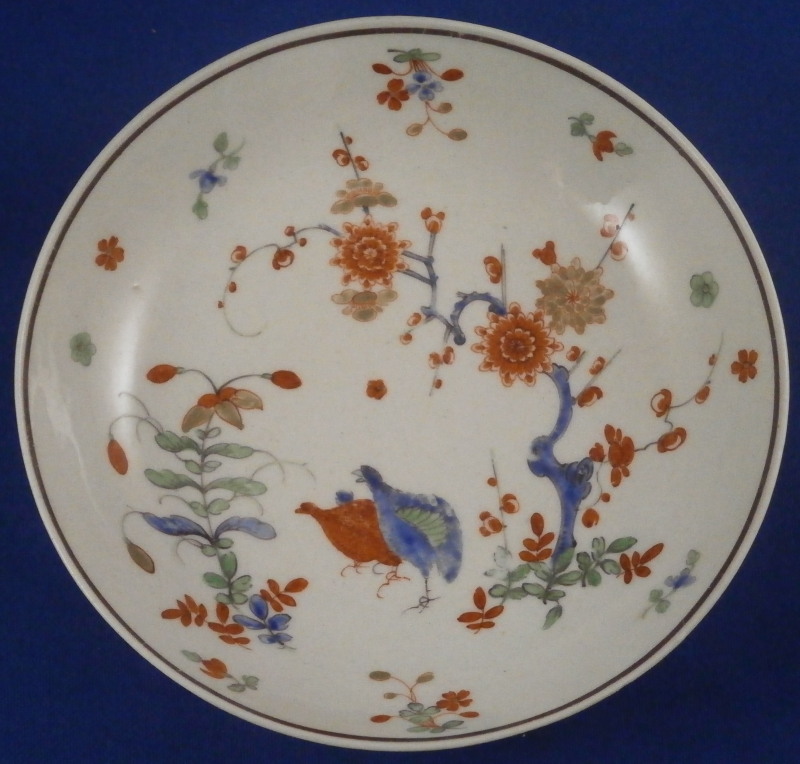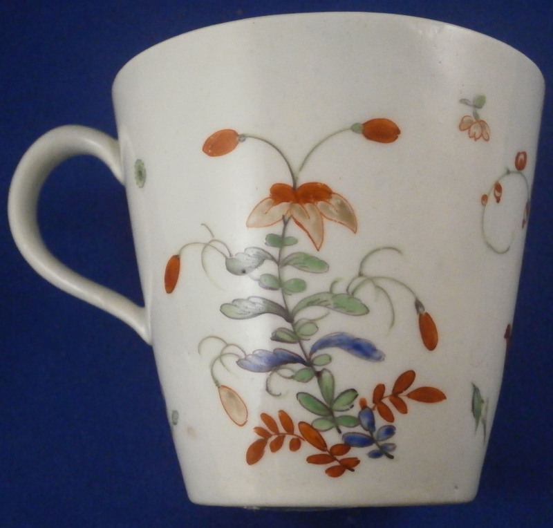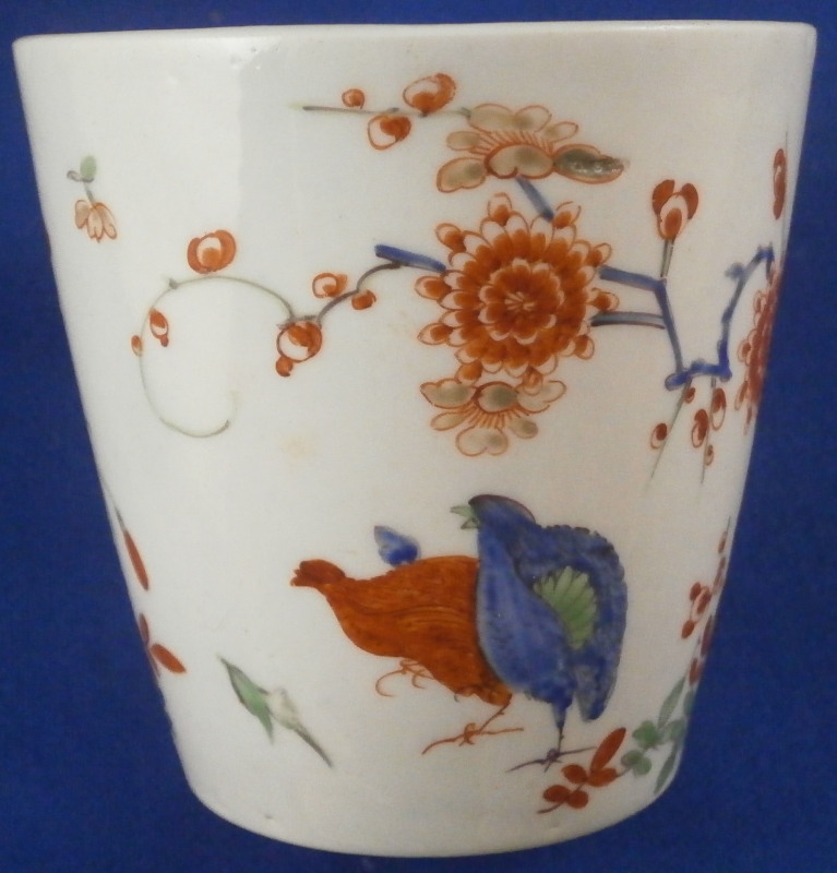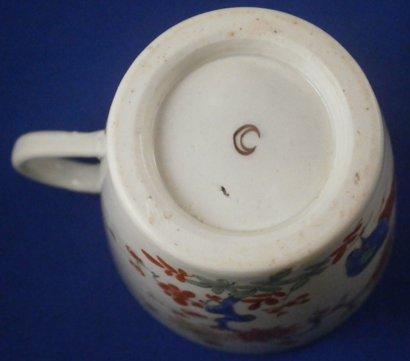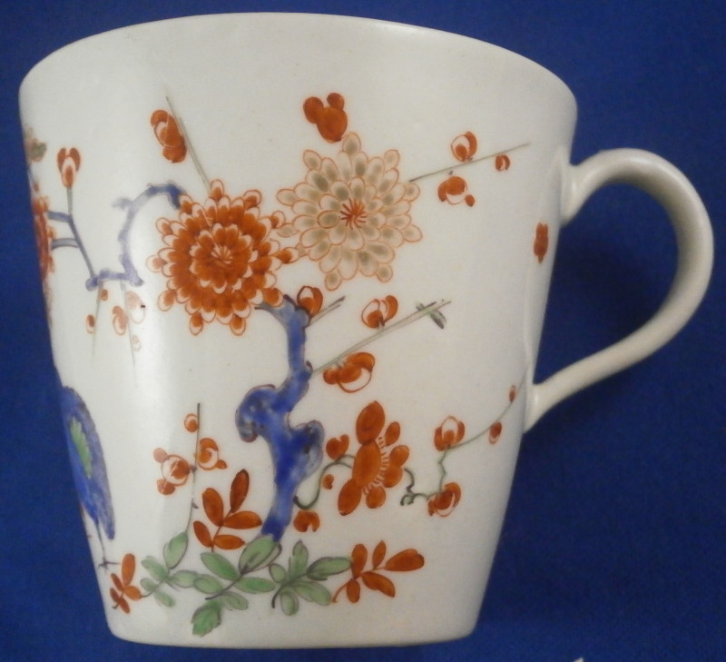 This is a superb cup and saucer made by Worcester in the 18th century. An unusual shape with an unusual mark - it was a must have for me :) Both piece are hand painted with a version of the two quails pattern with the red and blue quail next to some plum blossoms in red, blue and green in imitation of Japanese porcelain in the Kakiemon style. The colors and design are stunning. I do love the two quail pattern anyway and have examples by quite a few makers by now but this one here is quite nice! I love the shape of the cup especially and the design is just superb with lots of attention to details like the tiny flowers to the inside of the cup. Brownish ring as trim to the inside of the cup and around the edge of the saucer with the same color used to pain the crescent moon mark on the underside of both pieces. I had not seen anything like this before but found another almost identical example in the V&A museum which also has an odd color mark. The set is in superb condition with just a little wear to the saucer where the cup would sit. It displays perfectly! The cup is 2.625 inches tall and has a diameter of 2.625 inches. The saucer is 1.125 inches tall and has a diameter of just under 5 inches. Please email me for more information or other pictures.