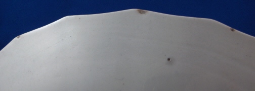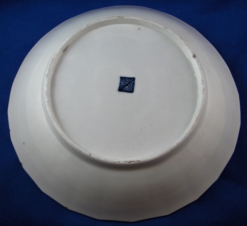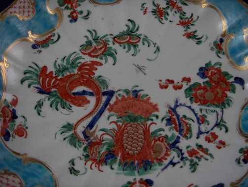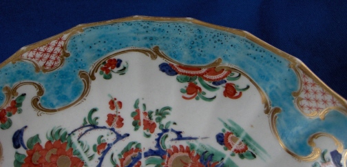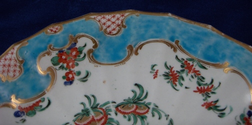 This is a bowl made by Worcester around 1760. It is handpainted with the Jabberwocky pattern which is very elegant and one of the best they produced. The center has the Kakiemon style design of the critter to the left, a pineapple looking thing in the center and lots of flowers and greens all around. Nice colors of blue, red and green in the center and the turquoise and gold rim design is just superb. The porcelain is a nice shape as well being a bit fluted. This bowl is a great example of Worcester porcelain of the 18th century and is in pretty good condition. It displays beautifully but there is some wear to mostly the high points of the bowl, some bubbling in the turquoise rim color and it has three teeny outside rim chips and a footring flaw which is probably from the making. The bowl is marked with the square fret mark underneath in underglaze blue. It is is 1.5 inches tall and 7.25 inches in diameter. Please email me for more information or other pictures.