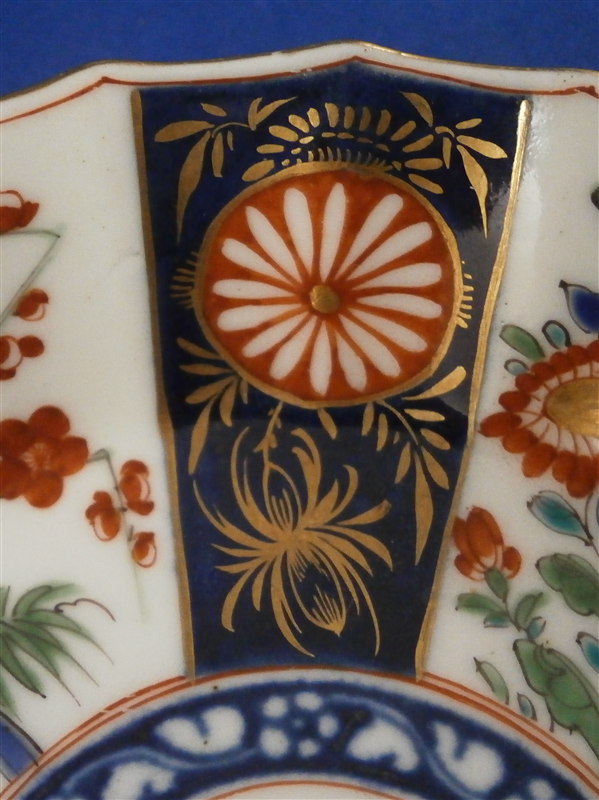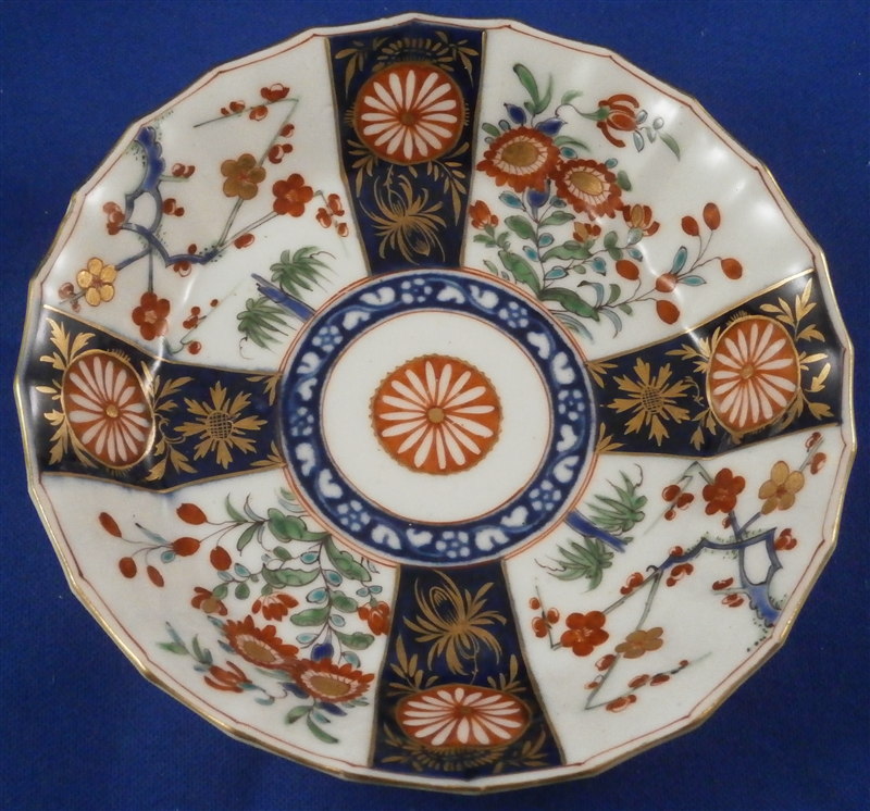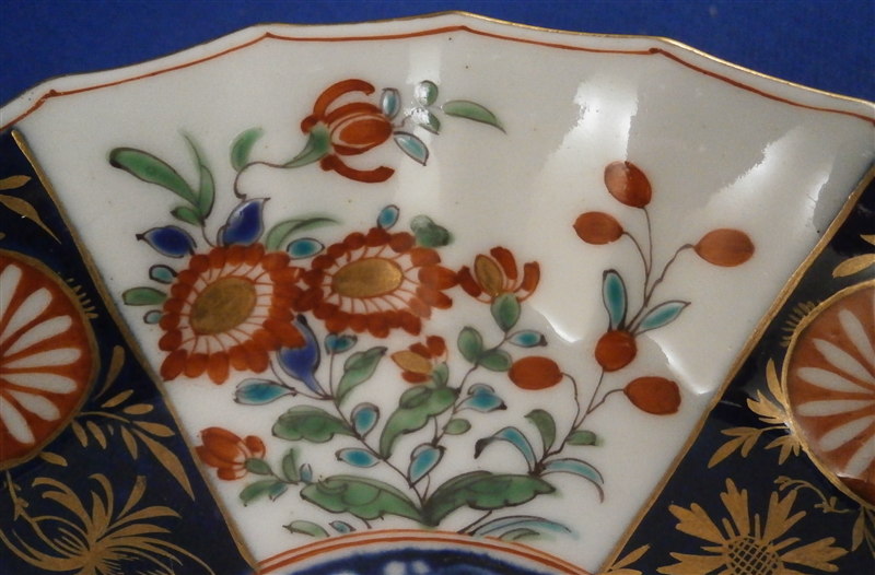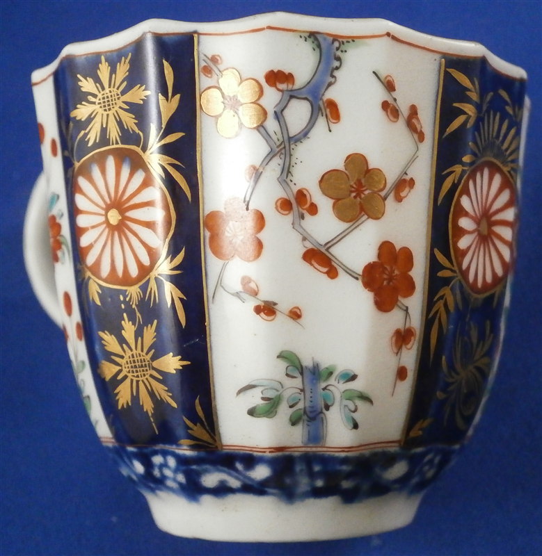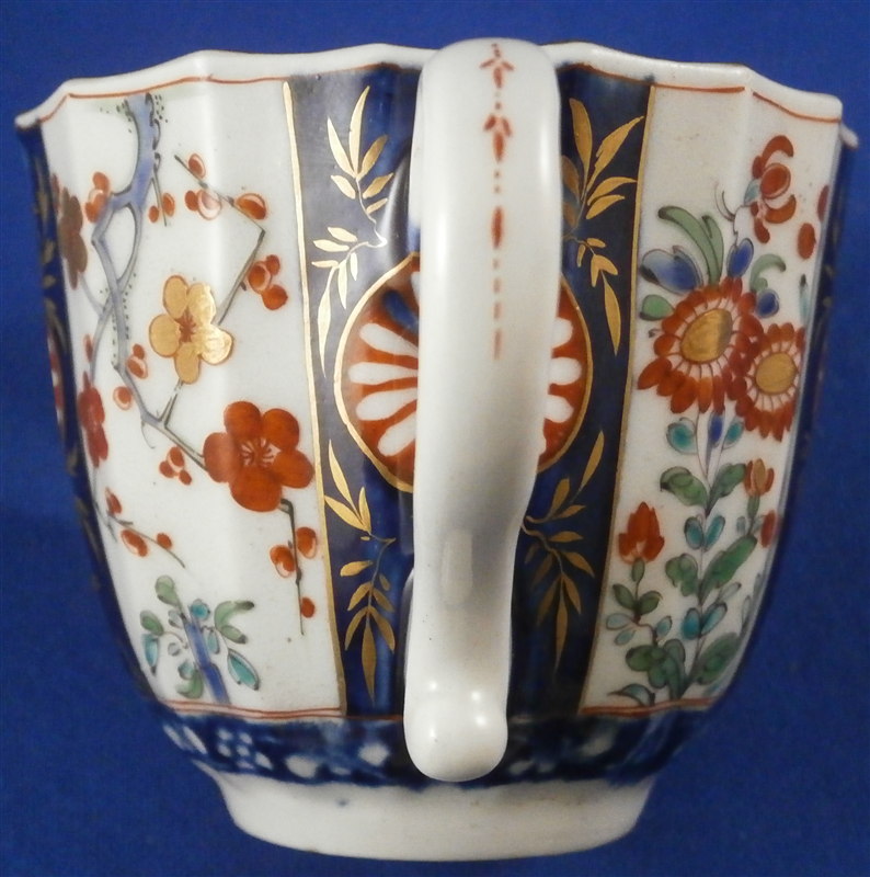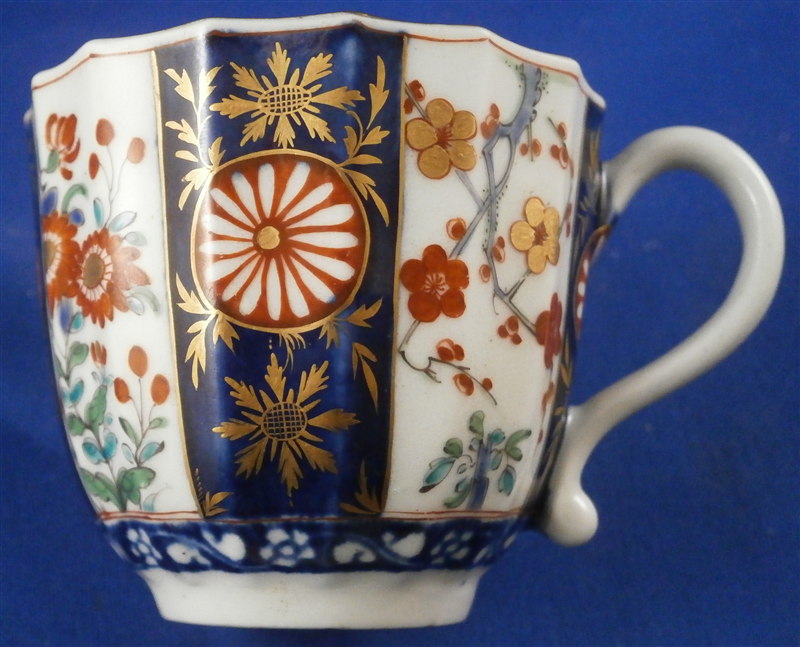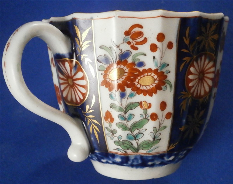 This is a superb cup and saucer made by Worcester around 1765. It is hand painted with a fun design that is a mixture between Kakiemon and Imari in alternating panels in superb colors and with lots of detail! The set is in the best condition anyone could hope for with two tiny munchers to the foot ring of the cup but these are from the making. The colors are strong, the gilding has almost no wear at all and the design and shape is top notch :) I especially like the shape! The set is marked with their early fret mark meant to imitate a Chinese seal mark. The cup is 2.25 inches tall and has a diameter of 2.625 inches. The saucer is 1 inch tall and has a diameter of 4.625 inches. Please email me for more information or other pictures.