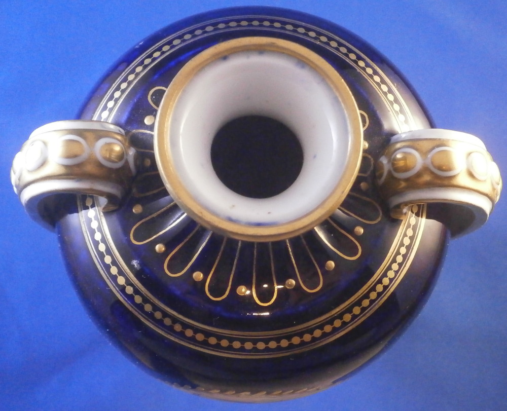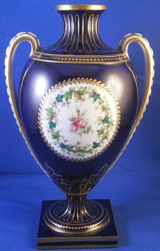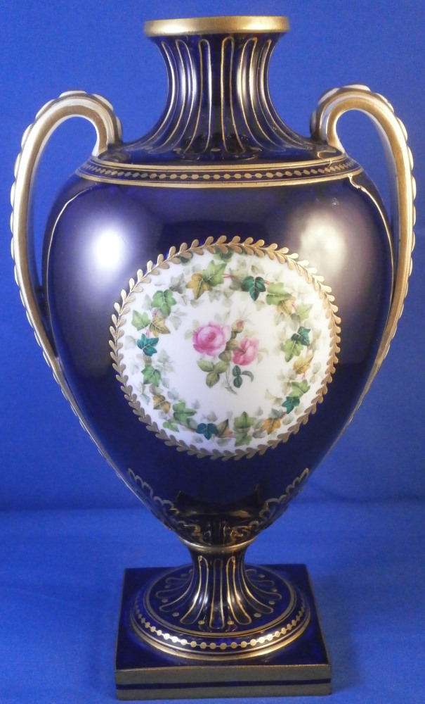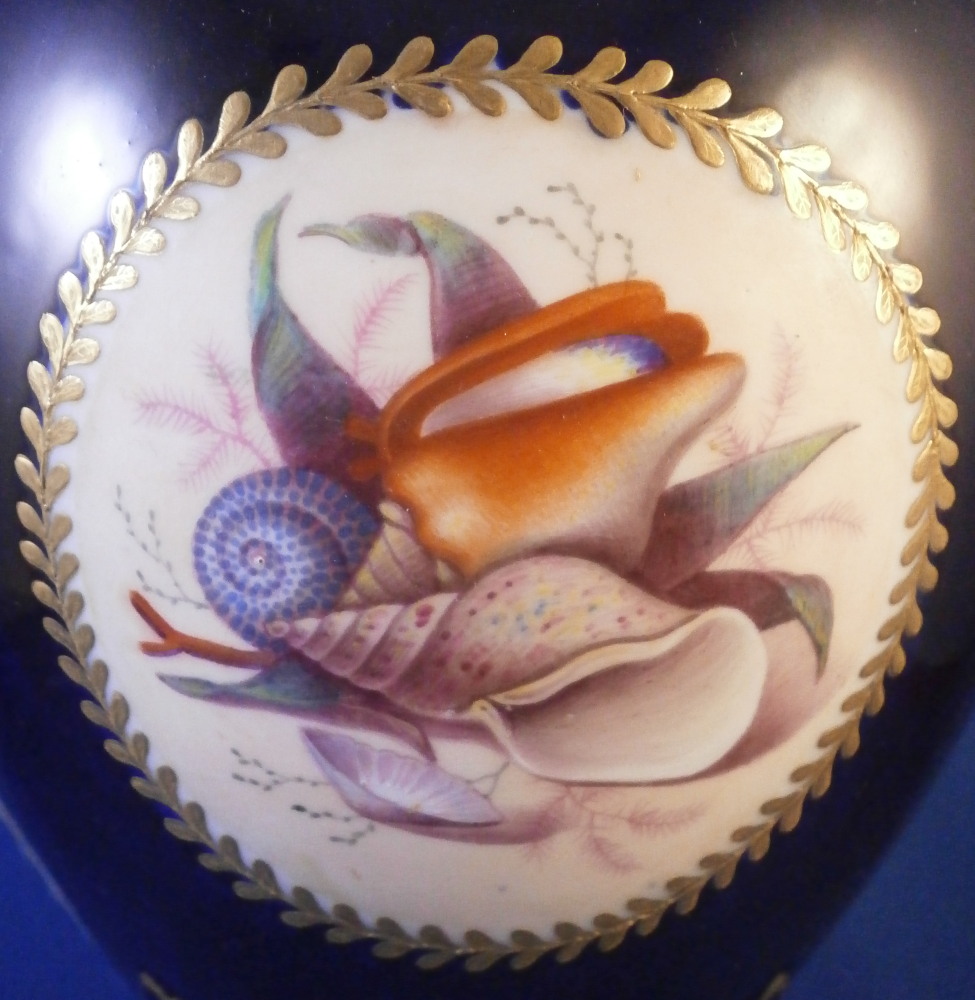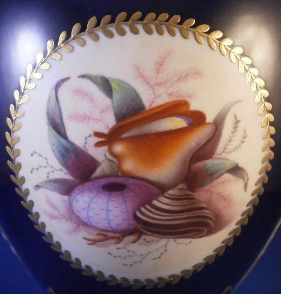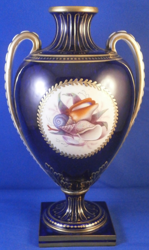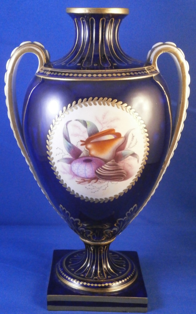 This is an amazing pair of vases made by Worcester , Kerr & Binns in 1858 - Richard William Binns and William Henry Kerr took over the management of the Chamberlain & Co porcelain works in Severn Street in 1852, Kerr left the company in 1862. Each vase has a nice shape to it with a handle to each side, a nice design to the neck area and a leaf design to the bottom. The base was made separately with a design matching the neck of the vase and attached with a metal screw and nut. The main body body as well as the base has a superb cobalt blue ground color to it with lots of gold highlights. Many of the designs and that color combination reminds me of Sevres porcelain. The back of each vase has a hand painted green ivy garland on white ground with a pink rose design to the center. Nice raised gold trim around the panel. The best part is the seashell design hand painted to the front of each piece. It includes different shells as well as a sea urchin on one piece, some seaweed and corral on an off white back ground. Just amazing and finding seashell painted pieces is very hard. I guess since Chamberlain's Worcester is famous for these types of scenes this would have been continued by the same painters under Kerr & Binns. They are very ahrd to find. The two vases are in great condition with just a touch of minor wear to the gilding of the handles, a tiny white spot in the blue ground where there is an extra spot of porcelain from when it was made and the metal fittings that hold the base and main body together are a bit loose so the base can rotate if forced. The underside of one base has a very slight hairline to it while the other has a hairline to it that is more easily visible. It goes from the underside up the side if you really search for it but it is very ahrd to spot and stable so it won't go anywhere. Each vase is marked on the underside of the base with the orange Kerr & Binns K& B Worcester mark with the year 1858.They are 8.5 and 8.625 inches inches tall, 5.25 inches wide and 4 inches deep. Please email me for more information or other pictures.