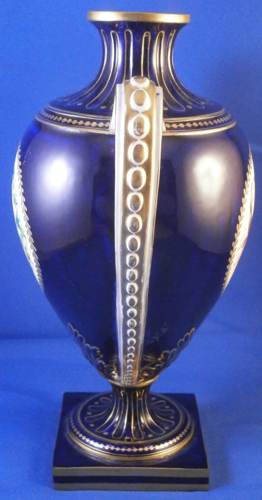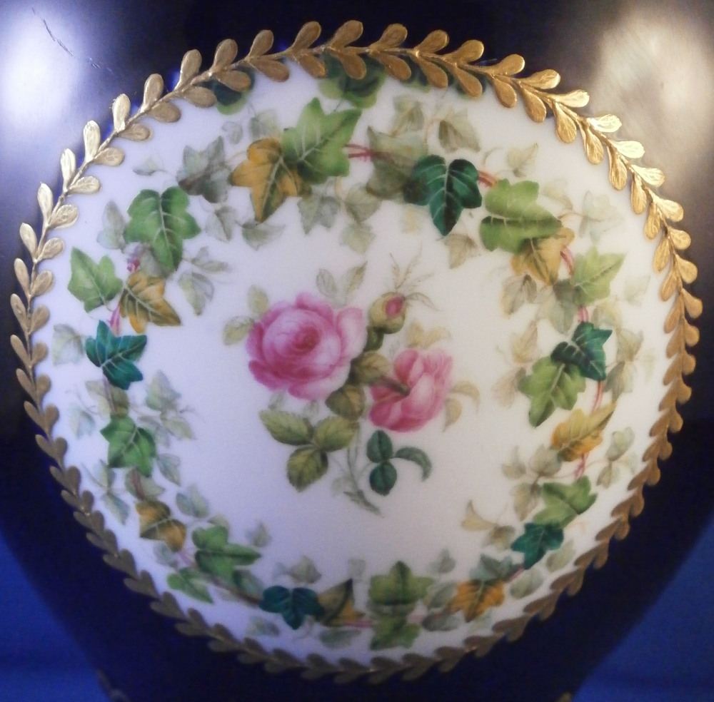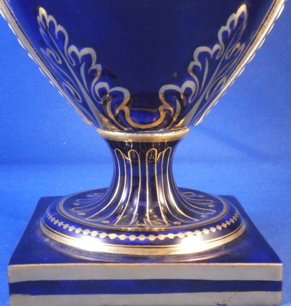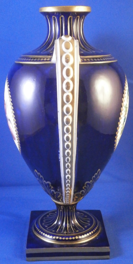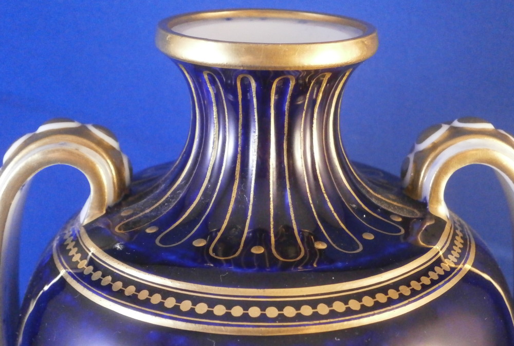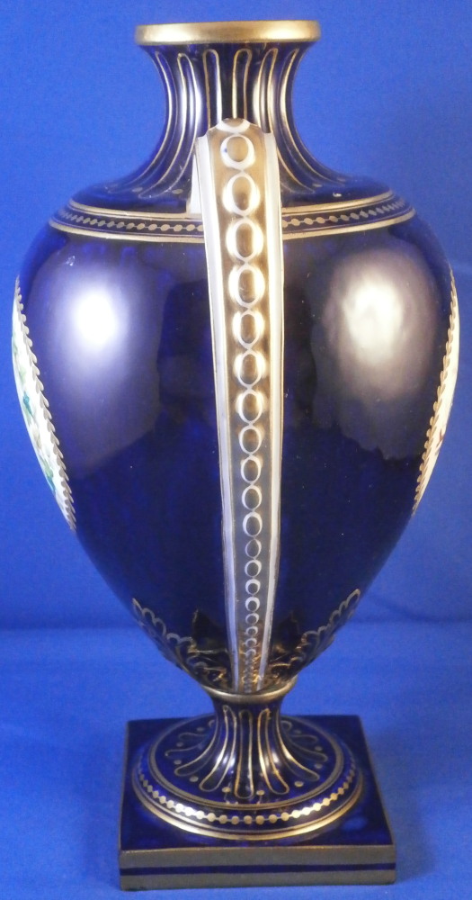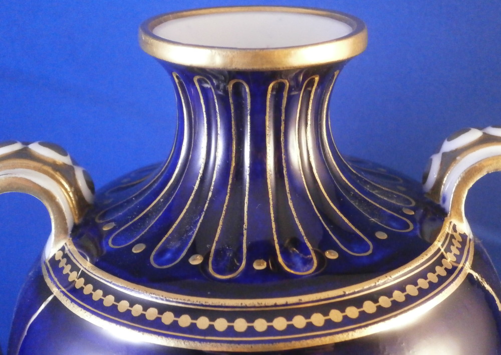 This is an amazing pair of vases made by Worcester , Kerr & Binns in 1858 - Richard William Binns and William Henry Kerr took over the management of the Chamberlain & Co porcelain works in Severn Street in 1852, Kerr left the company in 1862. Each vase has a nice shape to it with a handle to each side, a nice design to the neck area and a leaf design to the bottom. The base was made separately with a design matching the neck of the vase and attached with a metal screw and nut. The main body body as well as the base has a superb cobalt blue ground color to it with lots of gold highlights. Many of the designs and that color combination reminds me of Sevres porcelain. The back of each vase has a hand painted green ivy garland on white ground with a pink rose design to the center. Nice raised gold trim around the panel. The best part is the seashell design hand painted to the front of each piece. It includes different shells as well as a sea urchin on one piece, some seaweed and corral on an off white back ground. Just amazing and finding seashell painted pieces is very hard. I guess since Chamberlain's Worcester is famous for these types of scenes this would have been continued by the same painters under Kerr & Binns. They are very ahrd to find. The two vases are in great condition with just a touch of minor wear to the gilding of the handles, a tiny white spot in the blue ground where there is an extra spot of porcelain from when it was made and the metal fittings that hold the base and main body together are a bit loose so the base can rotate if forced. The underside of one base has a very slight hairline to it while the other has a hairline to it that is more easily visible. It goes from the underside up the side if you really search for it but it is very ahrd to spot and stable so it won't go anywhere. Each vase is marked on the underside of the base with the orange Kerr & Binns K& B Worcester mark with the year 1858.They are 8.5 and 8.625 inches inches tall, 5.25 inches wide and 4 inches deep. Please email me for more information or other pictures.