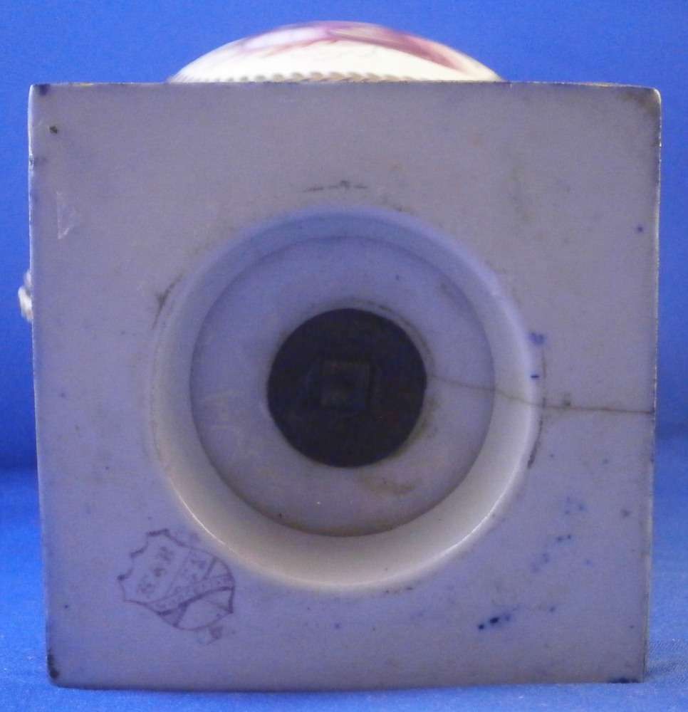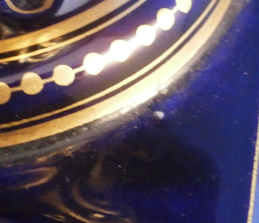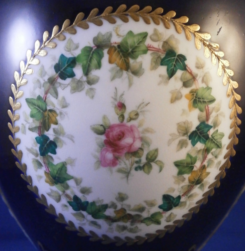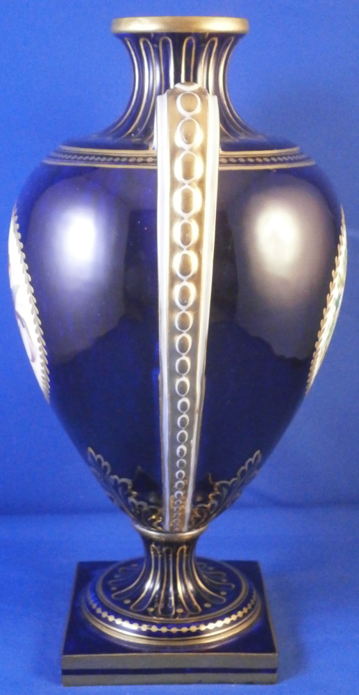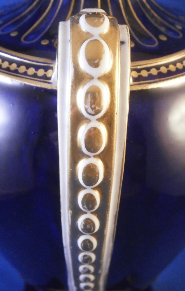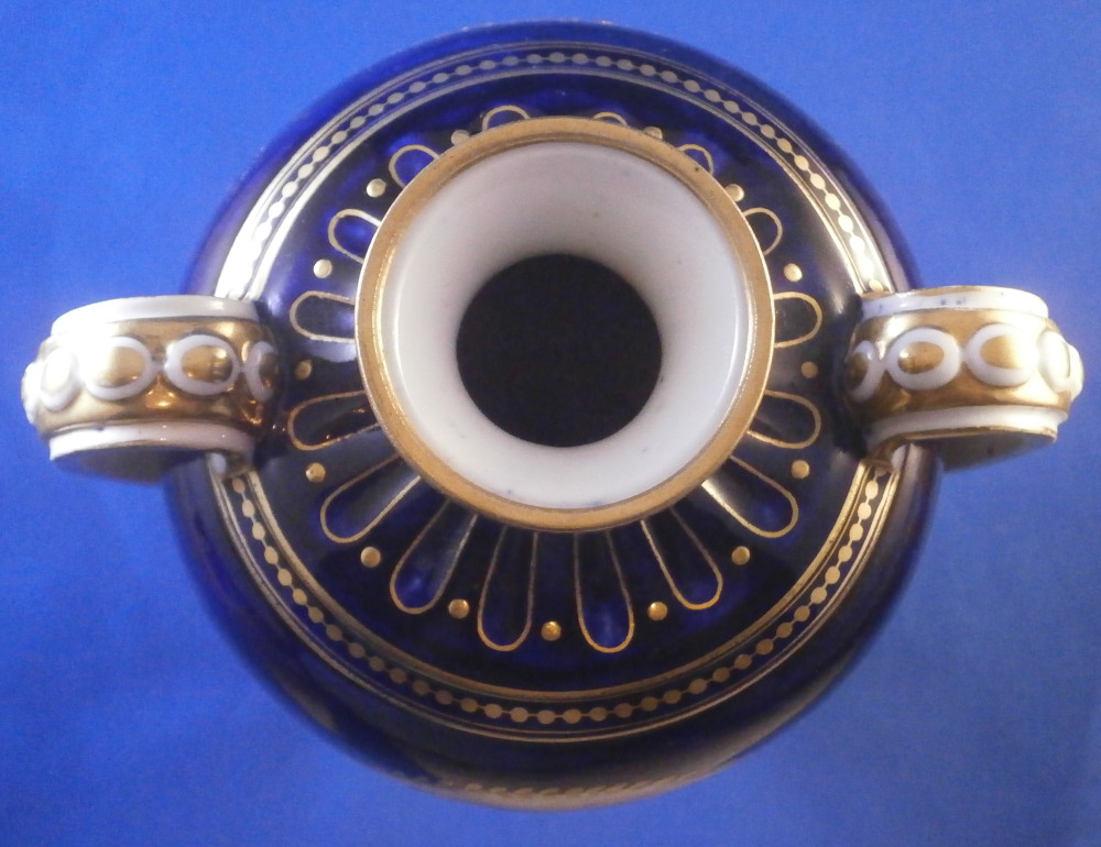 This is an amazing pair of vases made by Worcester , Kerr & Binns in 1858 - Richard William Binns and William Henry Kerr took over the management of the Chamberlain & Co porcelain works in Severn Street in 1852, Kerr left the company in 1862. Each vase has a nice shape to it with a handle to each side, a nice design to the neck area and a leaf design to the bottom. The base was made separately with a design matching the neck of the vase and attached with a metal screw and nut. The main body body as well as the base has a superb cobalt blue ground color to it with lots of gold highlights. Many of the designs and that color combination reminds me of Sevres porcelain. The back of each vase has a hand painted green ivy garland on white ground with a pink rose design to the center. Nice raised gold trim around the panel. The best part is the seashell design hand painted to the front of each piece. It includes different shells as well as a sea urchin on one piece, some seaweed and corral on an off white back ground. Just amazing and finding seashell painted pieces is very hard. I guess since Chamberlain's Worcester is famous for these types of scenes this would have been continued by the same painters under Kerr & Binns. They are very ahrd to find. The two vases are in great condition with just a touch of minor wear to the gilding of the handles, a tiny white spot in the blue ground where there is an extra spot of porcelain from when it was made and the metal fittings that hold the base and main body together are a bit loose so the base can rotate if forced. The underside of one base has a very slight hairline to it while the other has a hairline to it that is more easily visible. It goes from the underside up the side if you really search for it but it is very ahrd to spot and stable so it won't go anywhere. Each vase is marked on the underside of the base with the orange Kerr & Binns K& B Worcester mark with the year 1858.They are 8.5 and 8.625 inches inches tall, 5.25 inches wide and 4 inches deep. Please email me for more information or other pictures.