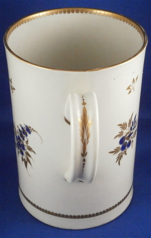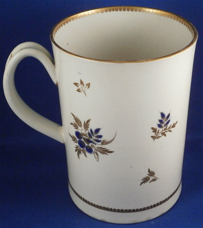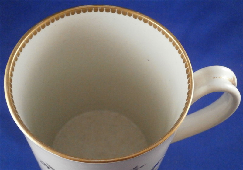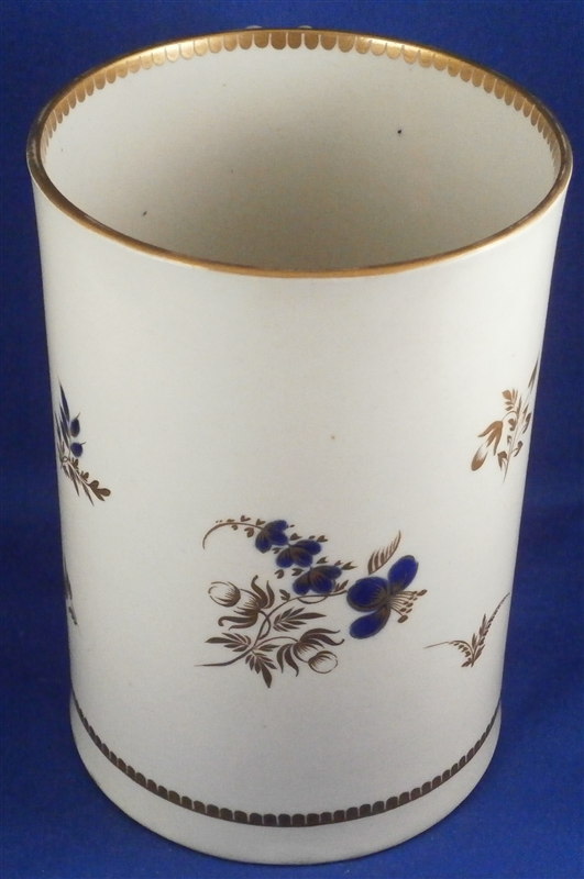 This is a tankard made by Worcester in the 18th century. It is superbly decorated with a blue and gold flower design called Dresden Flowers as well as a dentil gold trim. Typical handle shape highlighted with gilding. The perfect mug for your next cold one :) The stein is in perfect conditon with the only real flaw being a scratch to the glaze over the one flower to the left of the handle. The piece is unmarked which is fairly normal. It is a nice size being 5.75 inches tall and 4 inches in diameter. Please email me for more information or other pictures. Please email me for more information or other pictures.