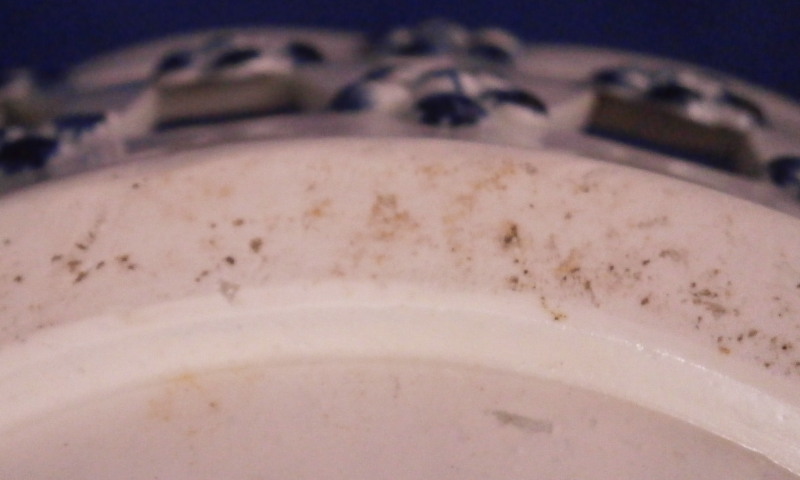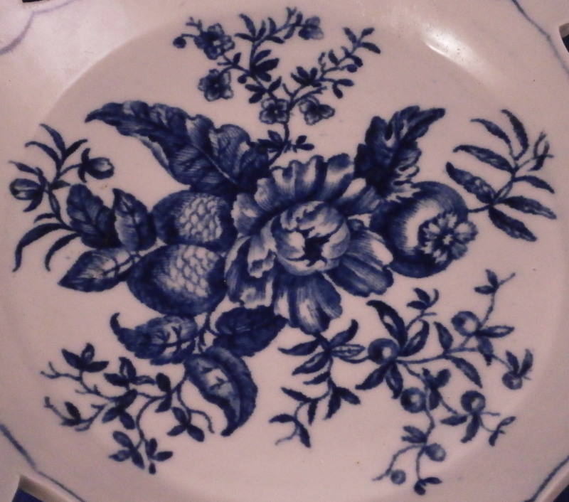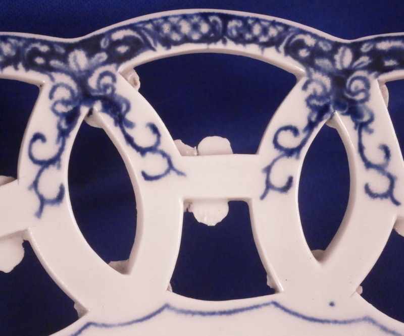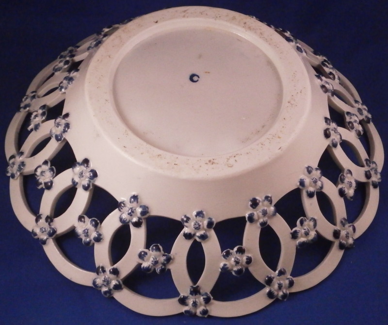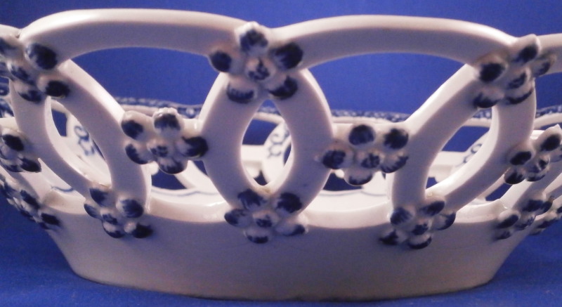 This is a superb large reticulated basket made by Worcester in the 18th century. It is decorated with a great under glaze blue design including flowers, leaves and fruit / berries with a nice rim also highlighted with a blue design. Some of the items look like pine cones which is why it was named the pine cone pattern. Nice blue design to the inside rim and the outside of the rim has lots of molded blue & white flowers to it. An really nice basket that is in perfect condition except for some minor wear to the glaze on the bottom inside which is to be expected after over 200 years and a firing flaw to the very edge from when it was made. The basket is marked with their under glaze blue crescent mark underneath as shown. The piece is 2.5 inches tall and has a diameter of 9.75 inches. I have the matching smaller version of this basket as well. Please email me for more information or other pictures.