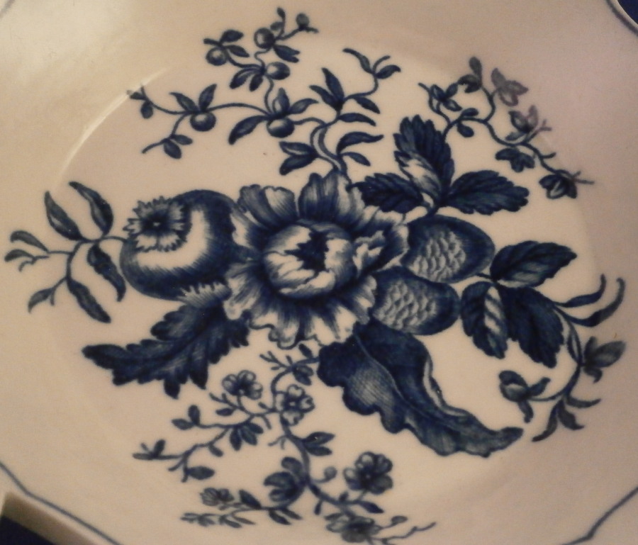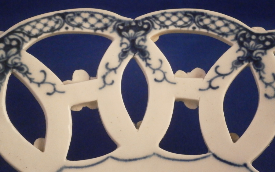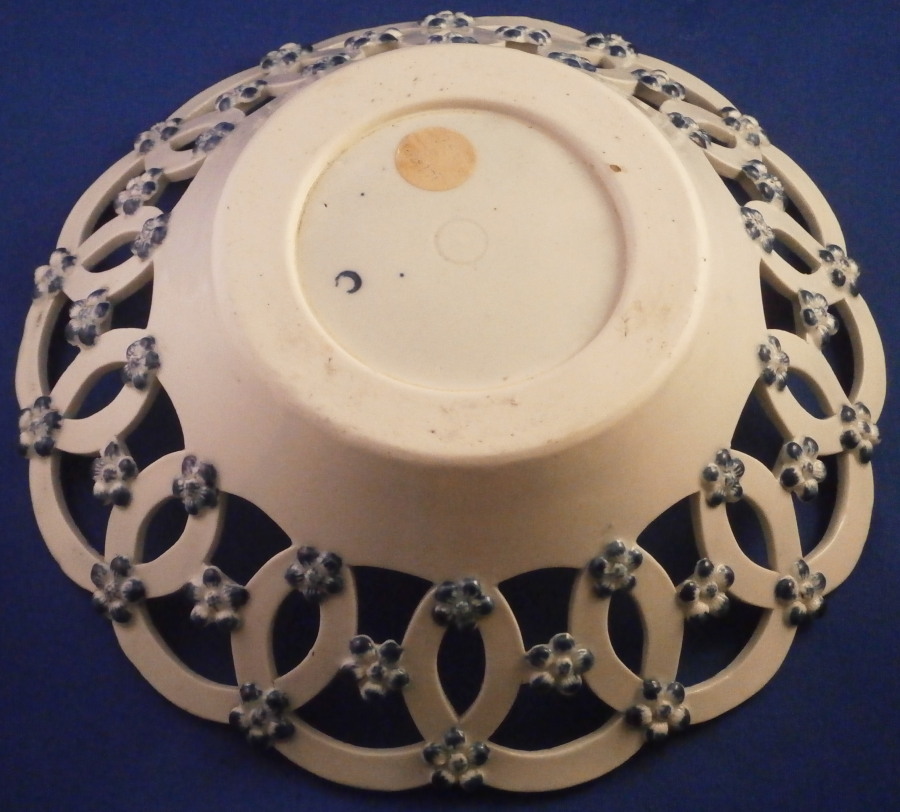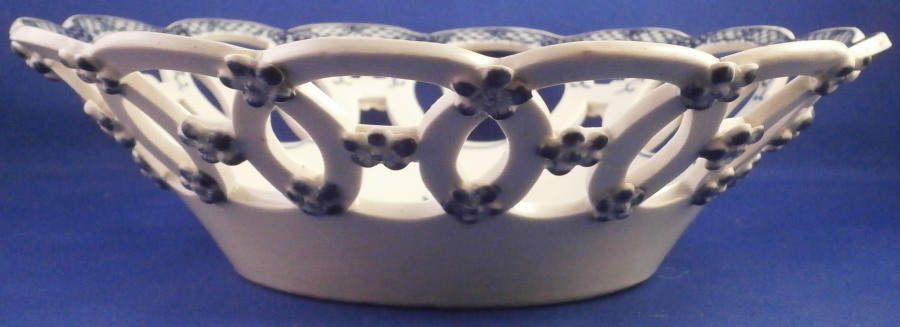 This is a superb large reticulated basket made by Worcester in the 18th century. It is decorated with an under glaze blue design called the pine cone pattern that includes flowers, leaves and fruit / berries (a pair that looks liek pine cones) with a nice reticulated rim highlighted with a blue design along the top. The outside of the rim has lots of attached molded blue & white flowers to it. An really nice basket that is in perfect condition except for some minor use marks to the glaze on the bottom inside which is to be expected after over 200 years. The basket is marked with their under glaze blue crescent mark underneath as shown. The piece is 2.625 inches tall and has a diameter of 9 inches. I have the matching smaller version of this basket as well. Please email me for more information or other pictures.