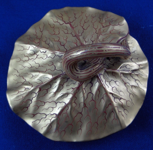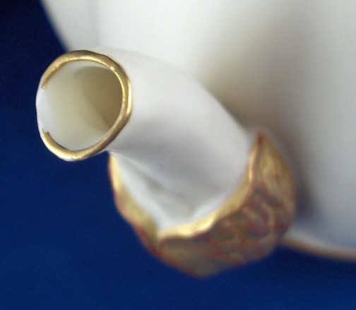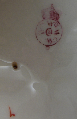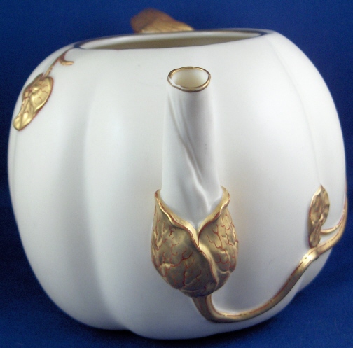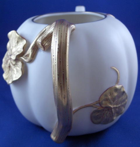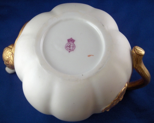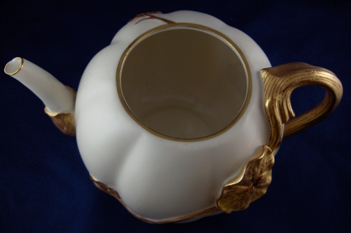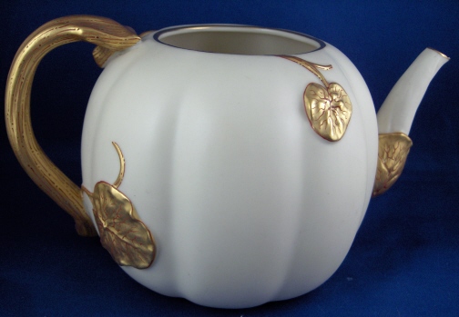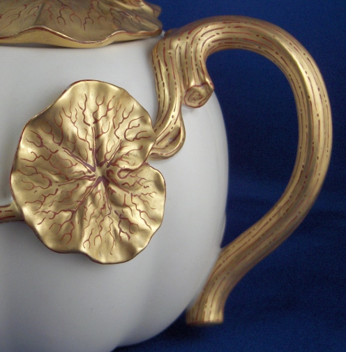 This is a superb teapot made by Worcester in 1888/1889 during the aesthetic period. It is superbly modeled with a lilypad type design that is handpainted in red and gold to look stunning on the ivory colored porcelain. The pot and lid are in great condition with one small chip to the inside spout rim which would be hidden completely by just adding a touch of gilding! It is 6 inches tall, about 8 inches from spout to handle and 5.5 inches wide. Both the main body and lid are marked with the puce Worcester mark as well as a red painter's mark. Year code Z under the teapot and O under the lid. Really a superb specimen for this period! Please email me for more information or other pictures.