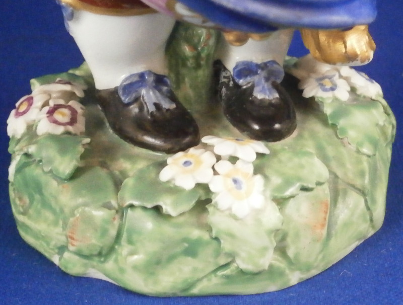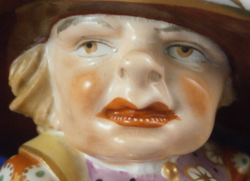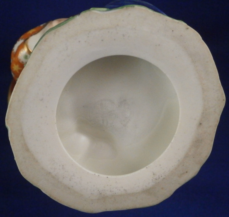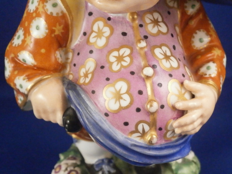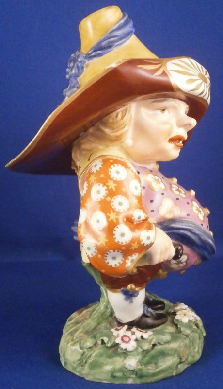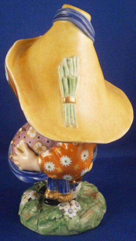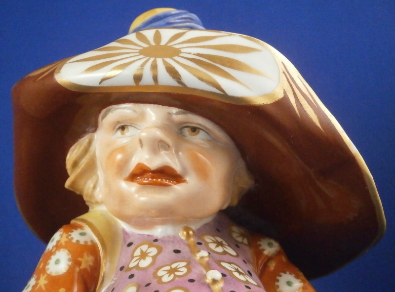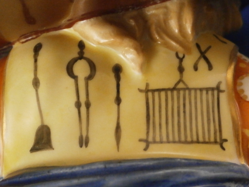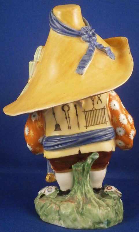This is a rare and fun figurine made by Worcester in the later 19th century. It is a Masion House Dwarf after the 18th century Derby originals. The corpulent figure is wearing nicely hand painted clothes while wearing a very large hat with the base having some applied flowers to it. The back of his shirt has the tools of the trade for a fireplace salesman or something along those lines. The dwarves are always so cheerful to look at which is probably why they are still so popular after over 200 years :) The figure is in great condition with some very minor wear to the gilding and the tiniest of chips to the brim of his hat. The piece is 6.25 inches tall, 4 inches wide and 3.5 inches deep. He is marked underneath with the impressed Worcester mark as shown. Please email me for more information or other pictures.