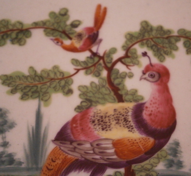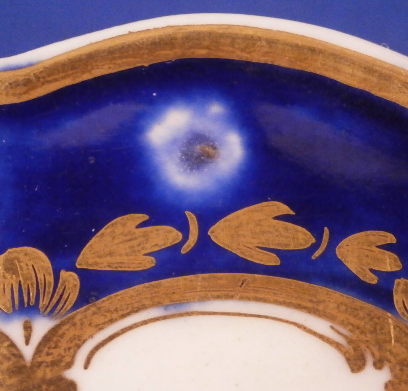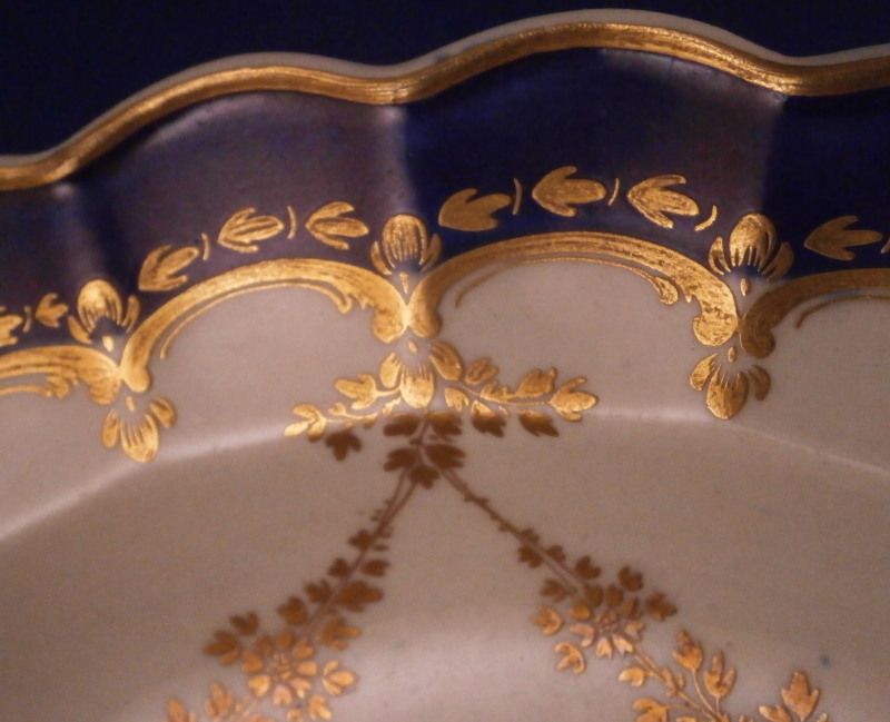 This is a really nice plate made by Worcester in the 18th century. The plate is hand painted with a superb bird scene in the center including two birds in a landscape surrounding and the rim has a blue ground color with a nice gold trim over it with some gold flower garlands going into the well of the plate. A really good quality piece! A very elegant plate and the gilding is just superb! The plate is in superb condition with a small circular flaw to the rim with an imperfection in the center and around it the blue color didn't perfectly take. This is from when it was made. The center right under the bird has a flake to the color which was filled in with pink color to make it look like a flower and it blends in perfectly and display superbly as well. The dish is 1.25 inches tall and has a diameter of just over 8.5 inches. It is marked with their blue half moon type mark as shown. Please email me for more information or other pictures.