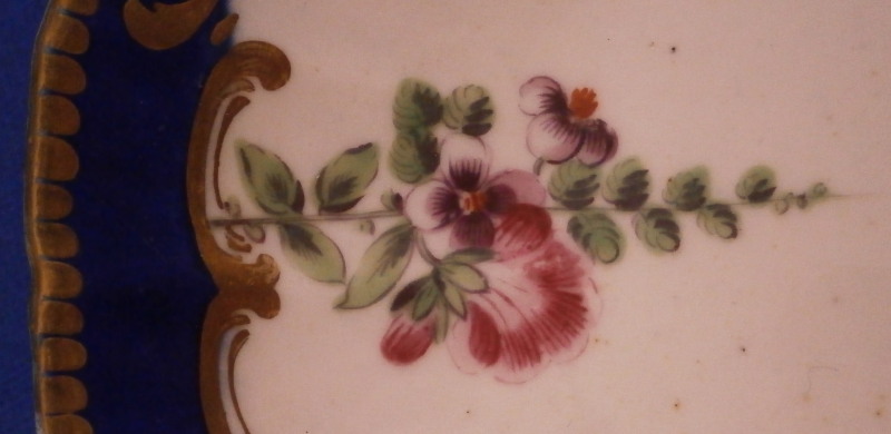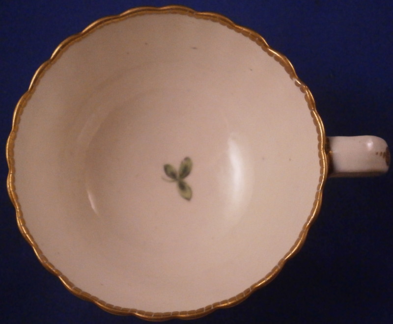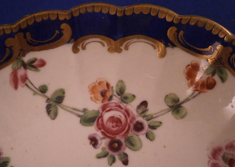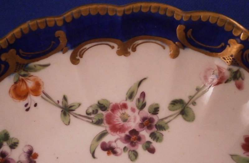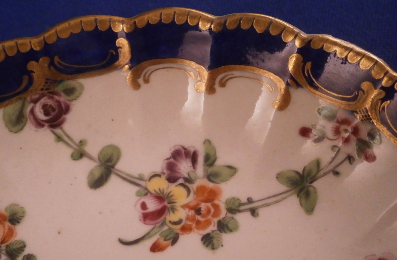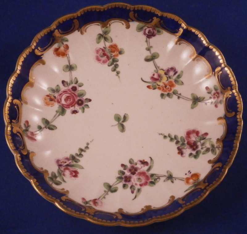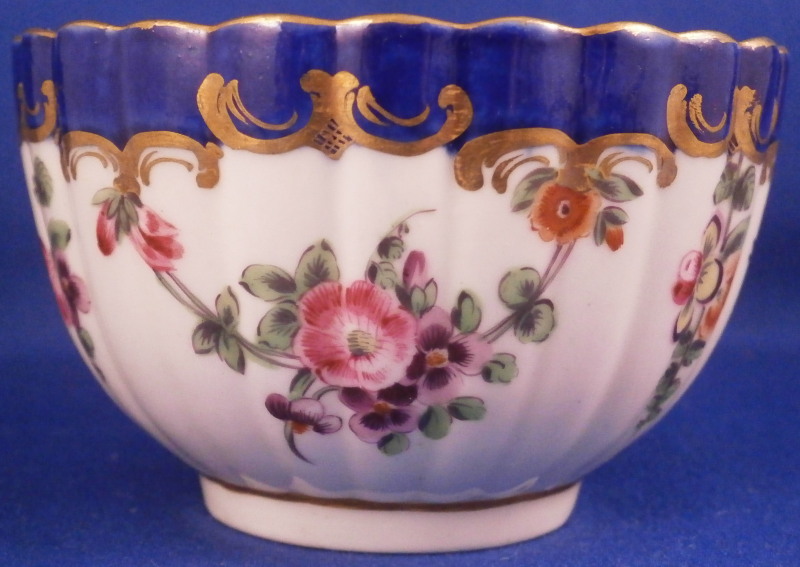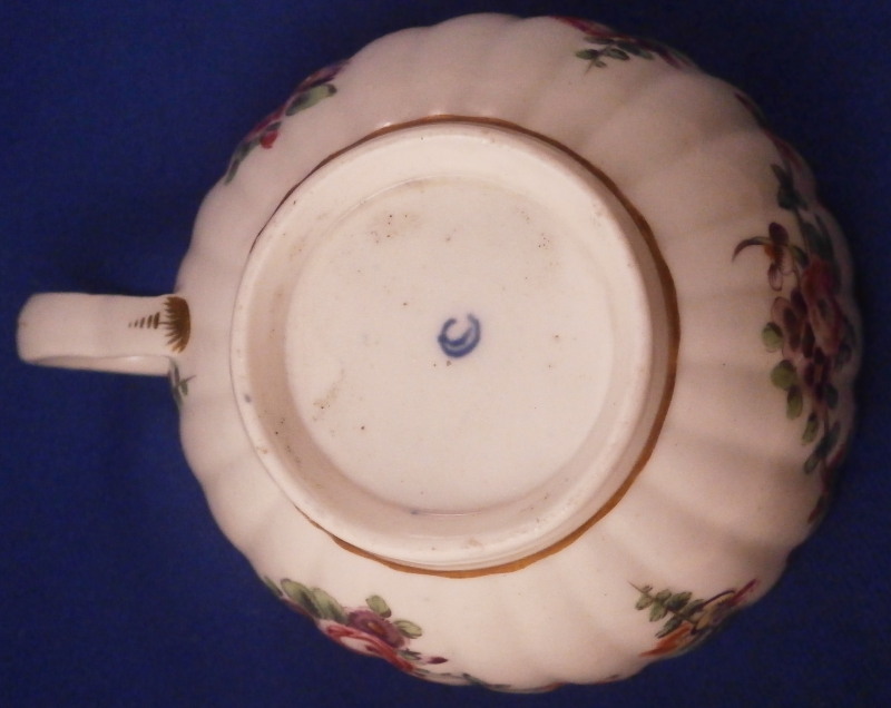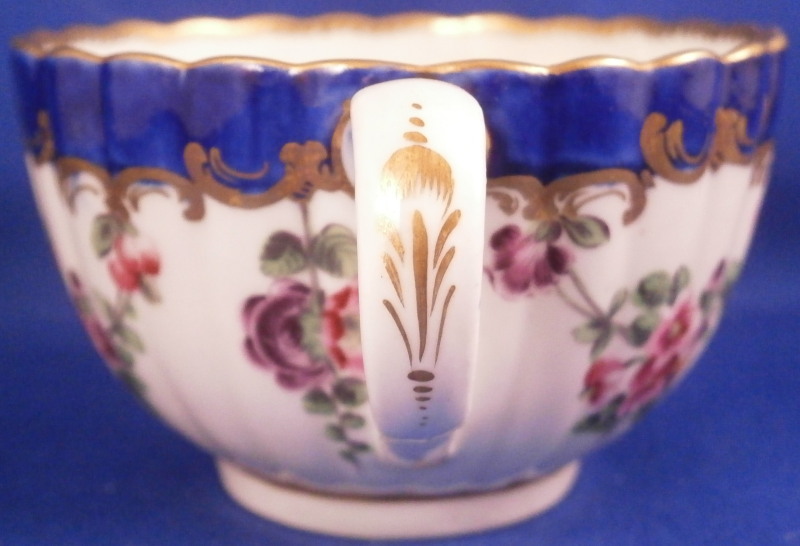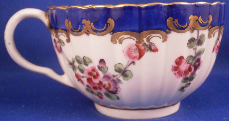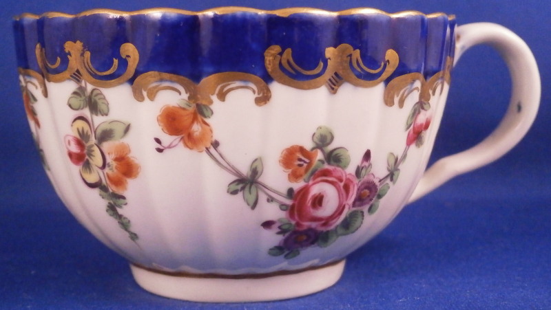This is a really nice cup and saucer made by Worcester in the 18th century. The set has a nice fluted shape to it and is hand painted with some floral garlands and other flower designs plus a superb cobalt blue ground to the edge with some nice gold trim to it. A bit of a gold design to the handle as well. Really a nice look! Both pieces are in great condition with just the usual minor firing issues like tny firing spots. The cup is 1.875 inches tall and has a diameter of 3 inches. The saucer is just over 1 inch tall and has a diameter of 5.375 inches. Each piece is marked with their under glaze blue moon as shown. Please email me for more information or other pictures.