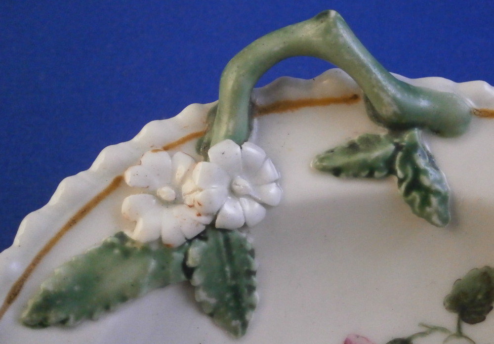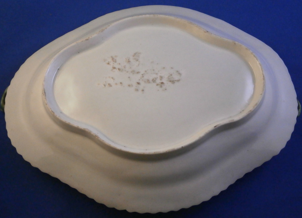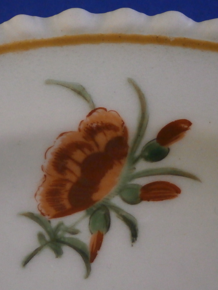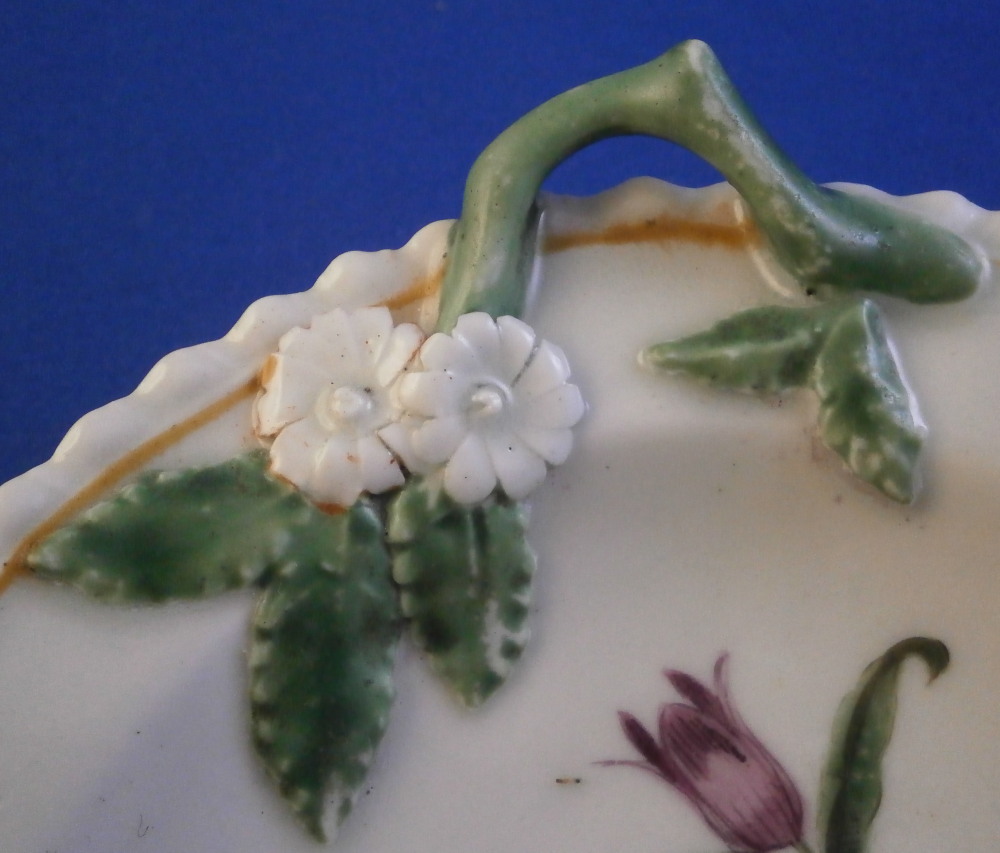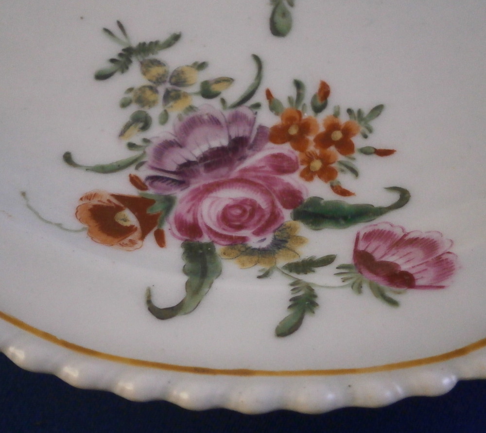 This is a nice early underplate / stand for an oval butter tub made Worcester in the 18th century probably around 1760. A very rare item especially in polychrome! The piece is oval in shape and is hand painted with a large polychrome floral arrangement to one side with a few single flowers and leaves scattered throughout the rest of the piece. The rim has a nice design to it with a thin yellow line going around it and a green branch handle to each end with applied green leaves and white flowers to the terminals. It's a great looking piece on its own but if someone has the oval buttertub that goes with it that would be amazing together! The piece is in superb condition with jsut some minor use marks - as nice as they come! The underside has some kiln grit in the center from when it was made which does not affect the piece at all. Unmarked which is pretty normal for them during this period. The piece is 1.5 inches tall at the handles, 8.25 inches wide including the handles and 6.25 inches deep. Please email me for more information or other pictures.