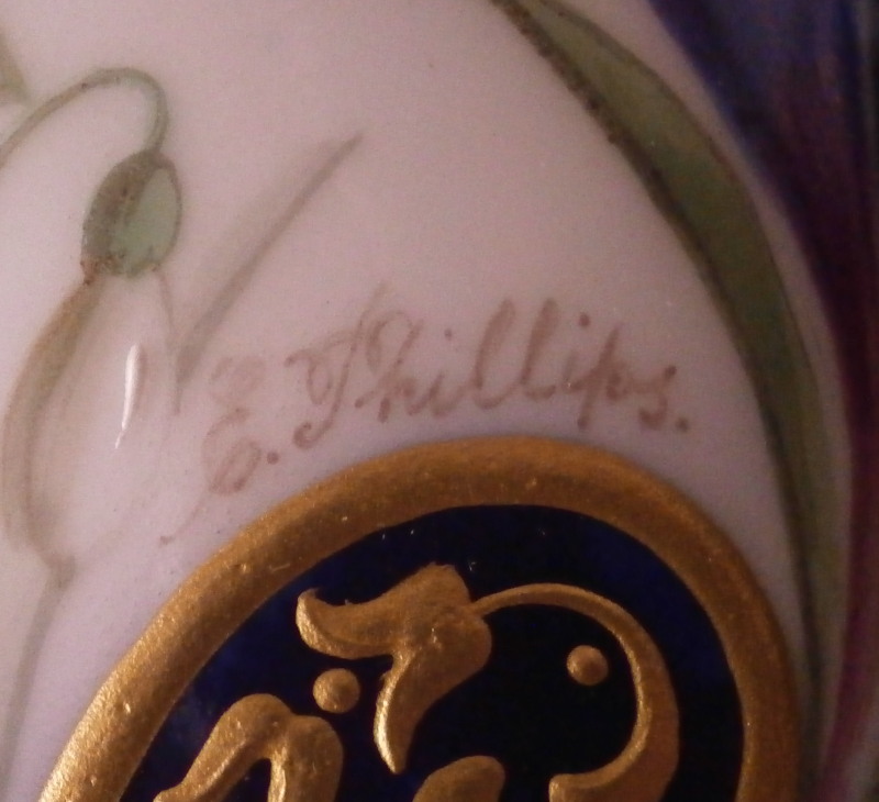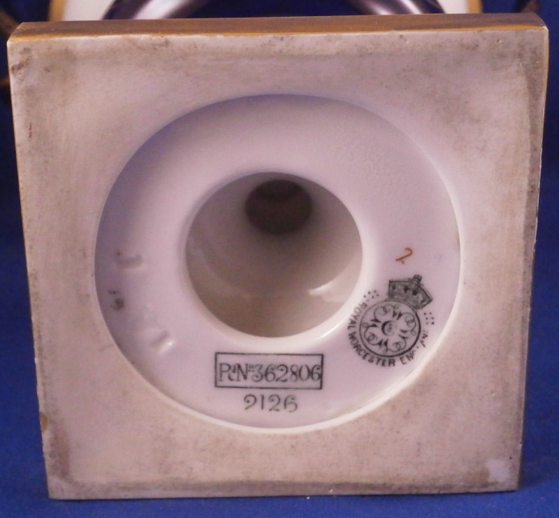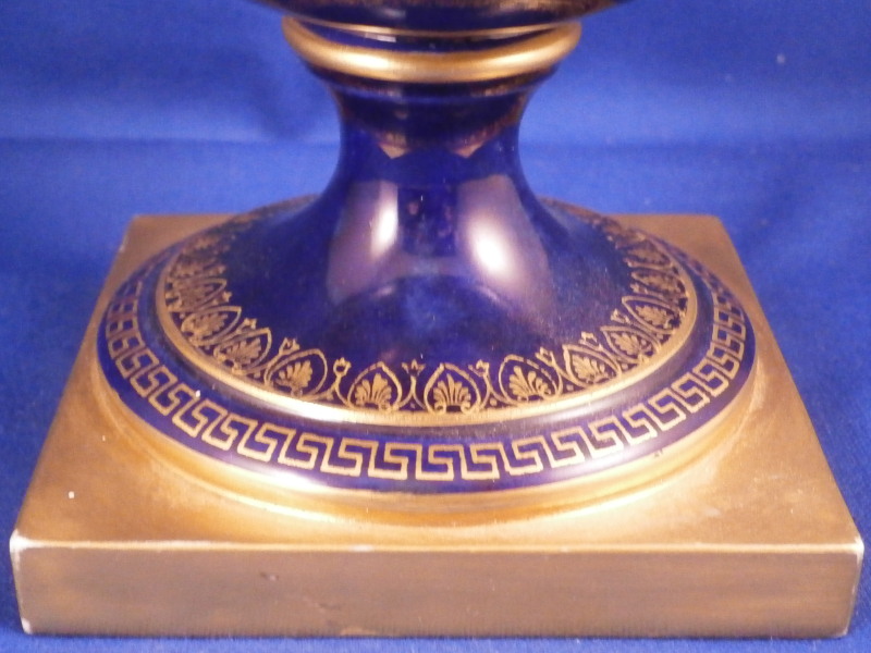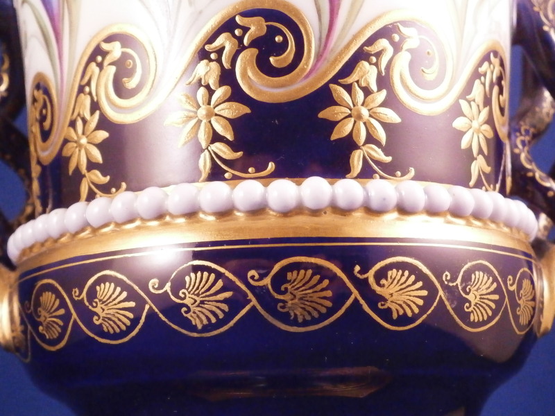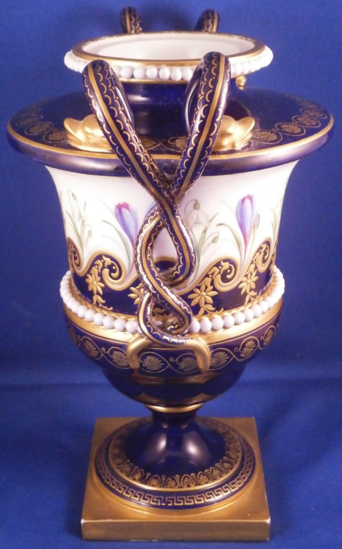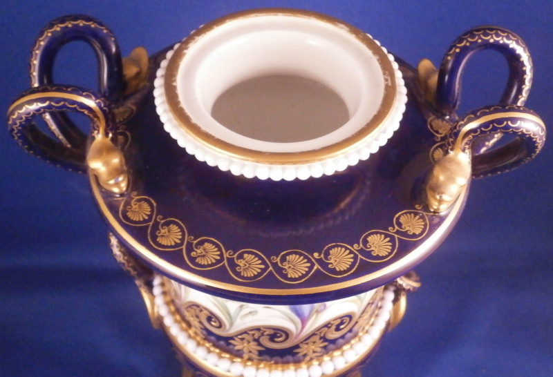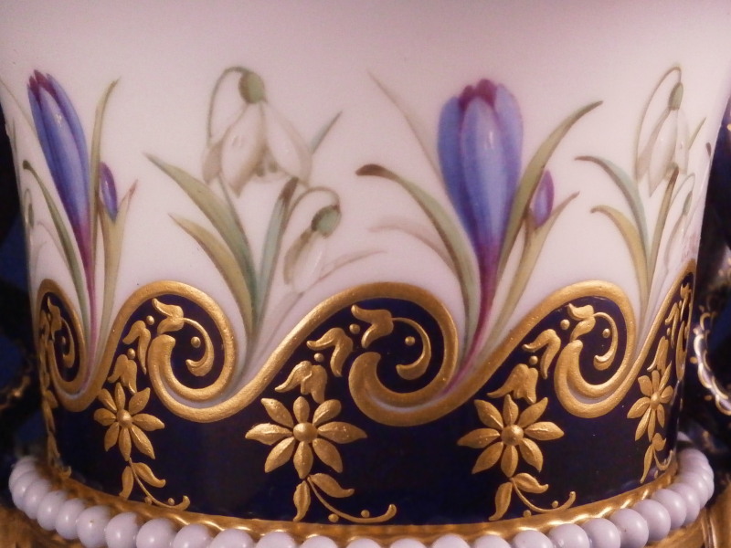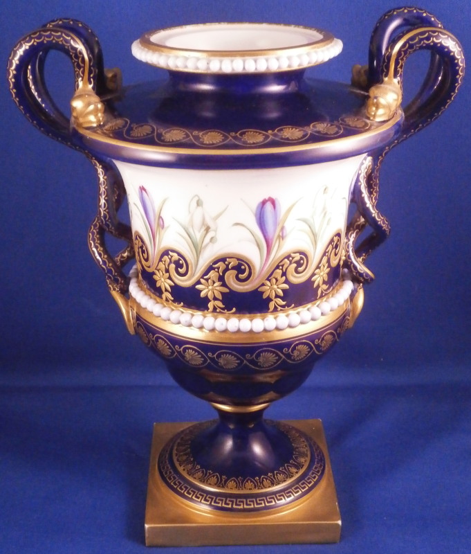 This is an amazing vase made by Worcester in 1903 if I got the dating correct. The nicely shaped vase has a superb snake shaped handle to either side, a "pearl" trim to the top edge as well as around the center and sits on a nice base. The main body body as well as each handle has a superb cobalt blue ground color to it with lots of gold highlights. Many of the designs and that color combination reminds me of Sevres porcelain. My favorite part though are the hand painted crocus and snowdrop flowers going all around the center with the raised floral gold design underneath. Jsut stunning! The piece is signed E. Phillips as shown. Ernest Phillips worked for them from 1890 until 1932 and mainly did flowers and still life scenes of superb quality! A stunning vase with the added bonus of being signed! The vase is in perfect condition with just a touch of wear to the very top edge and the corners of the base. The underside of the base is marked with a few marks as shown including the typical Worcester mark with the dots as a dating system, the registration mark a number 2126 as a model number I believe, a 19 or 61 as well as a red 2 as artist marks and some impressed marks as well. The entire vase is 7.75 inches tall, 6.125 inches wide and 4.75 inches deep. I have a matching piece that is not signed if anyone is interested in a pair. Please email me for more information or other pictures.