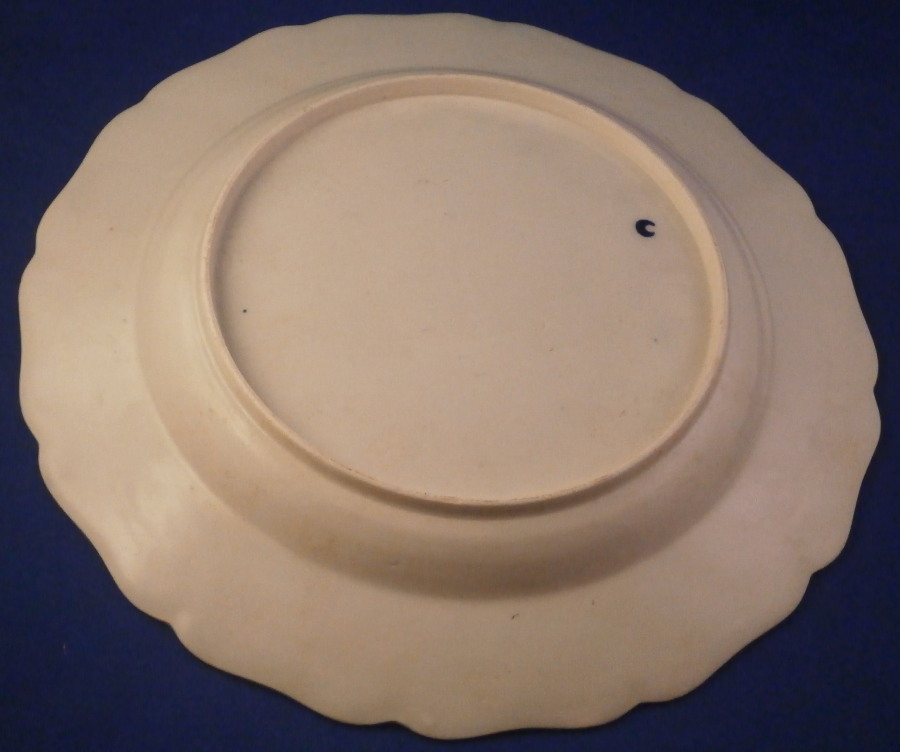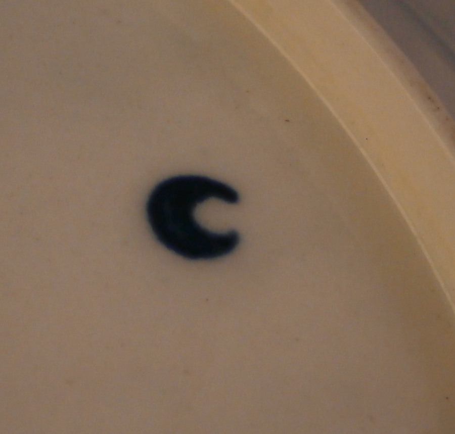 This is a rare dinner plate made by Worcester around 1770. It is decorated with a blue and white pattern called the pine cone pattern with a nice rim design and the center having a large blue and white design including what looks to be pine cones and some flowers and leaves. Rare to find this sized plate by them! The piece is in great condition with just some very very minor use marks and some firing flaws normal to early peices. It is marked underneath with the underglaze blue crescent mark as shown. It is 1.125 inches tall and 9.625 inches in diameter. Please email me for more information or other pictures.