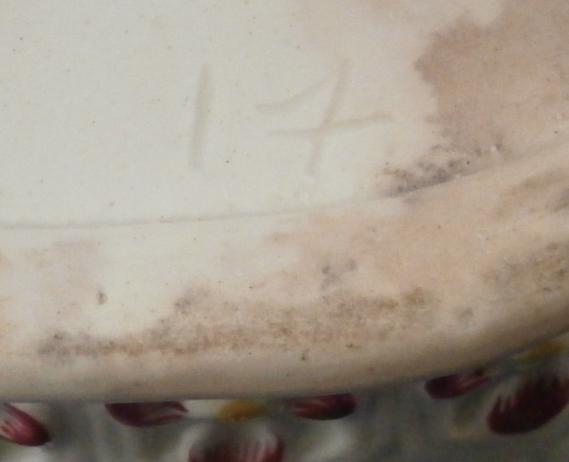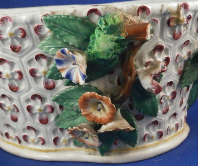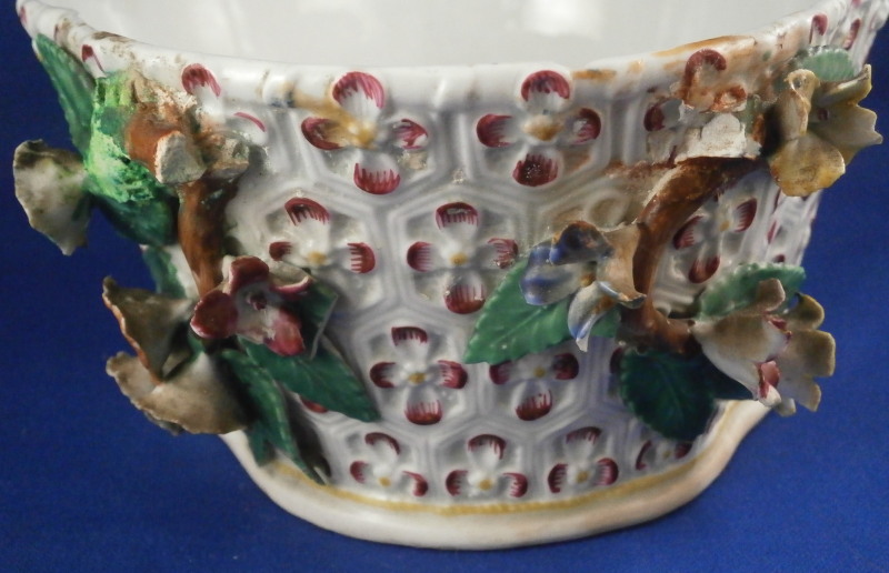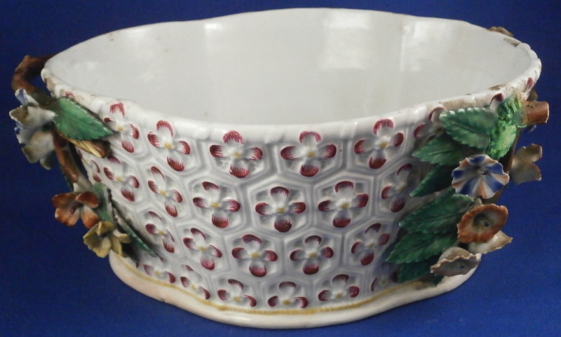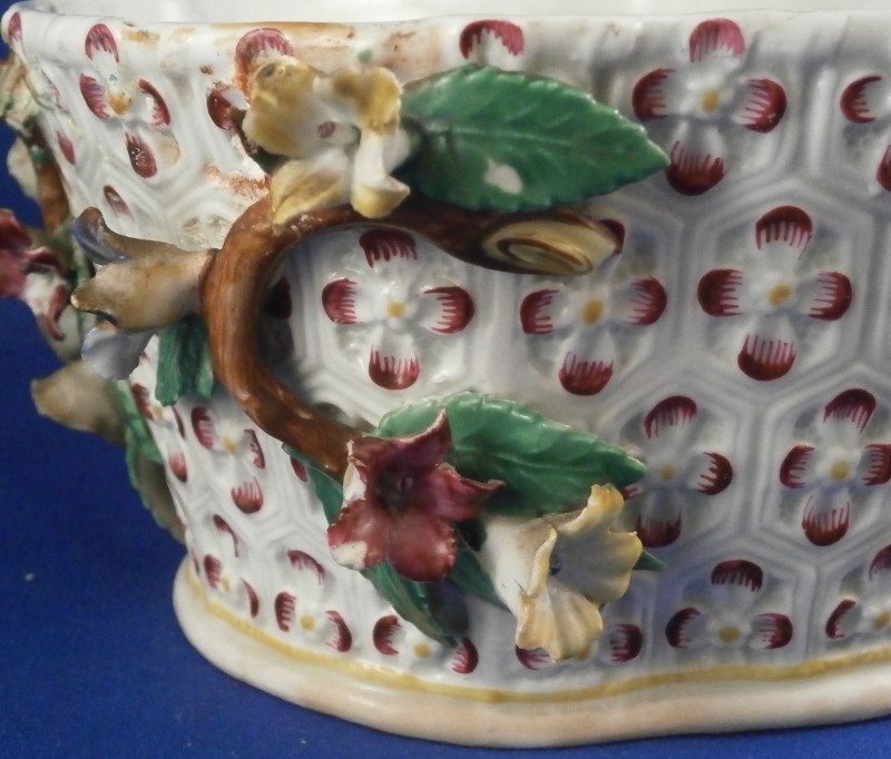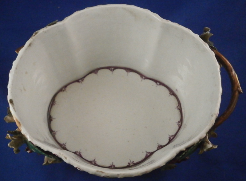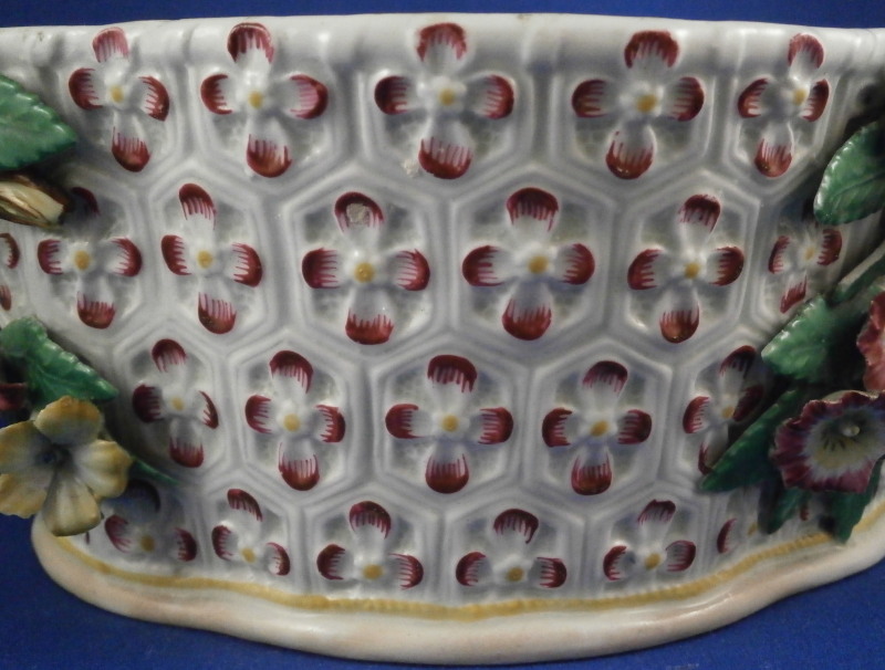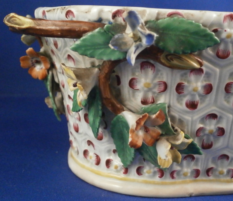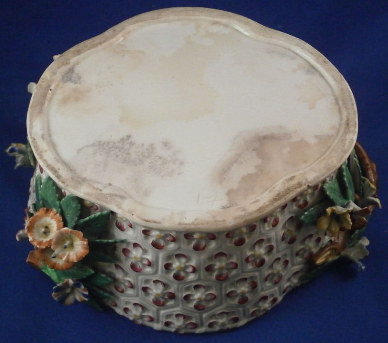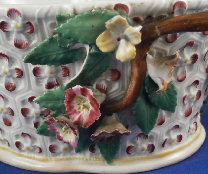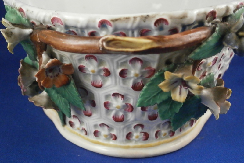 This is still a very nice basket made by Worcester in the 18th century. I think it was meant to hold chestnuts but I am not 100% on that. A really nice version with the solid walls with the relief decoration to the outside including puce and yellow flowers in hexagonal windows, The inside has a nice puce trim all around the outside edge of the bottom. Each side of the basket would have had a nice branch design handle to it but one is sadly lacking while the other has a hairline crack to one side. The handle is quite delicate and nicer than some others I ahve seen on this type of basket. The terminals of the handle have some superb leaves and flowers on it that are amazing in color and detail Amazingly only two of the flowers are missing and the rest are in much better shape than I would have expected with only two having a petal chipped off and the rest just some very minor edge chipping. The basket itself has one inside rim chip along the top edge and a small one to the bottom edge. It needs a good cleaning - it was filthy when I got it and I already did a quick cleaning but it needs some more work. The basket is unmarked underneath except for an incised number 17 which is not unusual at all. It is 3 inches tall, 7.25 inches wide (would have been wider if the other handle was still there) and 5.75 inches deep. Please email me for more information or other pictures.