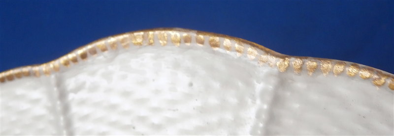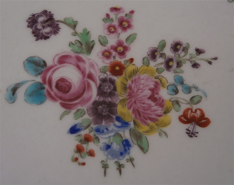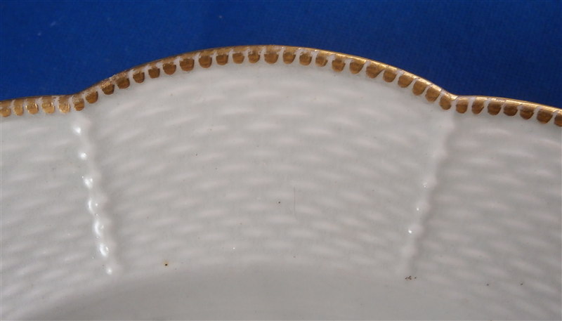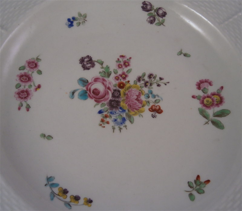 This is a nice plate made by Worcester in about 1770. It is handpainted with a bouquet of flowers in the center as well as lots of smaller single flowers with a relief moulded basketweave pattern to the rim and a gild lobed edge. The plate displays superbly but there has been a little work done on the edge though nothing major. An area of crazy overpaint reveals minor work underneath when held to a bright light. The plate is unmarked which is not unusual but there is an almost identical one in the V&A museum if you want to have a reference. The piece is 1.125 inches tall and has a diameter of 8.25 inches. Please email me for more information or other pictures.