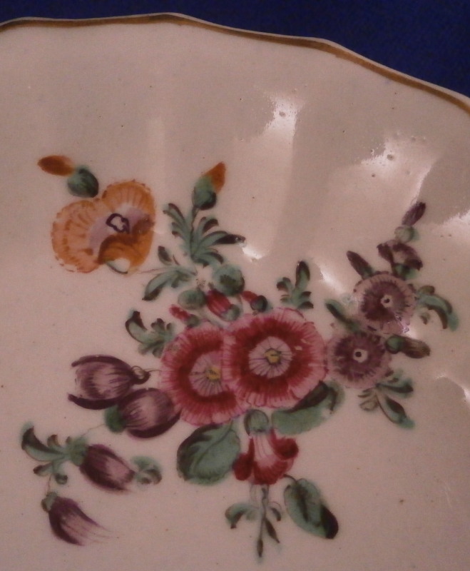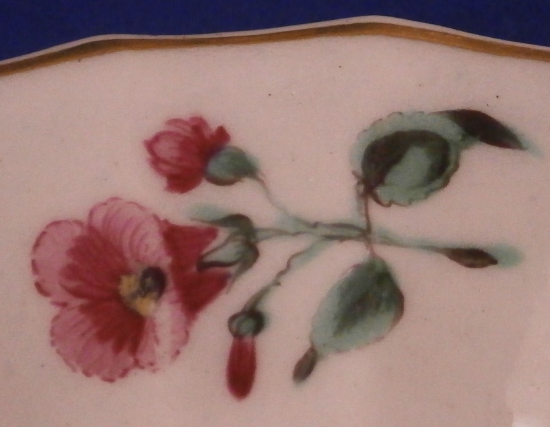 This is a really nice saucer made by Worcester around 1765. SImple in terms of decoration but stunning nonetheless. The piece is hand painted with a nice floral arrangement as well as a few single flowers with a simple gold trim to the top edge. It has my favorite kind of shape to it with the 16 sides. Worcester porcelain is superb - so thin with that slightly greenish translucency - just stunning! The set is in the perfect condition with some very minimal wear and some kiln dust to the back. The piece is marked with their fret mark in under glaze blue. The saucer is 1 inch tall and has a diameter of 5.5 inches. Please email me for more information or other pictures.