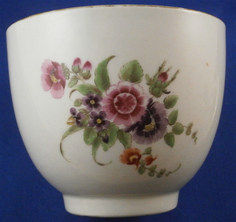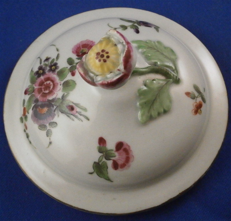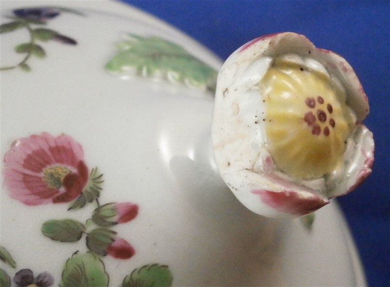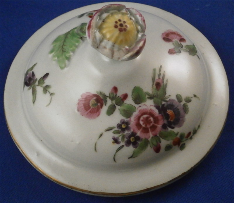 This is a great sugar bowl / dish with its lid made by Worcester in the 18th century. It is handpainted with a nice large floral arrangement to the main bowl as well as the lid and some small flwoers scattered throughout with gold trim to the edges and a great flower finial to the lid. The piece is very decorative and in great condition with some wear to the gilding and a chip to the flower finial. Some firing faults to the inside as shown. The piece with lid is 4.75 inches tall and has a diameter of just under 4 inches. The piece is not marked which is not unsusual for their early ware. Please email me for more information or other pictures.