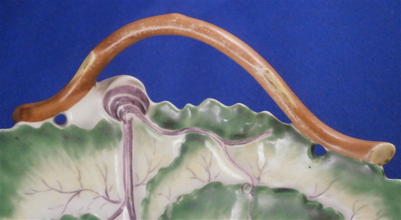 This is a rare leaf dish in the form of two overlapping vine leaves made by Worcester in around 1765. It is hand painted superbly like a true leaf with the veins and the edges are colored in green and a light yellow color. Nice branch handle. The center has a floral arrangement as well as two single flowers painted on it. This dish is one of a perfect pair which is rather hard to find - the other one also listed on my site. The dish is in superb condition with some minor wear mostly to the enamels of the branch handle. It is unmarked which is not unusual for these early pieces but definitely made by them during this period! The piece is 2.125 inches tall at the handle with the dish being about 1.375 inches tall, 6.625 inches wide and 7.625 inches long. Please email me for more information or other pictures.