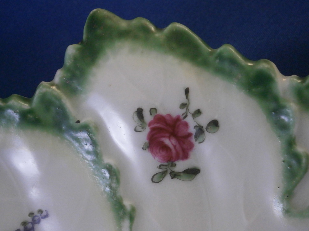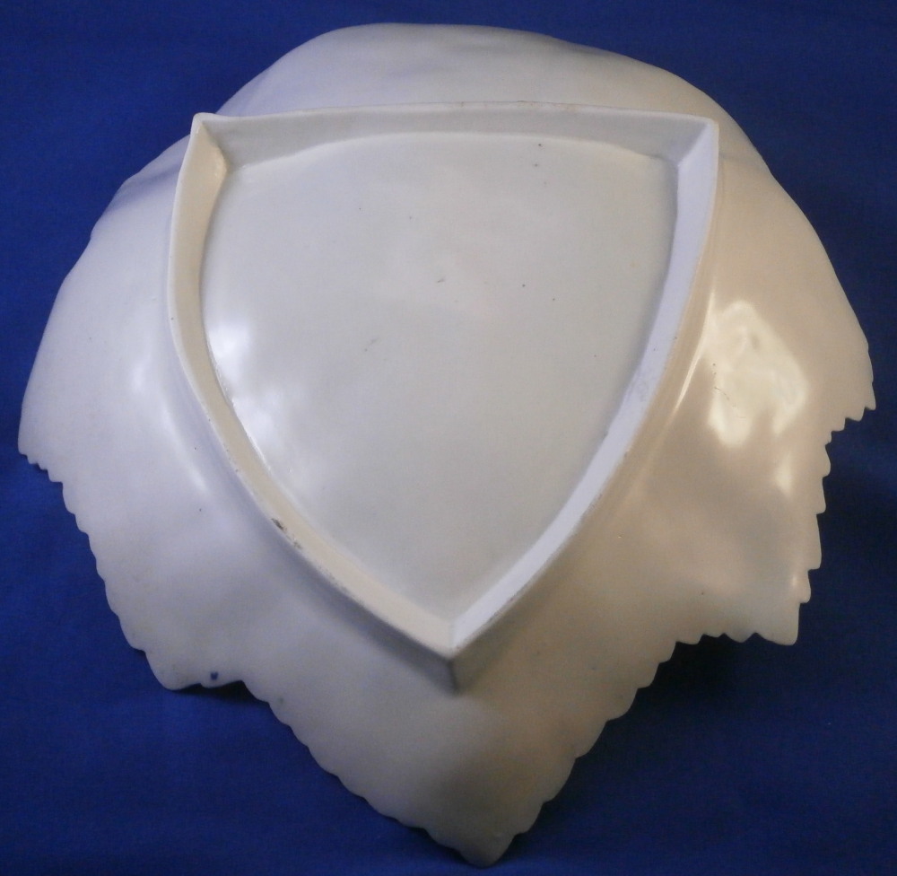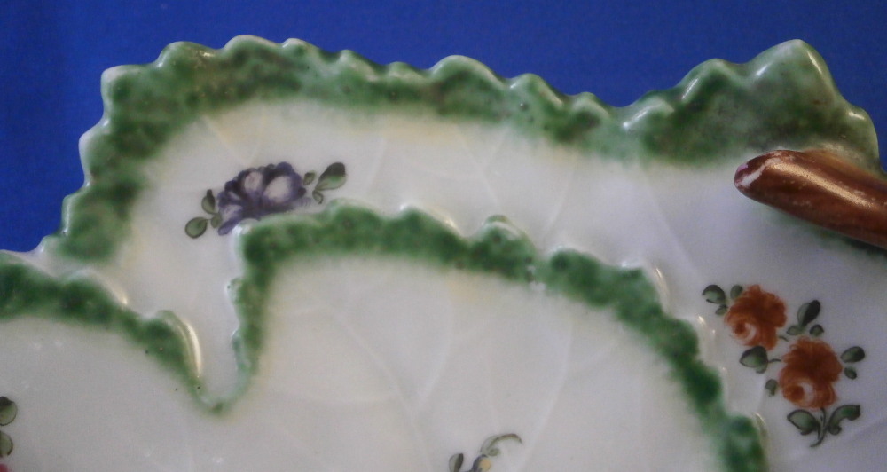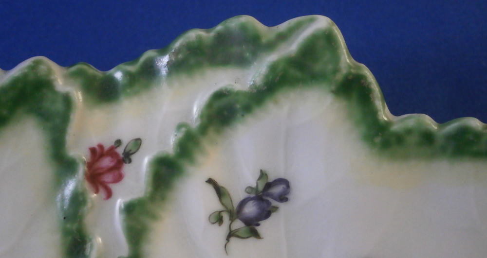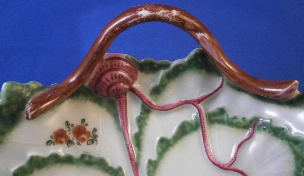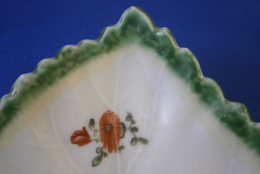 This is a really nice leaf dish in the form of two overlapping vine leaves made by Worcester in around 1765. It is hand painted superbly like a true leaf with the veins in relief and the edges are colored in green and a light yellow color. Nice branch handle. The center has a large hand painted floral arrangement as well as some single flowers all around. The dish is in superb condition with just some wear to the branch handle which is to be expected after 250 years. The flowers in the center have no stacking wear or use marks which is incredible. No chips or repairs either just a weird glaze flaw to the udnerside as shown. Not sure what that is from but it is invisible when on display. Just a really superb example! The dish is unmarked which is not unusual for these early pieces but definitely made by them during this period! It is 2.5 inches tall at the handle with the dish being about 1.875 inches tall, 8 inches wide and 9.625 inches long. A nice sized example! Please email me for more information or other pictures.