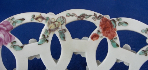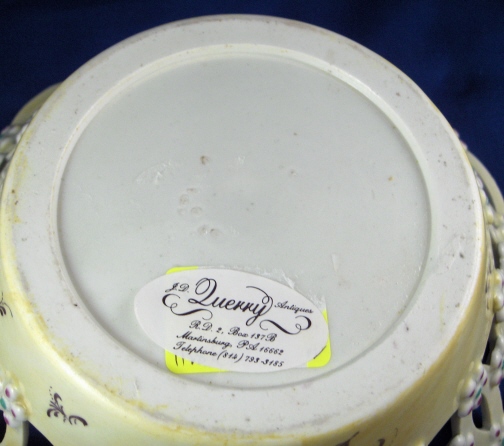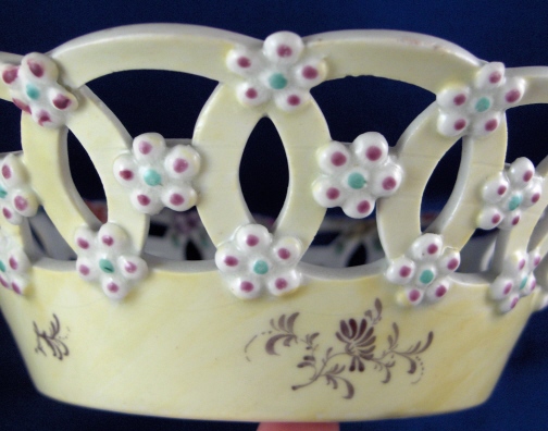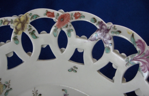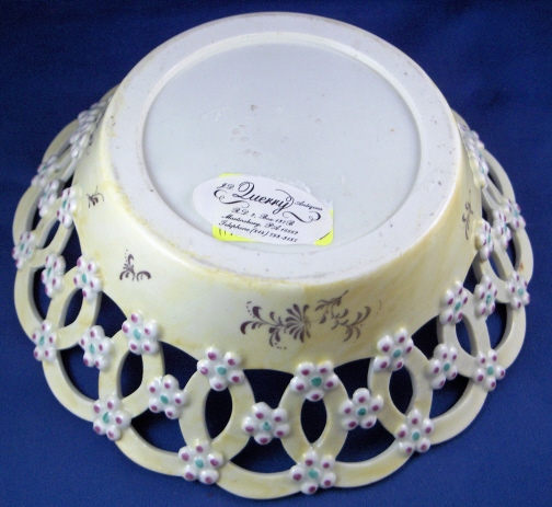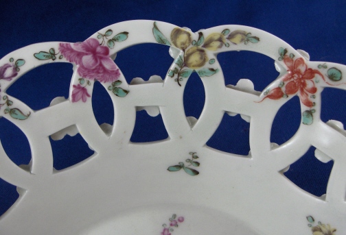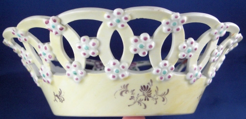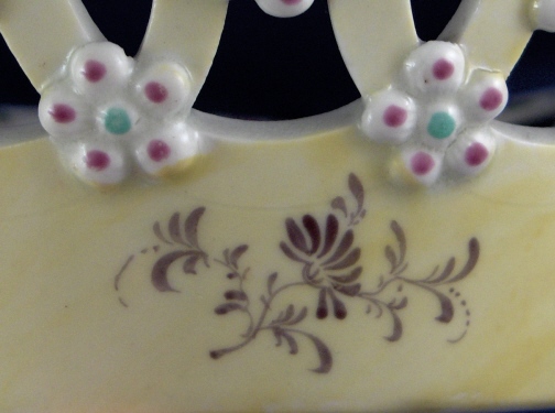 This is a superb reticulated basket made by Worcester around 1770. It is handpainted with a large polychrome floral arrangement on the bottom inside with lots of smaller flowers all along the rim. The outside of the basket has a yellow ground color that is slightly uneven in tone with black flowers along the bottom and applied puce and green flowers all along the reticulated part. An amazing basket and about as good as it gets from Worcester! The basket is in great condition with a tiny bit of wear and one arch of the top rim has been worked on. Doesn't look like anything major and it was done perfectly and is close to impossible to spot! The basket is unmarked underneath which is not unusual at all. It is 2.5 inches tall and has a diameter of 8.375 inches. Please email me for more information or other pictures.