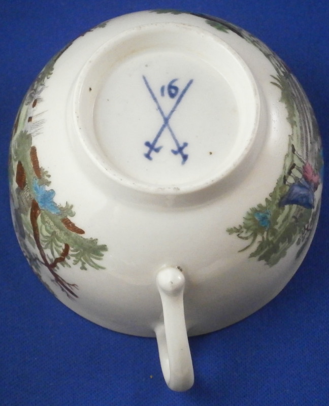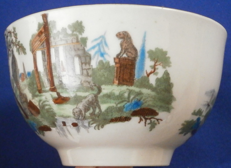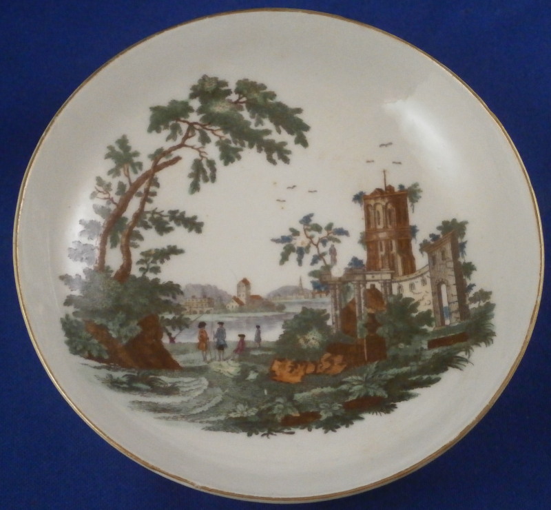 This is a rare cup and saucer made by Worcester in around 1765. Both are decorated with a black print that was hand colored in. Gold trim to the edges and a black line around the top inside of the cup. This type of decoration was a highly unusual practise at Worcester! There is a large ruin scene in the center of the saucer with a city in the background and one on each side of the cup. The set is in superb condition with some very minor wear and three glaze bubbles that popped and left circular marks of missing glaze and paint. Not obvious at all and the set displays perfectly. Both pieces are marked underneath with the under glaze blue crossed swords mark as well as a number 6 on the saucer and 16 on the cup. The saucer is 1 inch tall and 5 inches in diameter. The cup is 1.875 inches tall and 3.25 inches in diameter. Please email me for more information or other pictures.