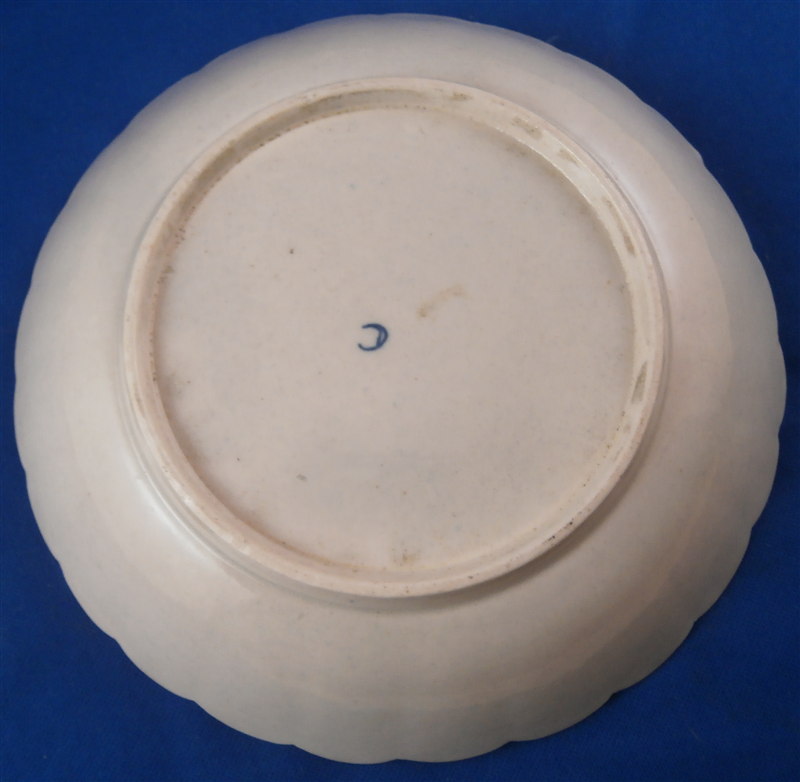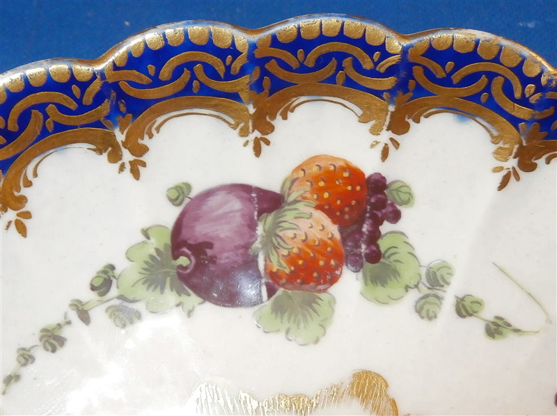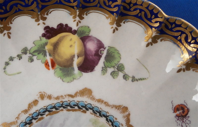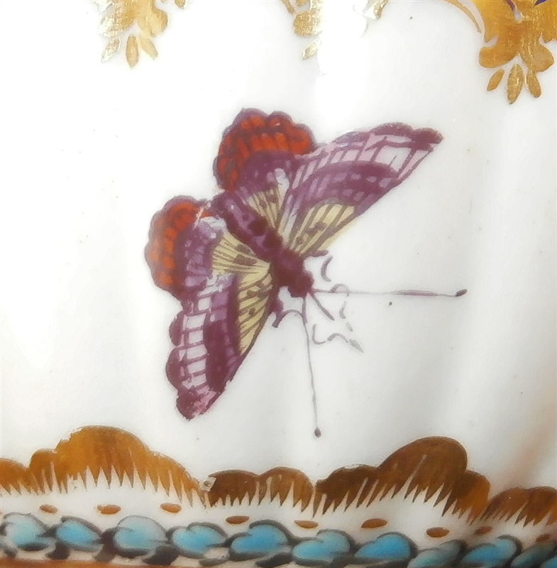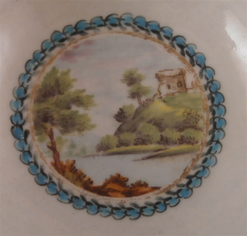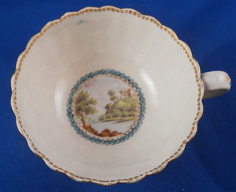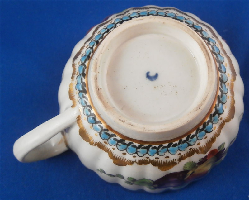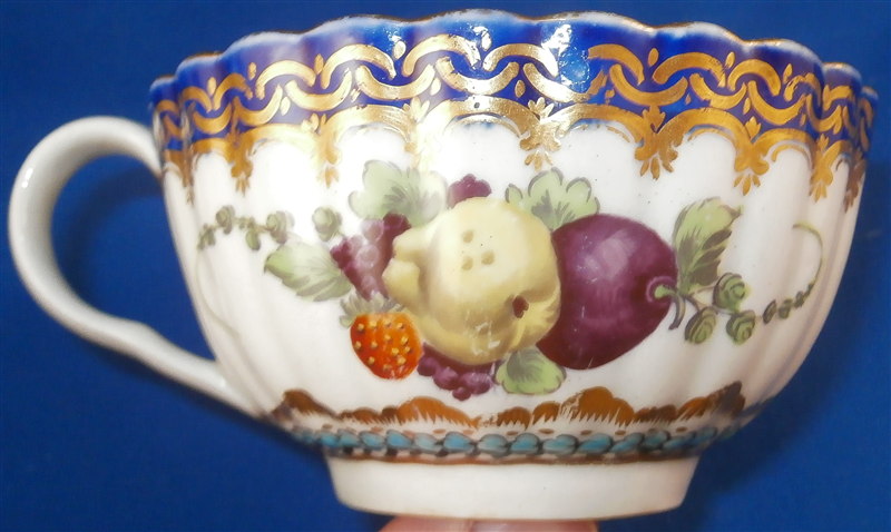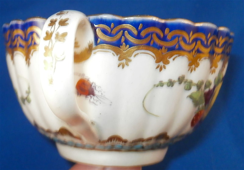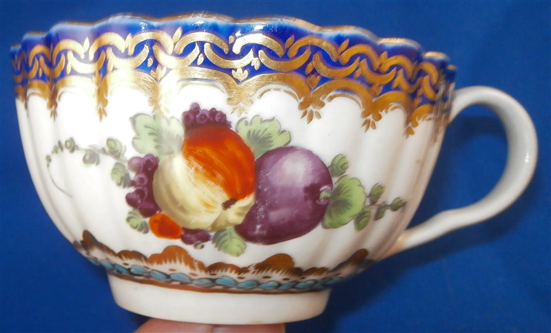 This is a superb fluted cup and saucer made by Worcester around 1770. This is a set with a decoration known from a service made for the Earl of Dalhousie. Both pieces are is handpainted with a superb polychrome scene including trees and a building as well as some water and a nice sky. The scenes are surrounded by a raised turquoise trim with some fancy gilding on the saucer. The saucer and outside of the cup have some great fruit arrangements painted on them as well as those amazing insects I love so much on Worcester pieces. The nicely shaped edge has a cobalt blue trim with lots of fancy gilding over it. All in all a stunning set and one of the nicest they made during this period! The quality of the painting is top notch. The cup and saucer are both in great condition with some wear mostly to the saucer and gold trim on the edges. The cup is 1.875 inches tall and has a diameter of 3.375 inches. The saucer is 1 inch tall and has a diameter of 5.25 inches. Each piece is marked with their underglaze blue crescent mark as shown. Please email me for more information or other pictures.
