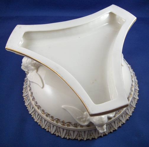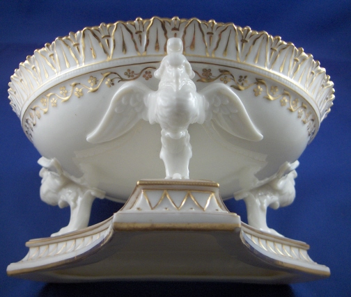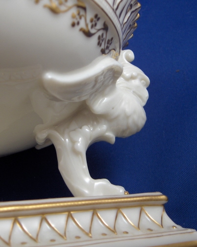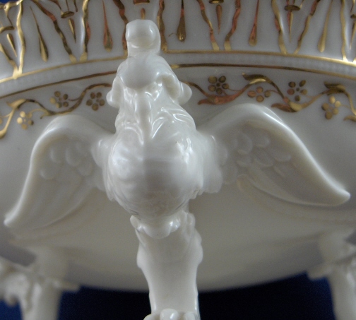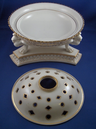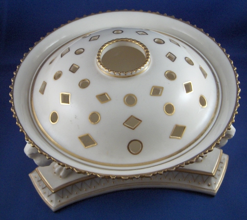 This is a large potpourri lidded dish made by Worcester in about the mid to later 19th century during the Grainger period. The bottom part is a nicely gilded triangular base on which three griffins are holding up a round bowl. Lots of superb relief detail and gold highlights. The lid has diamond and round shaped holes in it as well as a central larger hole all highlighted with gilding. The set is in perfect condition with almost no wear to the gilding. The set is 5 inches tall and 8 inches in diameter. It is sadly unmarked which is not too uncommon during this period but unmistakably Worcester from the Grainger period. Please email me for more information or other pictures.