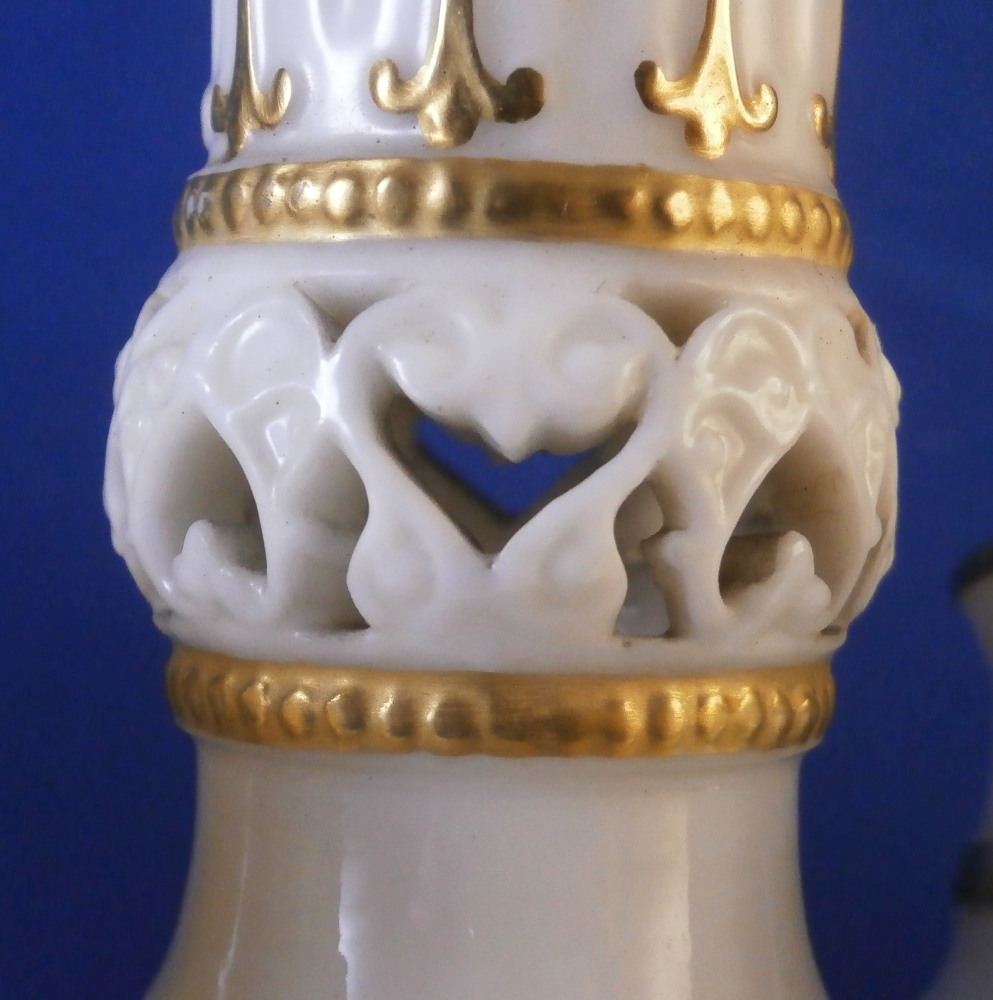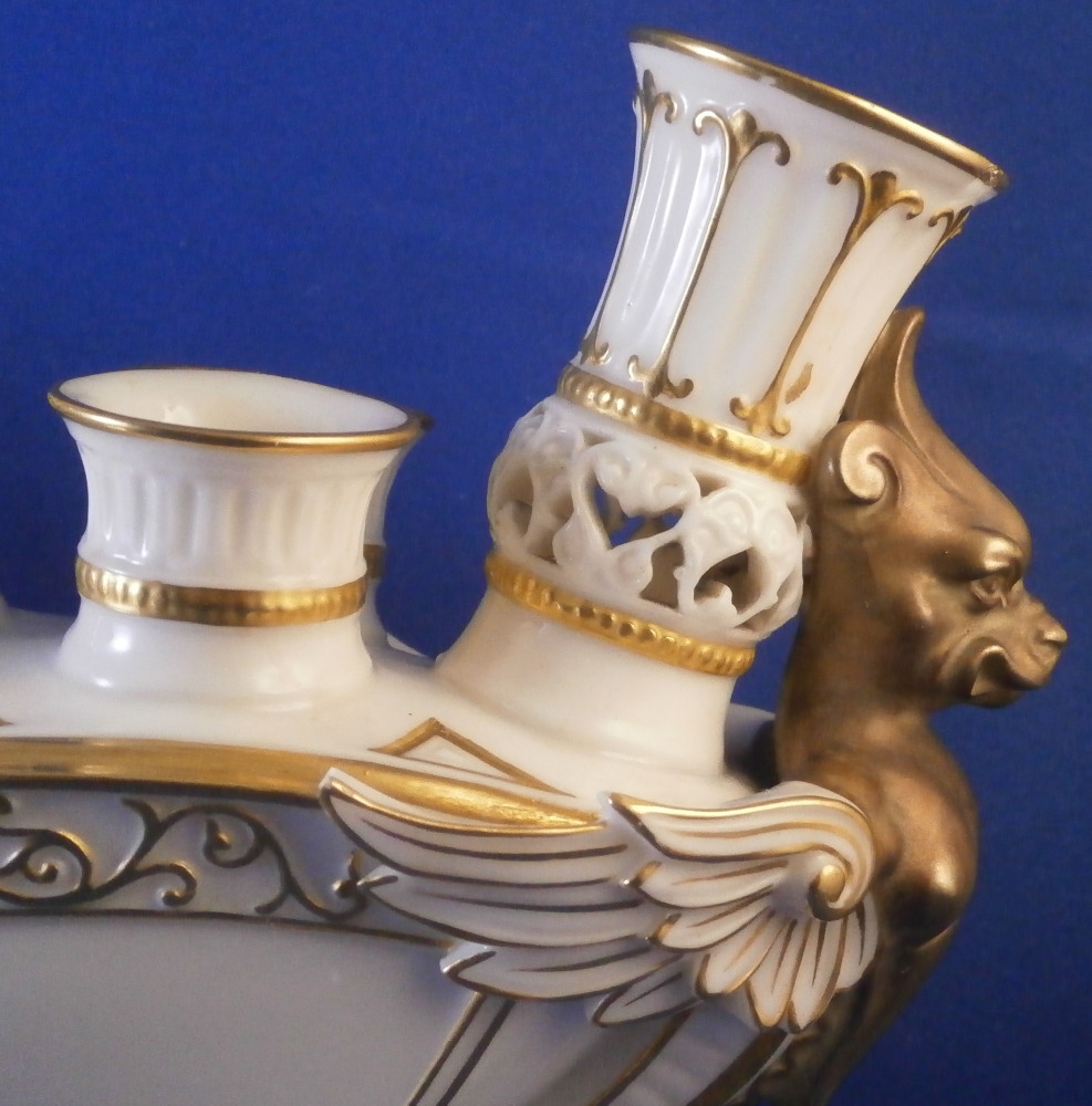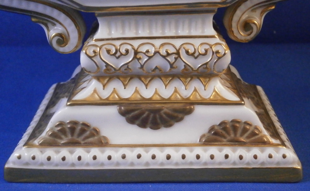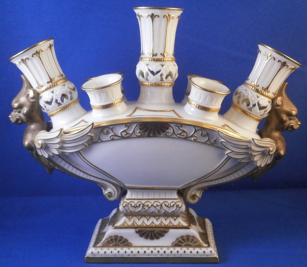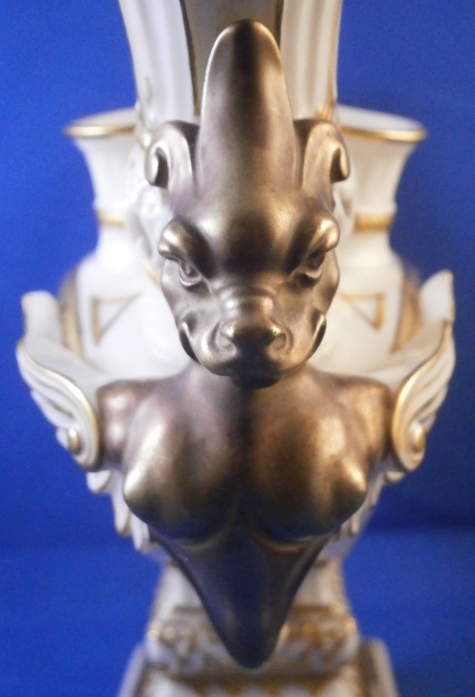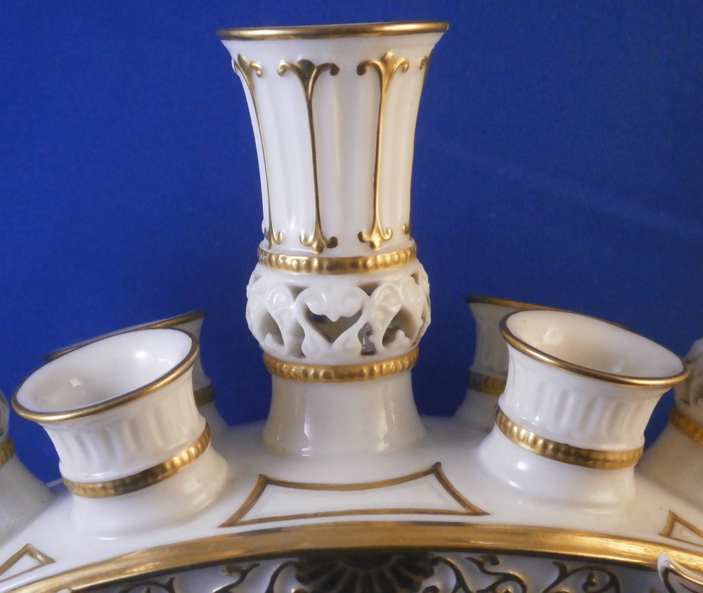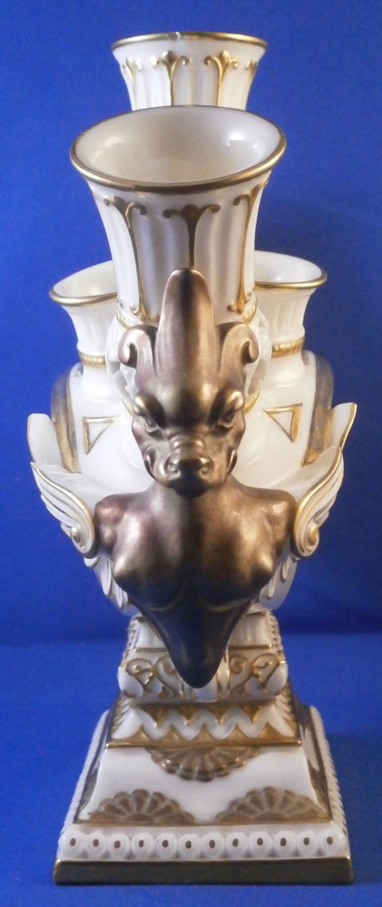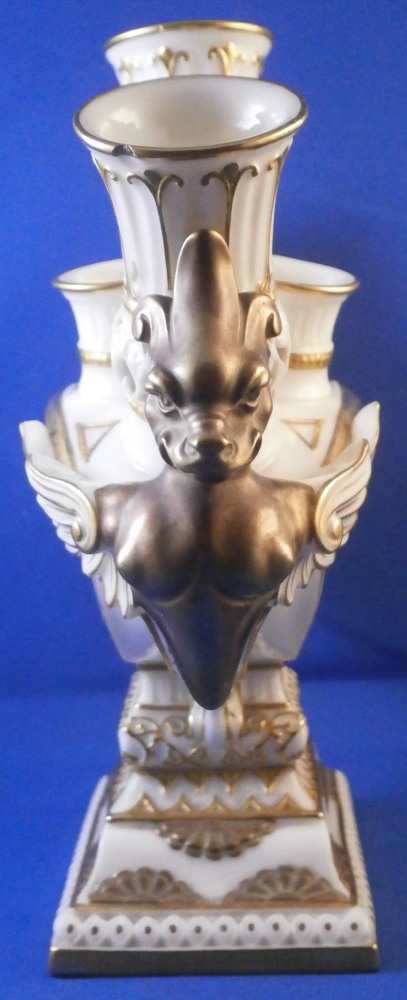 This is a really superb vase made by Worcester in 1880. The vase is as fancy as they come with three taller openings that have a reticualted ring around the bottom as well as four smaller and lower ones. Each end has a winged creature similar to a Griffon to it that are painted in bronze tones and there is lots of relief design around the base and sides of the piece that are highlighted with gilding. It's a stunning looking piece which would look amazing with some flowers in it. The piece is in great condition with a small chip to the top edge of two of the larger openings and to one of the wing tips as well as a tiny one to another as shown but it does display perfectly. The vase is 7.25 inches tall, 8.75 inches wide and 2.75 inches deep. It is marked underneath with the puce Worcester mark with the date letter R for 1880 as well as the impressed Worcester mark, some incised numbers and the gilt letter BK as shown. And to make it possibly even better I do have it's matching second piece up for sale as well if anyone would want an stunning pair of these! Please email me for more information or other pictures.