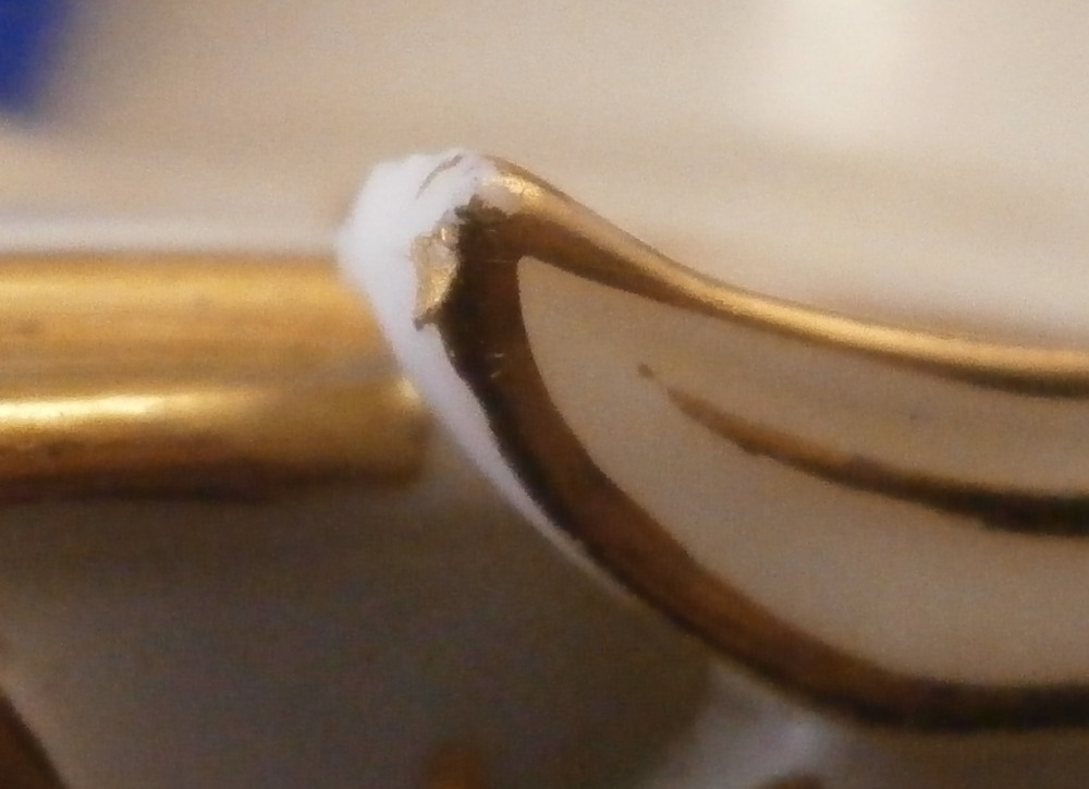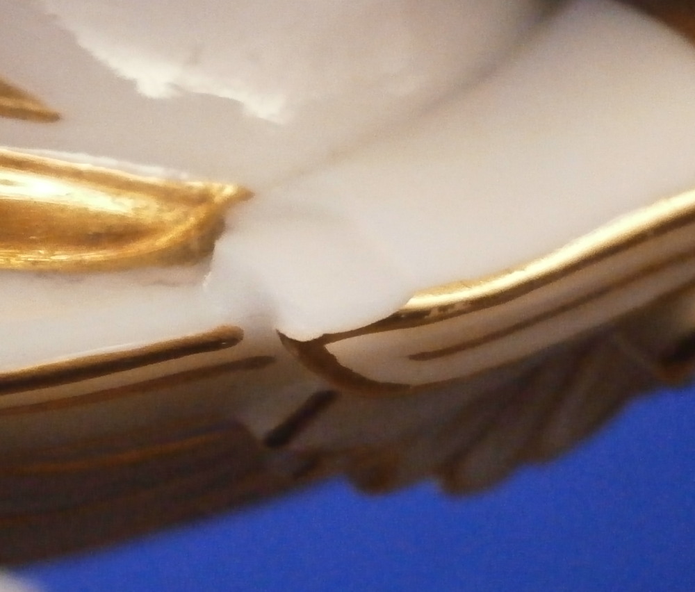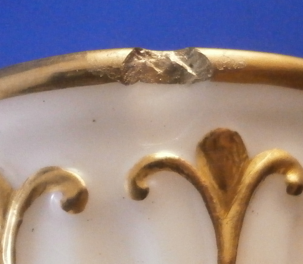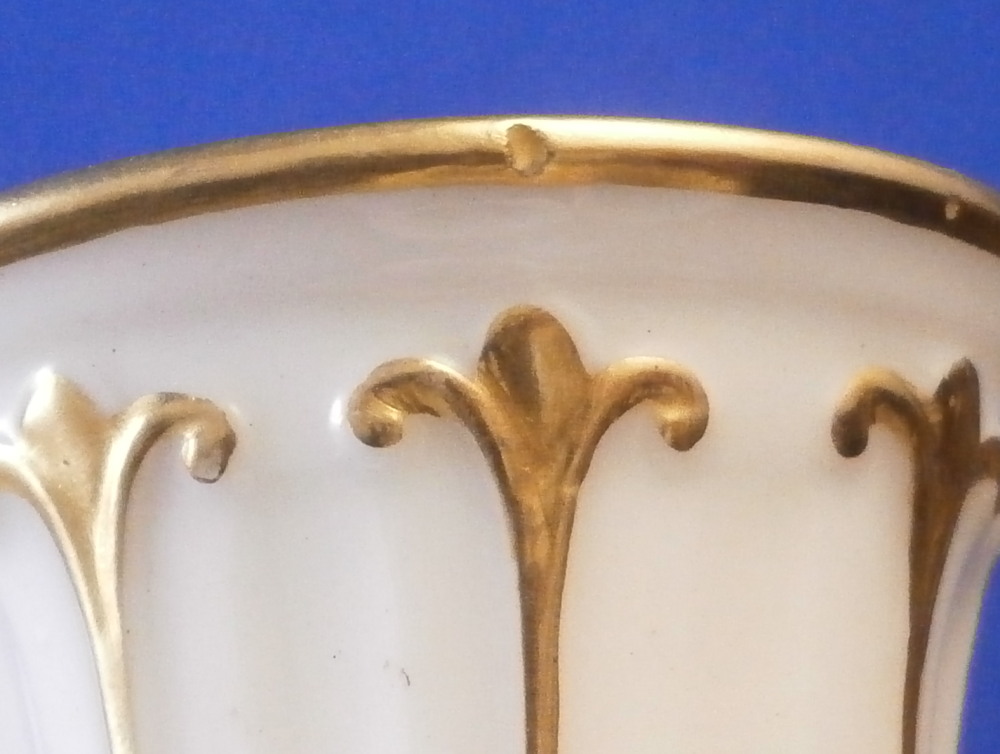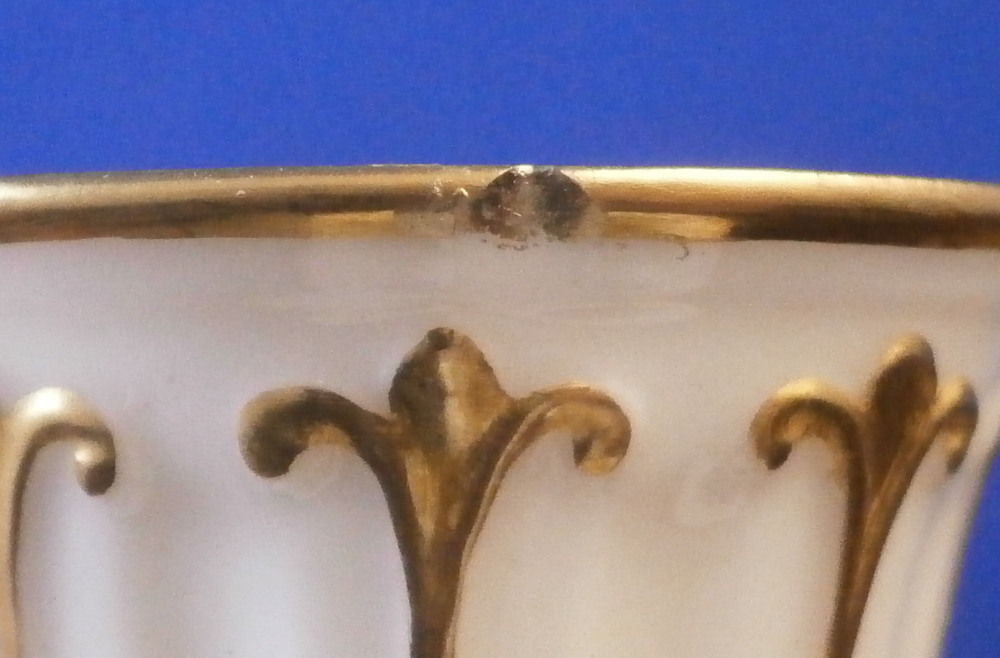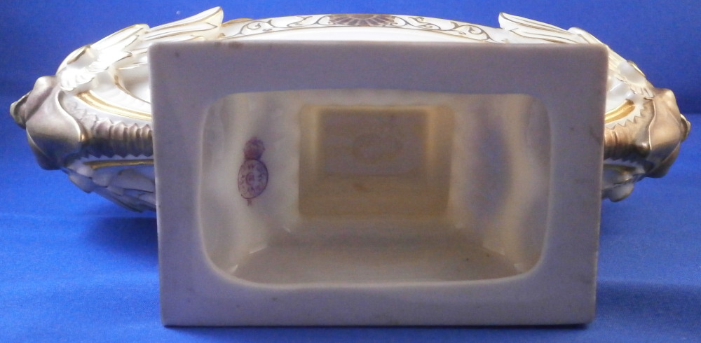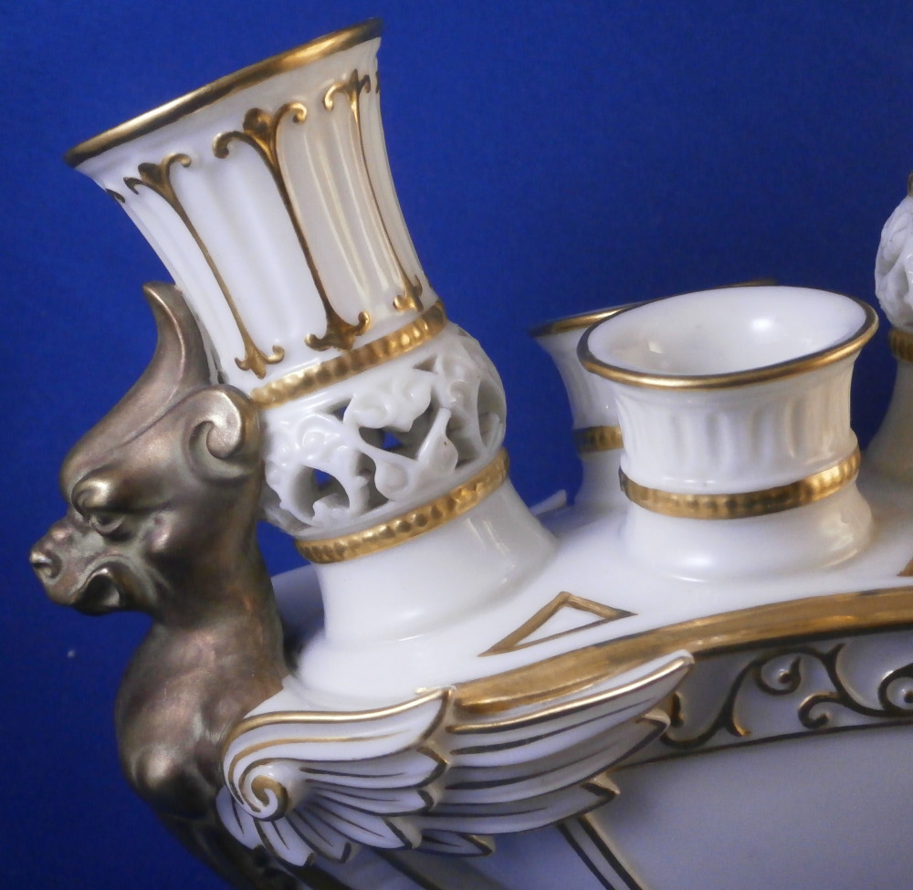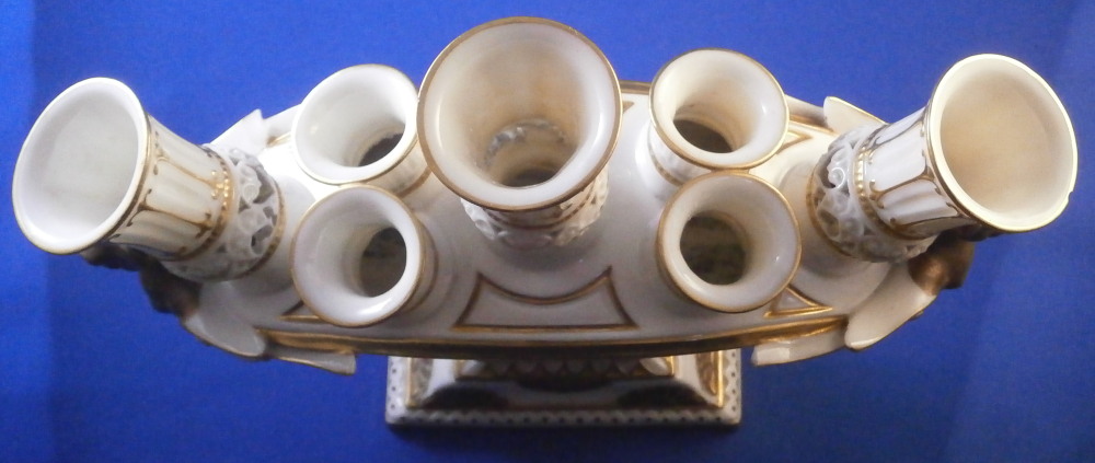 This is a really superb vase made by Worcester in 1880. The vase is as fancy as they come with three taller openings that have a reticualted ring around the bottom as well as four smaller and lower ones. Each end has a winged creature similar to a Griffon to it that are painted in bronze tones and there is lots of relief design around the base and sides of the piece that are highlighted with gilding. It's a stunning looking piece which would look amazing with some flowers in it. The piece is in great condition with a small chip to the top edge of two of the larger openings and to one of the wing tips as well as a tiny one to another as shown but it does display perfectly. The vase is 7.25 inches tall, 8.75 inches wide and 2.75 inches deep. It is marked underneath with the puce Worcester mark with the date letter R for 1880 as well as the impressed Worcester mark, some incised numbers and the gilt letter BK as shown. And to make it possibly even better I do have it's matching second piece up for sale as well if anyone would want an stunning pair of these! Please email me for more information or other pictures.
