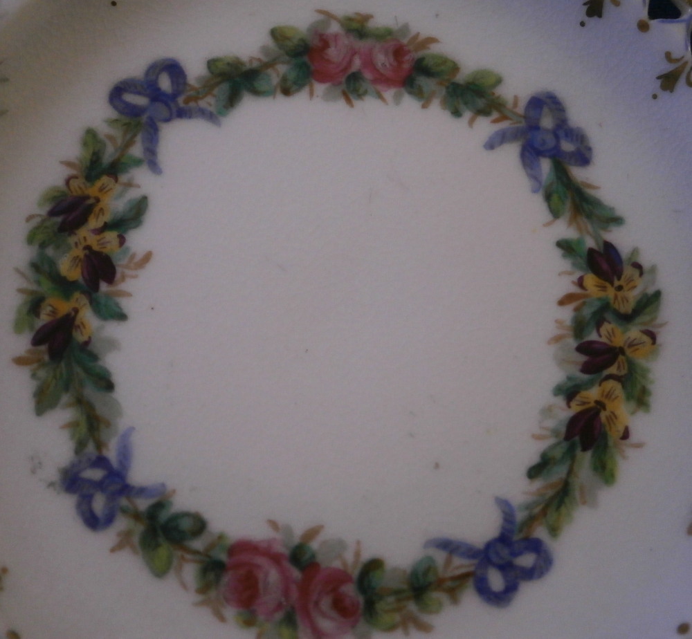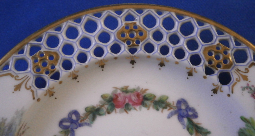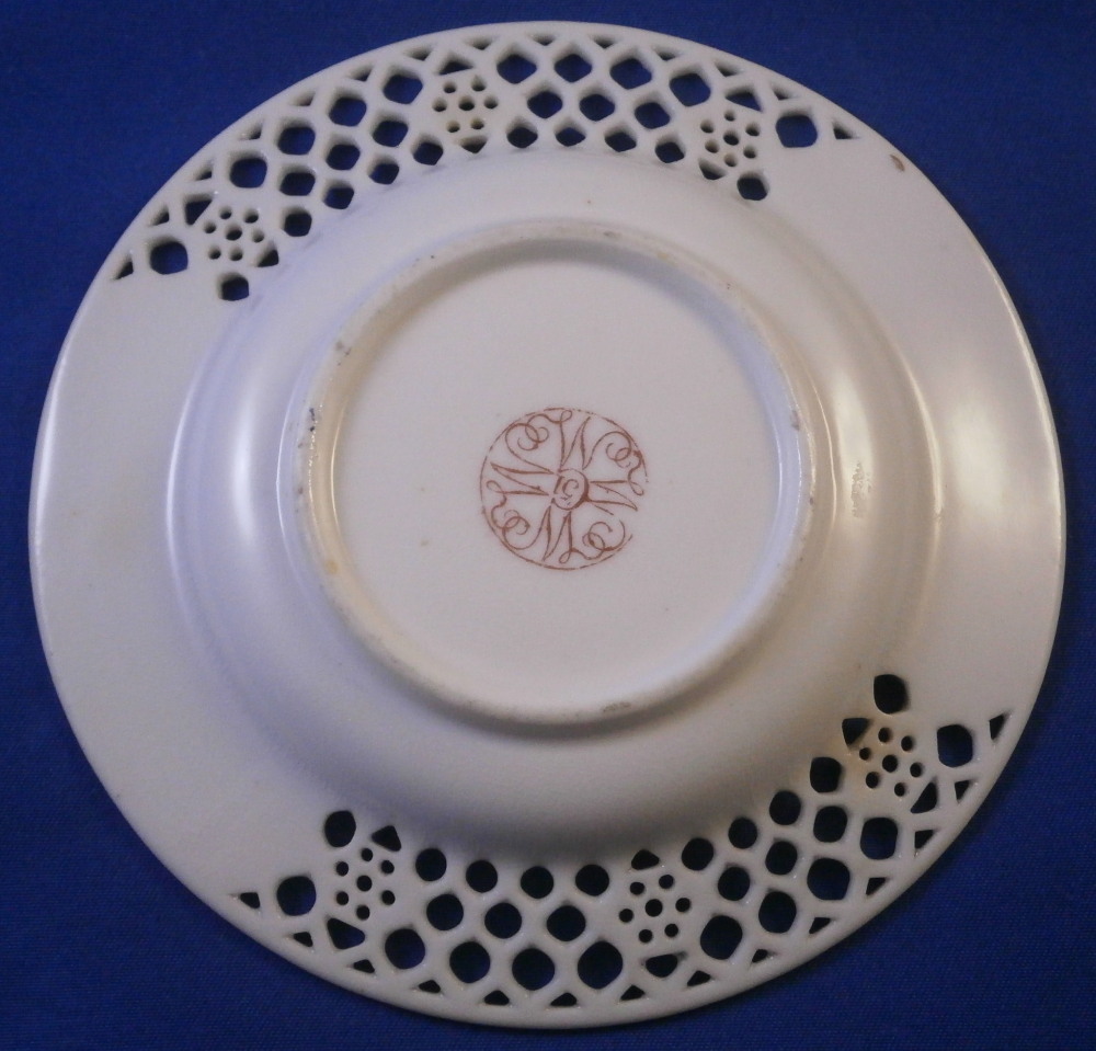 This is a superb reticulated saucer made by Worcester in the mid 19th century. I am unsure as to the exact date as it neither has a crown above it nor any date code or impressed marks. So if anyone out there has a clue as to why a quick note would be appreciated. It might be a very early George Owen piece who off course is quite famous for these types of reticulated / pierced pieces. The saucer has two reticulated sections along the rim with a superb bird scene and a superb fruit scene in between these sections. The center has a floral wreath with bows to it and there is some gold trim along the rim and going into the well of the dish. This blue lines along the reticulated sections. A very delicate design and the hand painting is top notch! I have never come across this nice a design on one of these saucers! The saucer is in great condition with a minor touch of wear to the gilding along the edge and some fine crazing in areas of the white parts. It displays perfectly - jsut looking for its cup now :) The saucer is just over 0.5 inches tall and has a diameter of 4.125 inches in diameter. Quite tiny and delicate! The saucer is marked with the circular Worcester mark with the number 51 inside but no crown or date code at all. Please email me for more information or other pictures.