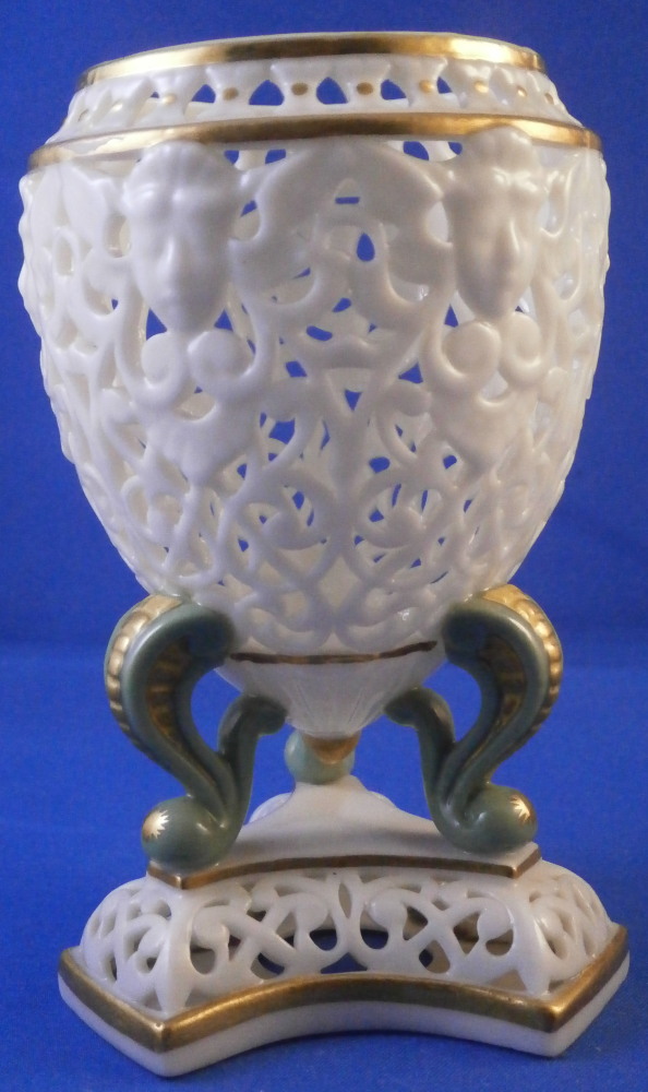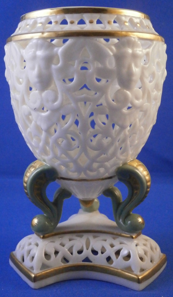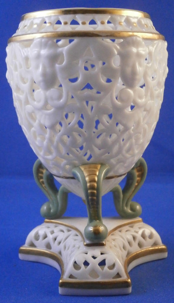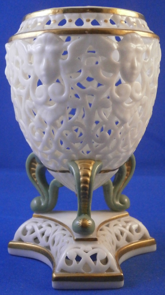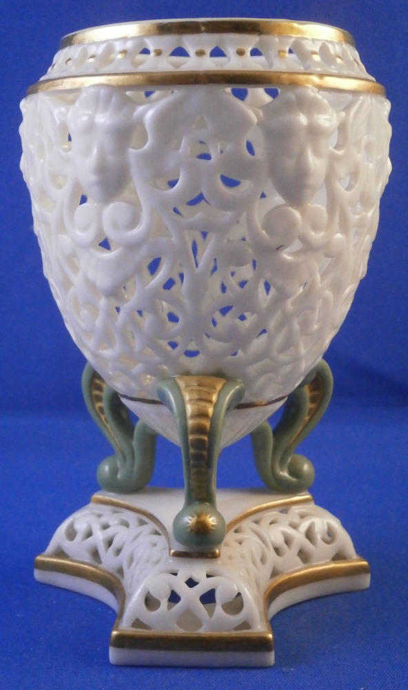 This is a fancy reticulated potpourri dish / vase with its lid made by Worcester in about the mid to later 19th century during the Grainger period. The bottom part is sitting on a triangular shaped base that is also reticulated on three feet that are painted in a greenish color with some nice gilding to them. The main body is superbly reticulated with faces all around and the lid is also well reticulated and very nice. The porcelain is really thin and there is a ton of detail to the reticulation! A bit of gold trim to the edges which makes this piece very elegant. The entire piece is so light and thin one has to wonder how it survived in superb condition! No cracks or hairlines just one spot of gold trim wear to the lid edge. The main piece is marked underneath with some numbers as shown. The vase with the lid in place is 4.625 inches tall and 2.5 inches in diameter. Please email me for more information or other pictures.