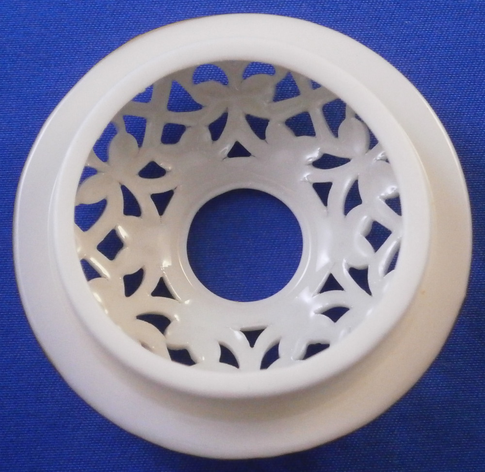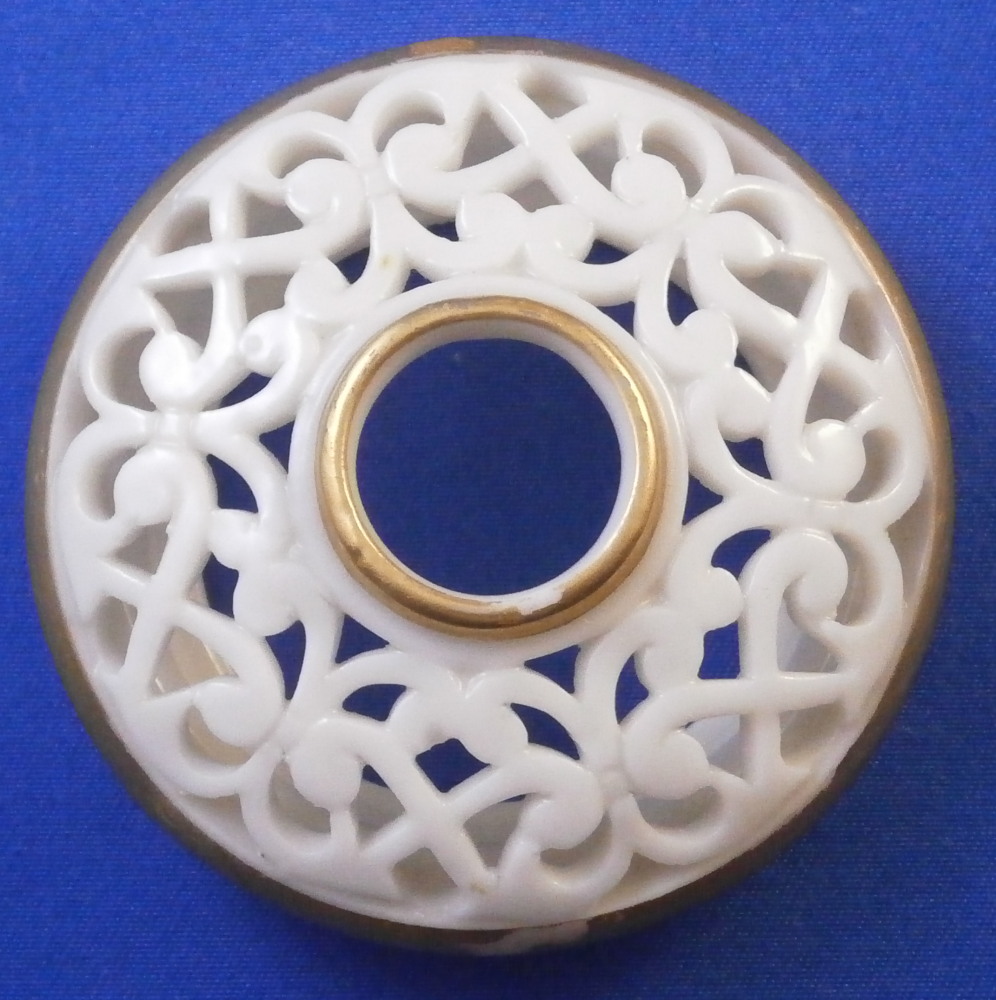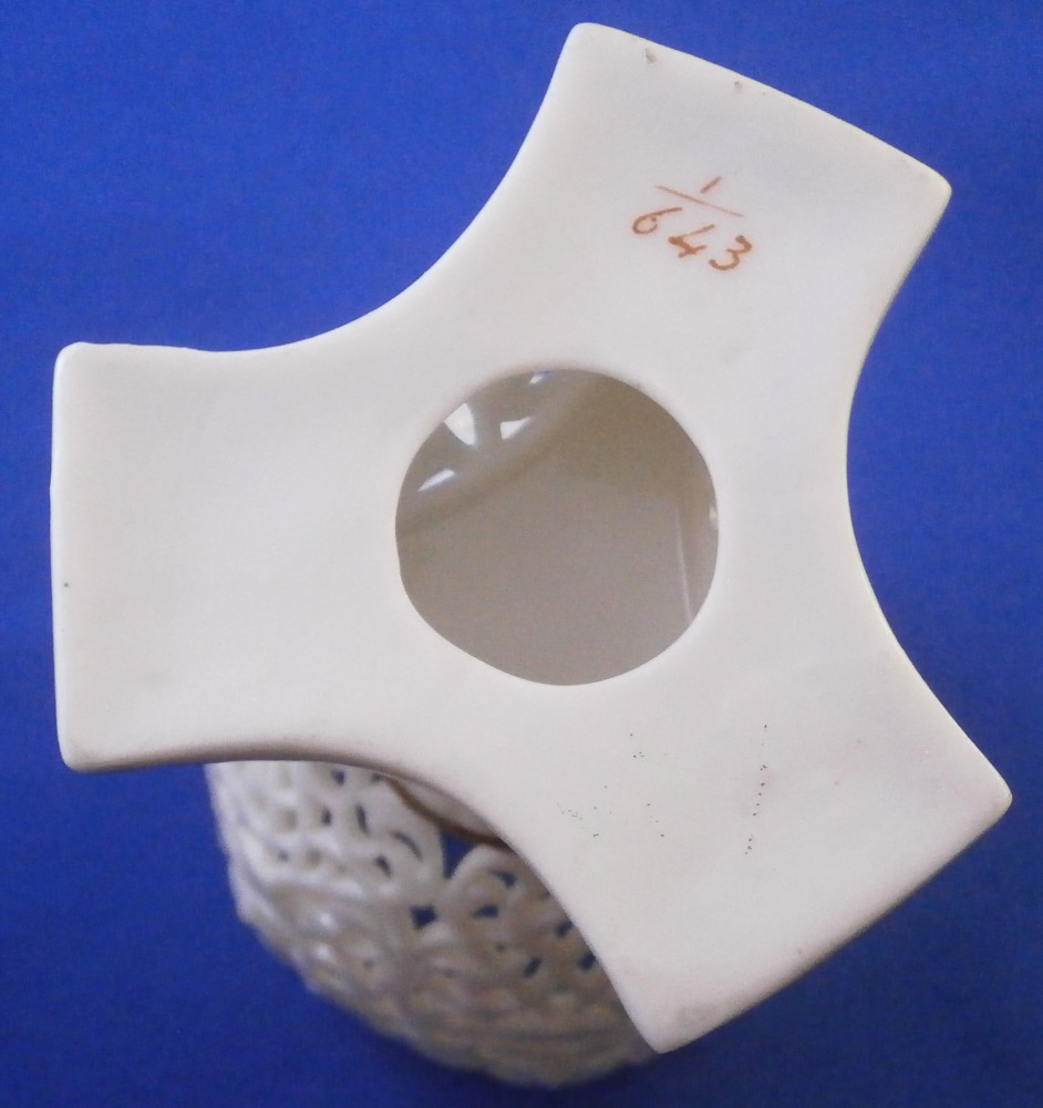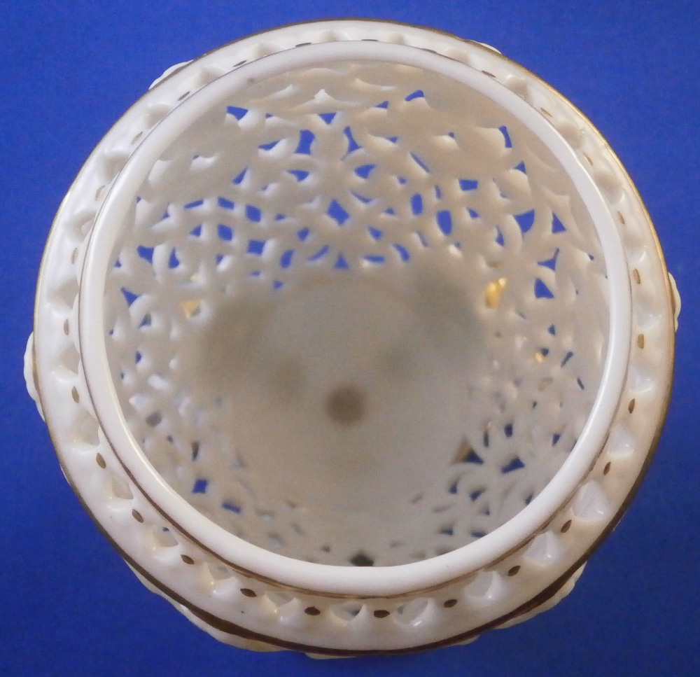 This is a fancy reticulated potpourri dish / vase with its lid made by Worcester in about the mid to later 19th century during the Grainger period. The bottom part is sitting on a triangular shaped base that is also reticulated on three feet that are painted in a greenish color with some nice gilding to them. The main body is superbly reticulated with faces all around and the lid is also well reticulated and very nice. The porcelain is really thin and there is a ton of detail to the reticulation! A bit of gold trim to the edges which makes this piece very elegant. The entire piece is so light and thin one has to wonder how it survived in superb condition! No cracks or hairlines just one spot of gold trim wear to the lid edge. The main piece is marked underneath with some numbers as shown. The vase with the lid in place is 4.625 inches tall and 2.5 inches in diameter. Please email me for more information or other pictures.