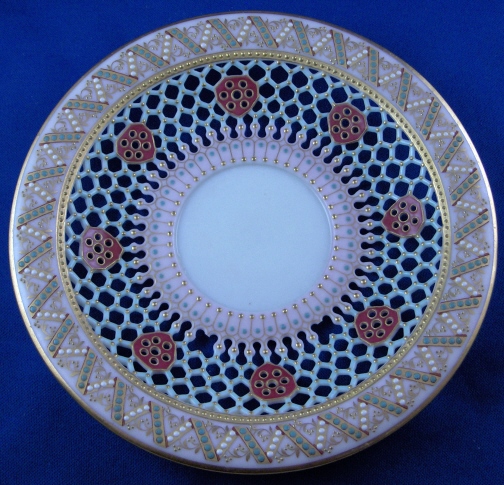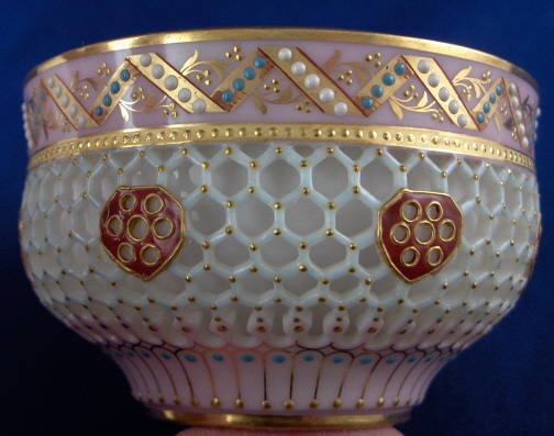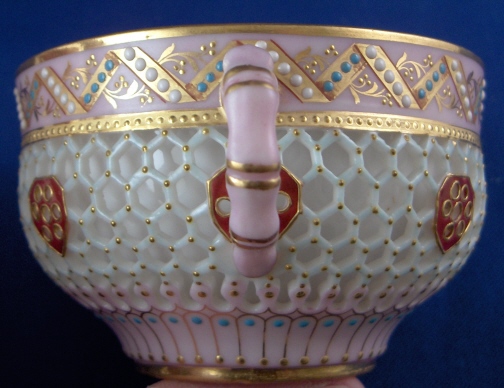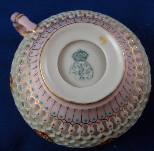 This is a superb cup and saucer made by Worcester in the late 19th century. George Owen was / is quite famous for these types of pieces. The cup is double walled the outside wall also being reticulated. while the saucer is reticulated as well. A very delicate design with the best part being that is is also painted very nicely and with lots of color and gold and even raised "jewel" bead along the rim. One of the nicest cups one can find from this period! A truly amazing cup and saucer. The cup is in perfect condition while the saucer is missing two small pieces of the reticulation as shown which would be an easy fix but they display very nicely this way! The cup is 2.125 inches tall and 3.375 inches in diameter. The saucer is 0.75 inches tall and has a diameter of 6.125 inches in diameter. The cup is marked underneath with the green Worcester mark with a yellow H4 as a painter's mark and the saucer has a faintly impressed mark with a pink C. as a painter's mark as shown. Please email me for more information or other pictures.