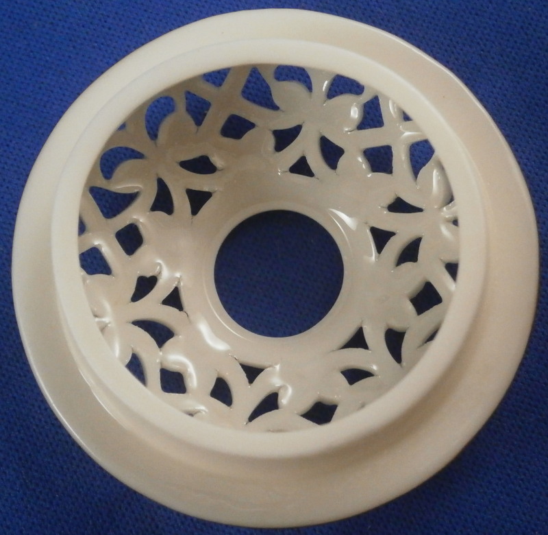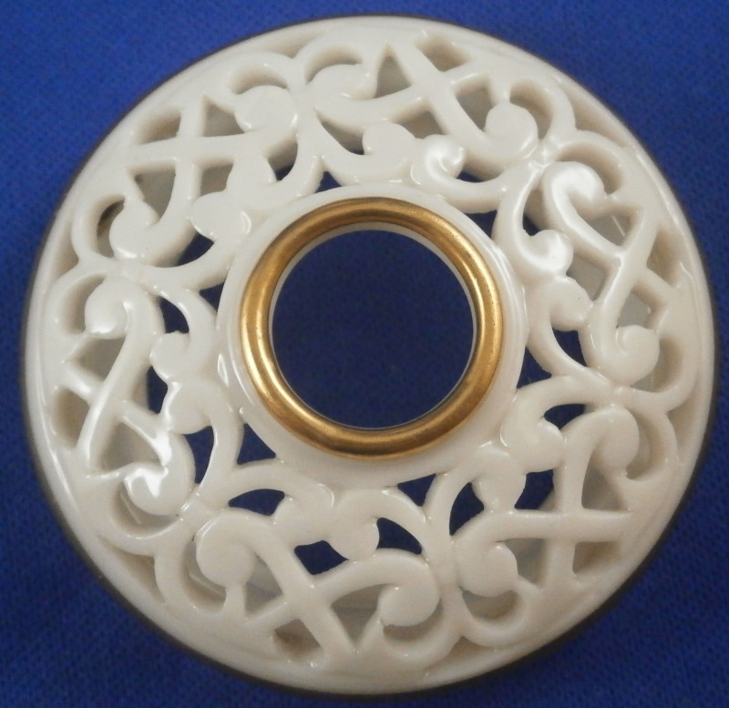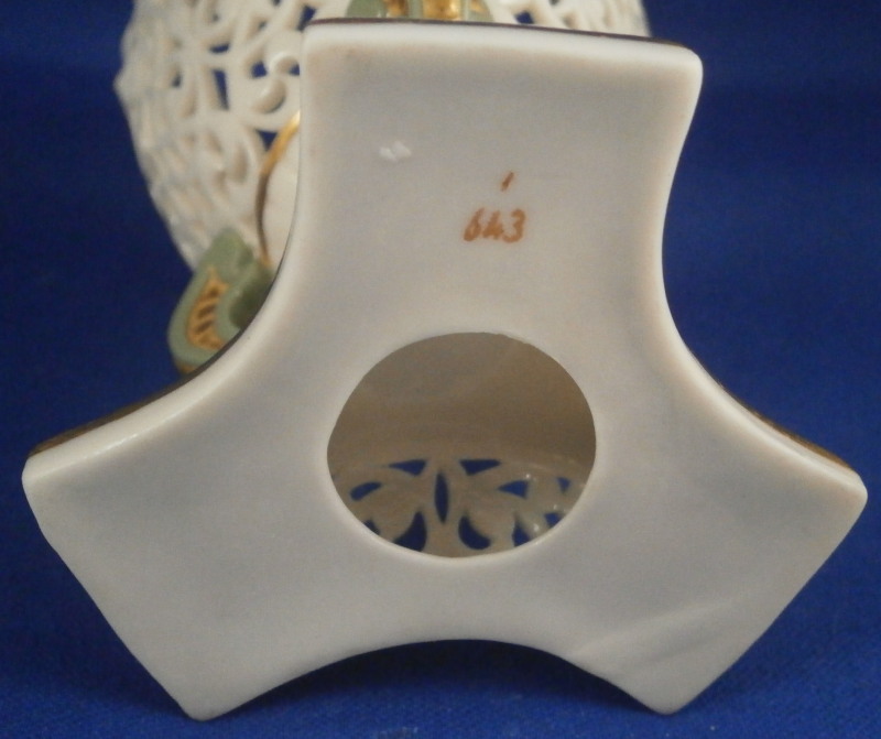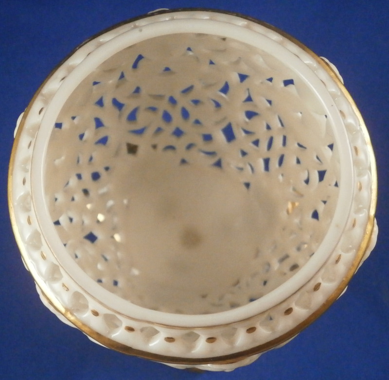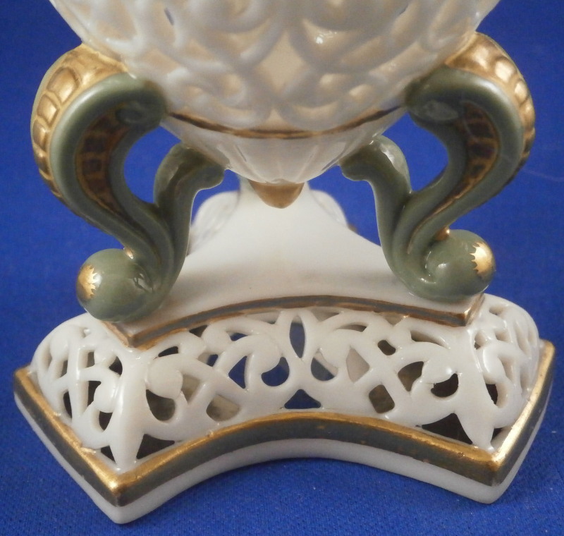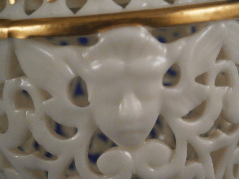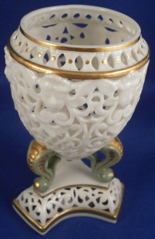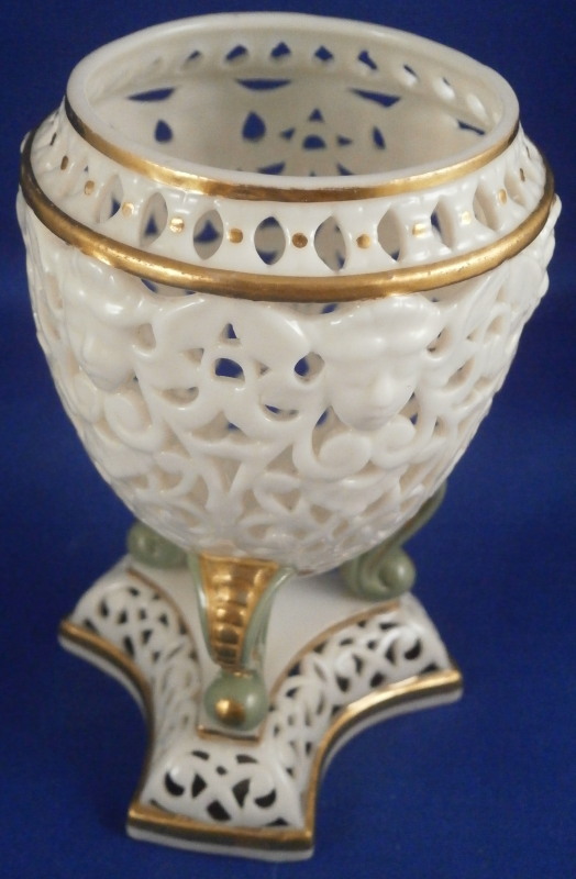 This is a fancy reticulated potpourri dish / vase with its lid made by Worcester in about the mid to later 19th century during the Grainger period. The bottom part is sitting on a triangular shaped base that is also reticulated on three feet that are painted in a greenish color with some nice gilding to them. The main body is superbly reticulated with faces all around and the lid is also well reticulated and very nice. A bit of gold trim to the edges which makes this piece very elegant. The entire dish is so light and thin one has to wonder how it survived in perfect condition! The main piece is marked underneath with some numbers as shown. The vase with the lid in place is 4.5 inches tall and 2.5 inches in diameter. Please email me for more information or other pictures.