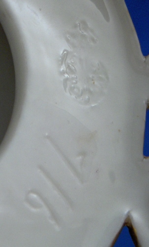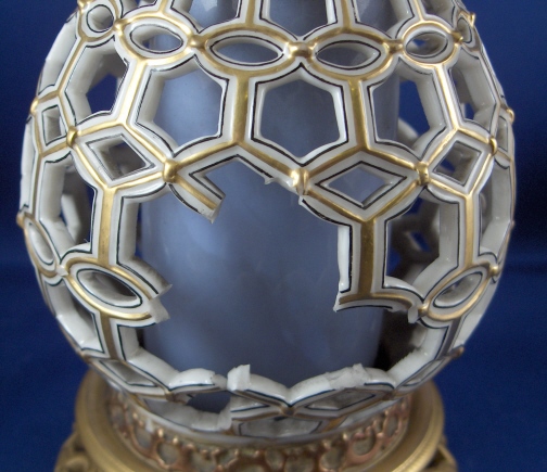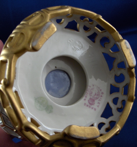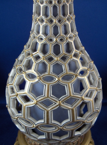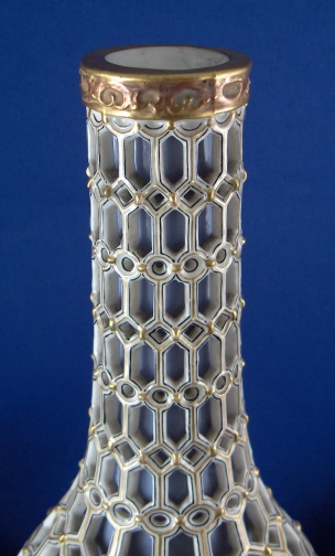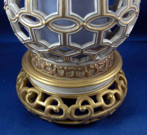 This is an superb vase made by Worcester in the 19th century. It is really a double piece. The outer layer is hand cut into lots of different hexagonals, ovals and squares. These are highlighted in gold and black. The inner part is a normal vase made to hold water that is painted in a light blue. The top and bottom rim has a super design in relief and then there is the base of the vase which is made to look like a separate stand (but is not) which is also reticulated and painted with gold. The vase is in OK condition. It displays nicely but has a large chunk missing from the outer layer on the back side. It also has two or three tiny chips to the outer layer but that is of no importance. The vase is marked underneath with the impressed Worcester stamp as well as one in green and puce. Also incised number 716. The piece is 11 inches tall and 4 inches in diameter. Please email me for more information or other pictures.