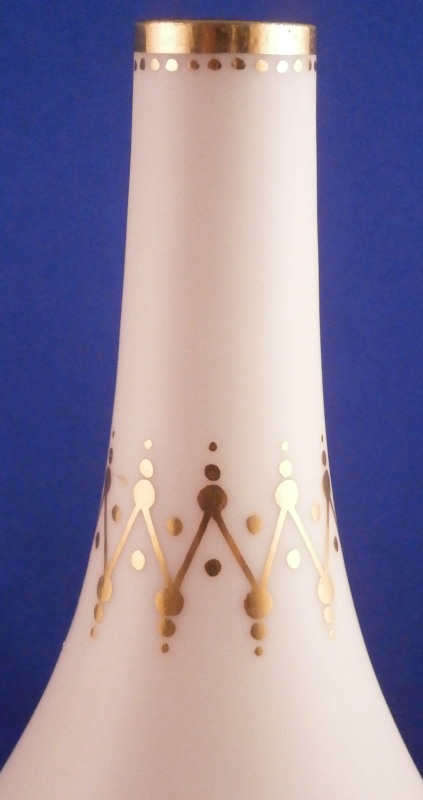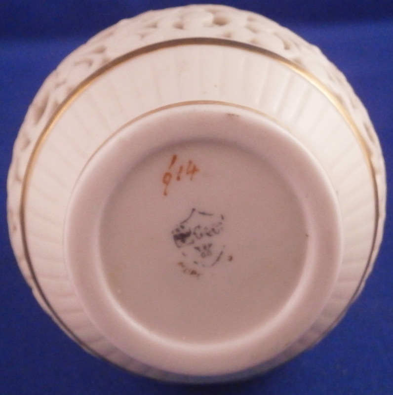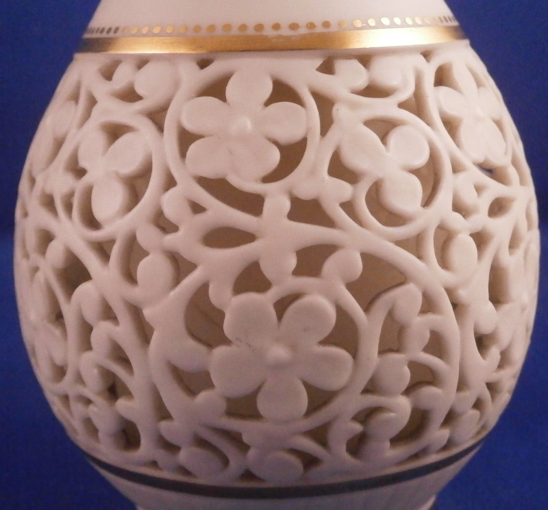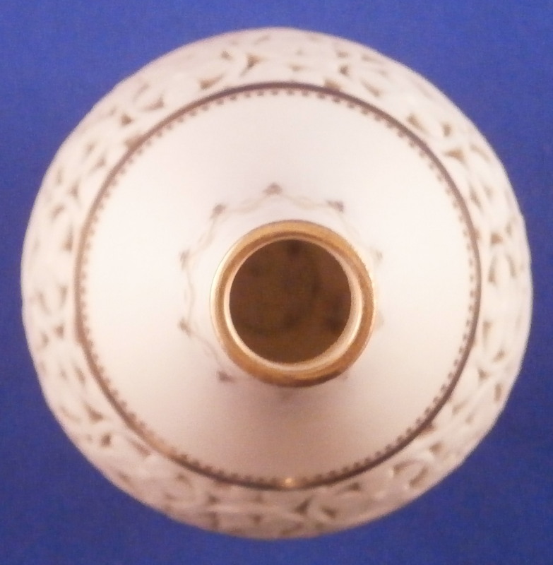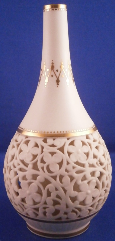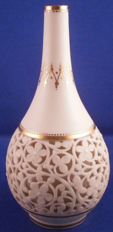 This is an superb double walled reticulated vase made by Grainger Worcester in the late 19th century. One sees their reticulated pieces fairly often but the ones with a solid inner wall are pretty rare. I love them since they look great and can be used around the house as a vase. The outer layer of the vase is hand cut into this fun flowering vine design around the thickest part of the vase with a bit of a nice gold design to thin neck part as well as to the top edge and the top and bottom of the reticulated design. The piece looks very elegant. The vase is in superb condition. The vase is marked underneath with the Grainger and Co Worcester mark as well as some numbers in red as shown. The piece is 5.75 inches tall and 2.875 inches in diameter. Please email me for more information or other pictures.