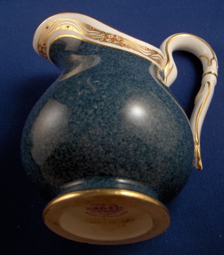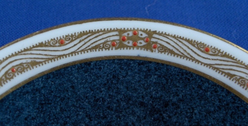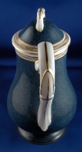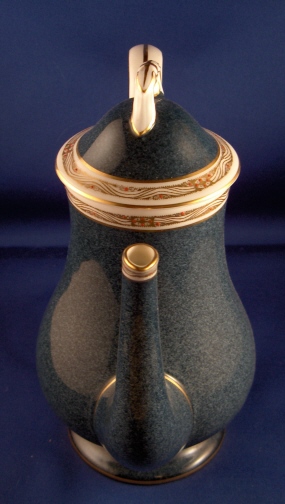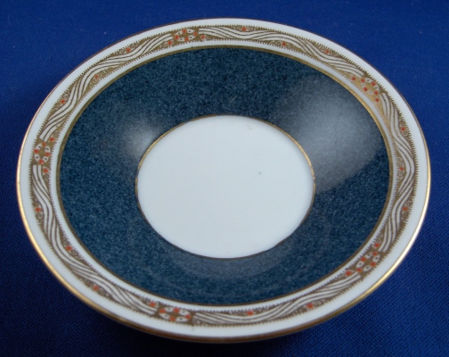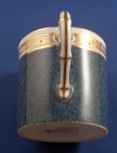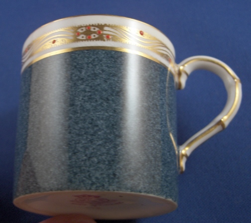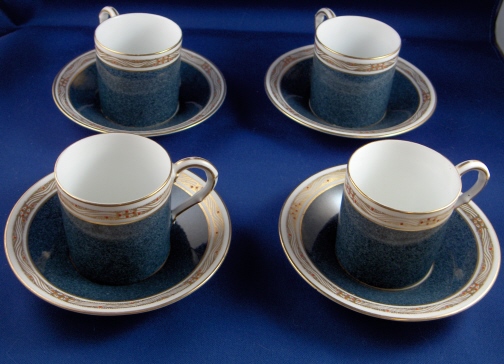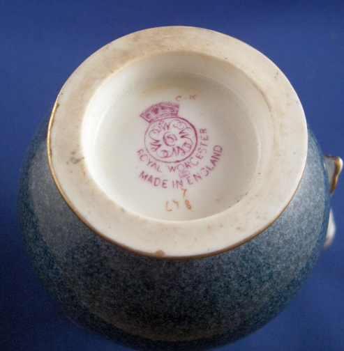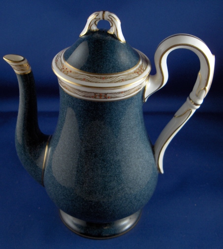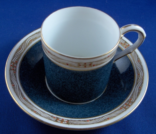 This is a coffee set in the Art Nouveau style made by Worcester in the beginning of the 1900's. There are four cups and saucers, a pot with lid, a creamer and a sugar bowl. They are all decorated with a neat blue background (see pictures since it is hard to describe it) and some gold trim but my favorite part is the Art Nouveau style decoration to the top rims in gold with orange raised enamel dots.The set is in superb condition with some crazing to the white areas and a hairline to the handle of the pot. One cup might have a hairline but I think it's a bit of stained crazing since it's on the bottom going up a bit. A tiny bit of gold wear to the saucer wells and a scratch to the blue background of the creamer. All pieces including the lid are marked with the puce Worcester mark underneath as well as a pattern number in red of 2 over 678, what looks to be a gilders or artist mark of C.K. The Pot is 8 inches tall, 4 inches wide and 6.25 inches deep including the handle and spout. The cups are 2 inches tall and 2 inches in diameter. The saucers are 0.75 inches tall and 4.25 inches in diameter. The creamer is 3.75 inches tall and 2.75 inches in diameter and the sugar is 2.25 inches tall and 3.75 inches in diameter. Please email me for more information or other pictures.