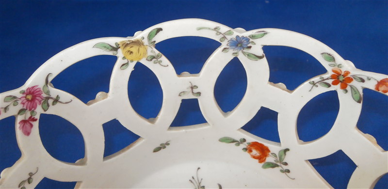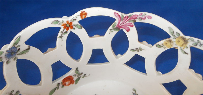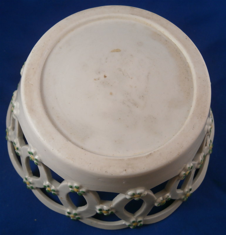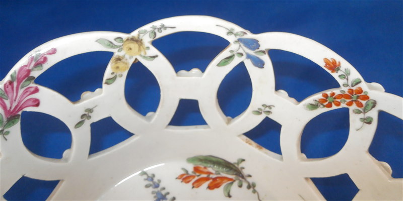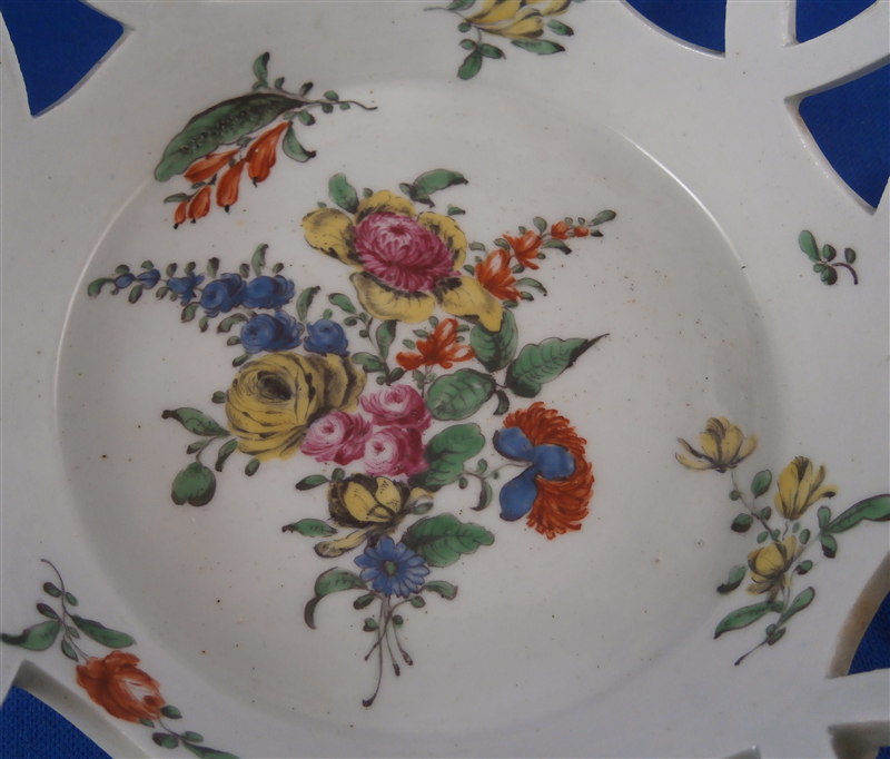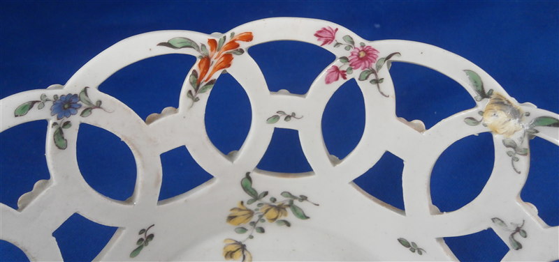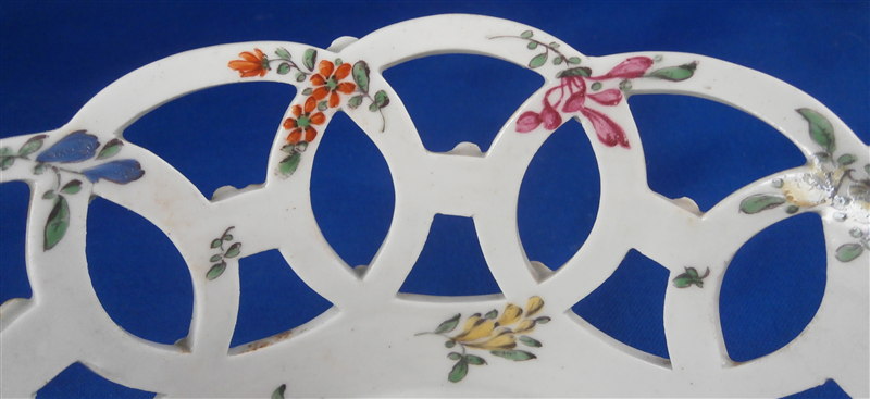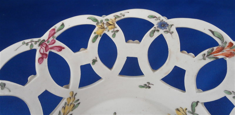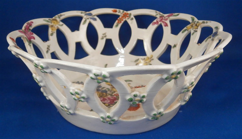 This is a superb reticulated basket made by Worcester around 1770. It is a bit smaller than the other one I own and is handpainted with a large polychrome floral arrangement on the bottom inside with lots of smaller flowers all along the sides and rim. The outside of the basket has applied yellow and green flowers all along the reticulated part. An amazing basket and about as good as it gets from Worcester! The basket is in perfect condition which is amazing! The basket is unmarked underneath which is not unusual at all. It is 2.5 inches tall and has a diameter of 6.625 inches. Please email me for more information or other pictures.