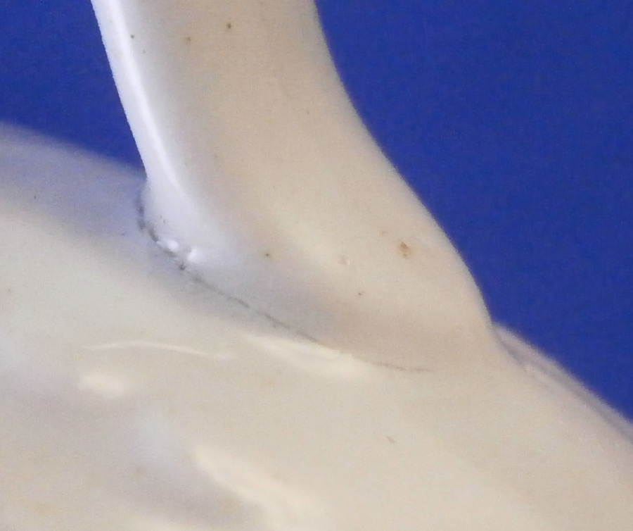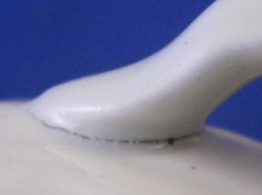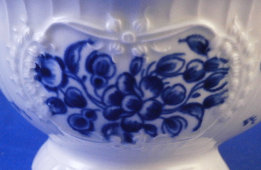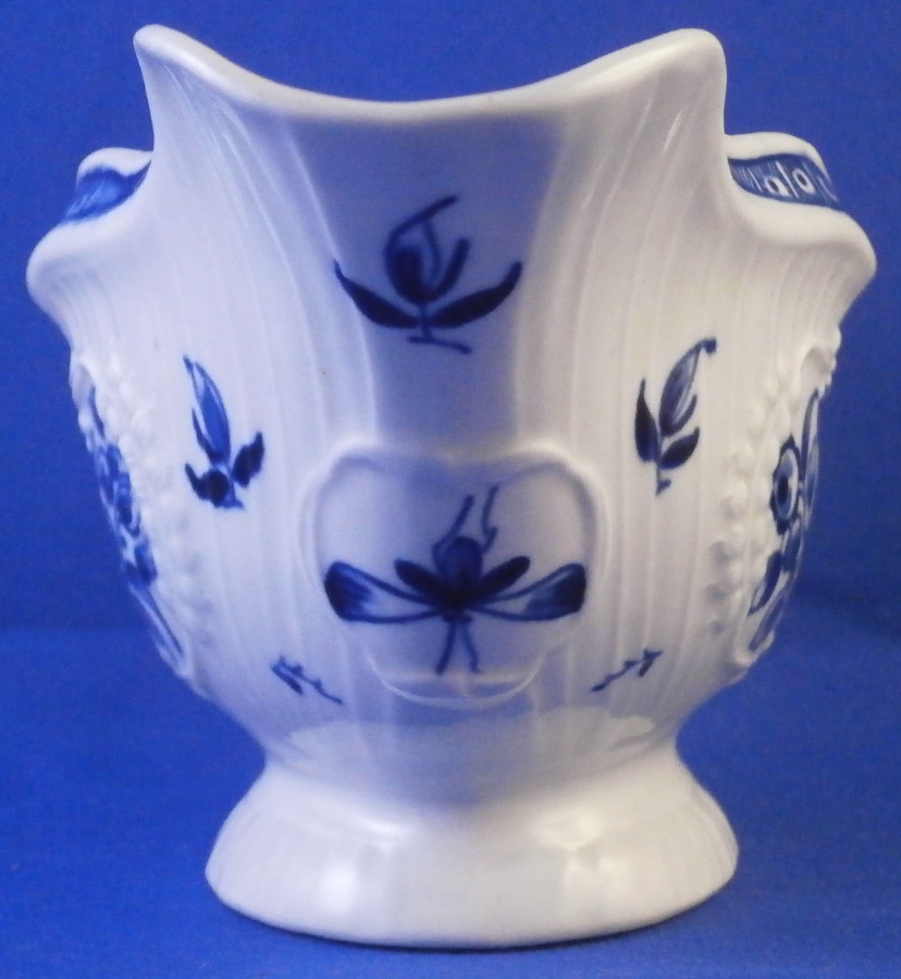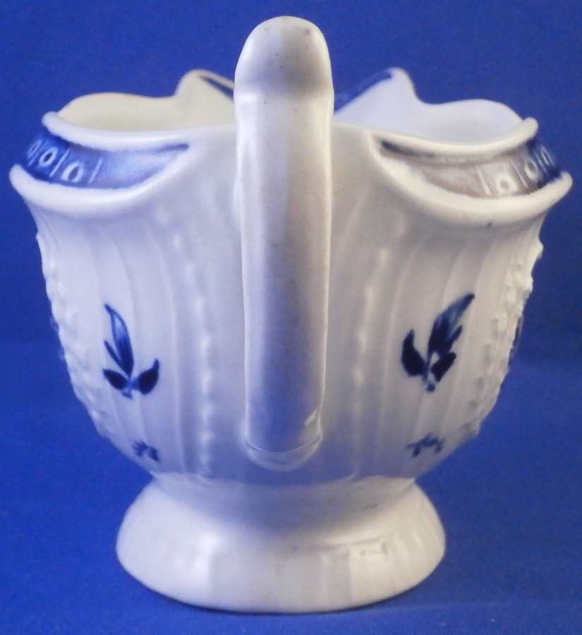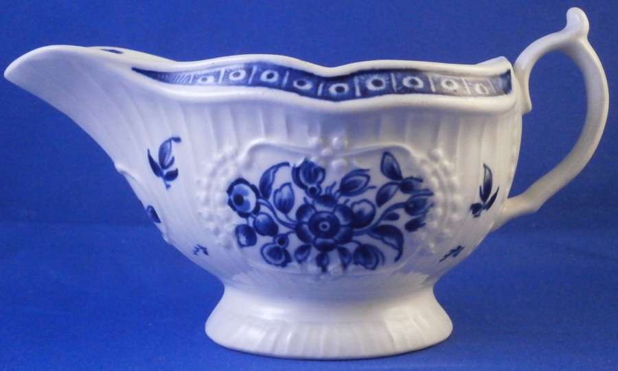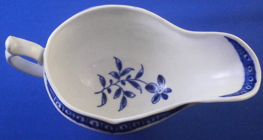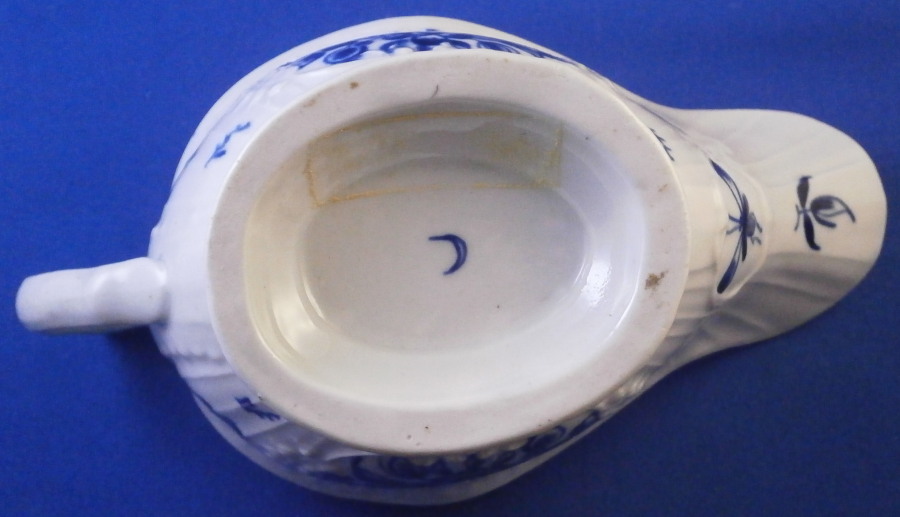This is a nice sauce / gravy boat dish most likely made by Worcester or possibly Caughley in about 1775. It was decorated with a nice floral design to either side as well as some scattered leaves and a bug to the front. Nice relief design to the paste all around and a bit of blue trim to the outside edge. The bottom inside has a flower to it and there is a bit of a blue trim to the inside spout. A really nice looking piece and it is in great condition. Some minor ue marks but no chips, cracks, etc. There is a line to the bottom attachement of the handle but it is fully under the glaze and not an issue at all. It was made that way. The piece displays perfectly and is as nice as they come in terms of condition. The sauceboat is marked underneath as shown with their open crescent mark. The piece is 3.375 inches tall including the handle, 6.25 inches long and 3.5 inches wide. Please email me for more information or other pictures.